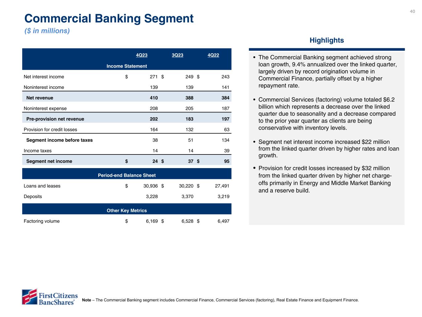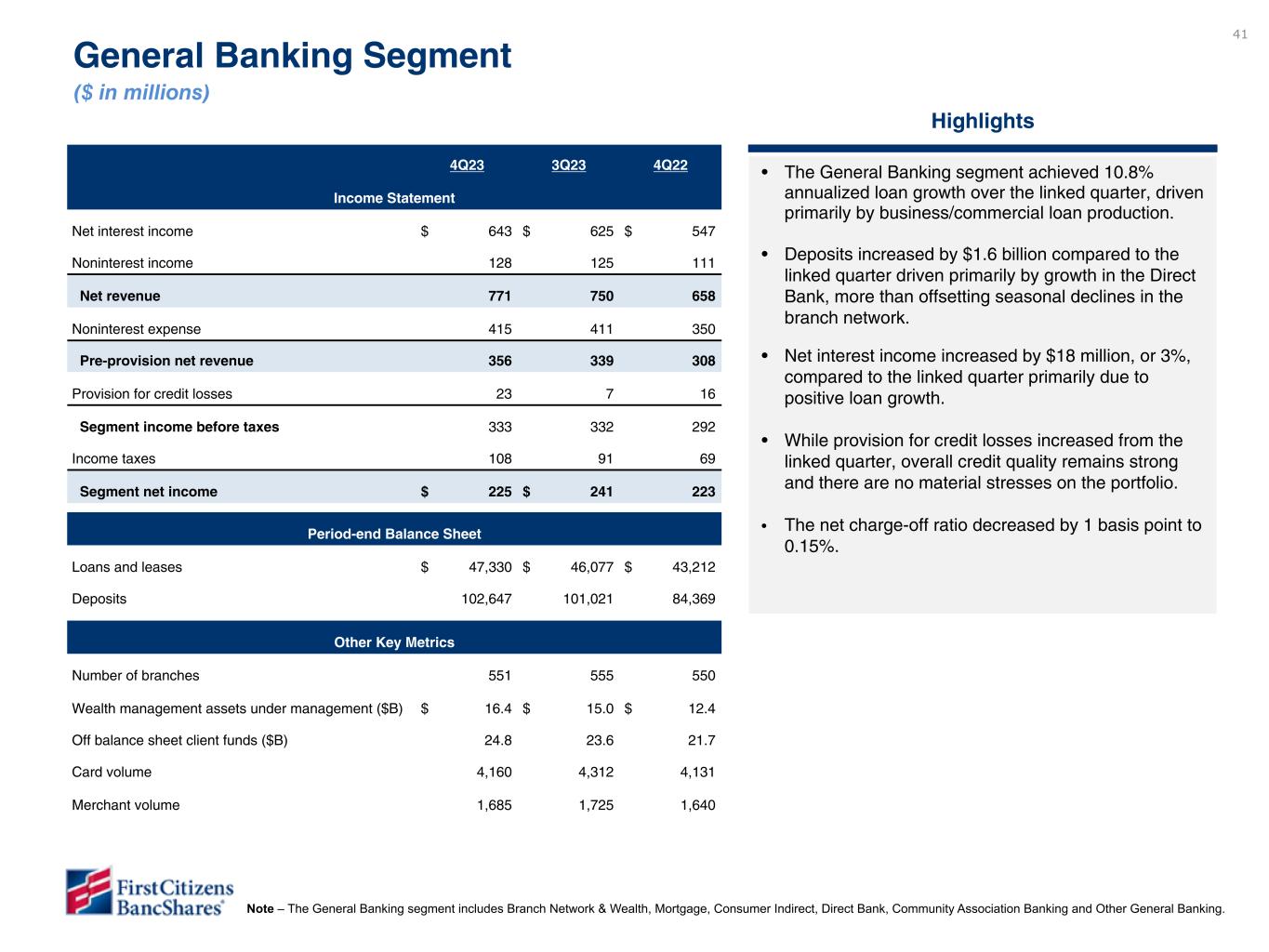 40 Highlights • The Commercial Banking segment achieved strong loan growth, 9.4% annualized over the linked quarter, largely driven by record origination volume in Commercial Finance, partially offset by a higher repayment rate. • Commercial Services (factoring) volume totaled $6.2 billion which represents a decrease over the linked quarter due to seasonality and a decrease compared to the prior year quarter as clients are being conservative with inventory levels. • Segment net interest income increased $22 million from the linked quarter driven by higher rates and loan growth. • Provision for credit losses increased by $32 million from the linked quarter driven by higher net charge- offs primarily in Energy and Middle Market Banking and a reserve build. 4Q23 3Q23 4Q22 Income Statement Net interest income $ 271 $ 249 $ 243 Noninterest income 139 139 141 Net revenue 410 388 384 Noninterest expense 208 205 187 Pre-provision net revenue 202 183 197 Provision for credit losses 164 132 63 Segment income before taxes 38 51 134 Income taxes 14 14 39 Segment net income $ 24 $ 37 $ 95 Period-end Balance Sheet Loans and leases $ 30,936 $ 30,220 $ 27,491 Deposits 3,228 3,370 3,219 Other Key Metrics Factoring volume $ 6,169 $ 6,528 $ 6,497 Commercial Banking Segment ($ in millions) Note – The Commercial Banking segment includes Commercial Finance, Commercial Services (factoring), Real Estate Finance and Equipment Finance.