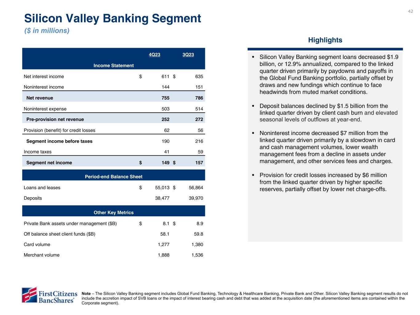 42 Highlights • Silicon Valley Banking segment loans decreased $1.9 billion, or 12.9% annualized, compared to the linked quarter driven primarily by paydowns and payoffs in the Global Fund Banking portfolio, partially offset by draws and new fundings which continue to face headwinds from muted market conditions. • Deposit balances declined by $1.5 billion from the linked quarter driven by client cash burn and elevated seasonal levels of outflows at year-end. • Noninterest income decreased $7 million from the linked quarter driven primarily by a slowdown in card and cash management volumes, lower wealth management fees from a decline in assets under management, and other services fees and charges. • Provision for credit losses increased by $6 million from the linked quarter driven by higher specific reserves, partially offset by lower net charge-offs. 4Q23 3Q23 Income Statement Net interest income $ 611 $ 635 Noninterest income 144 151 Net revenue 755 786 Noninterest expense 503 514 Pre-provision net revenue 252 272 Provision (benefit) for credit losses 62 56 Segment income before taxes 190 216 Income taxes 41 59 Segment net income $ 149 $ 157 Period-end Balance Sheet Loans and leases $ 55,013 $ 56,864 Deposits 38,477 39,970 Other Key Metrics Private Bank assets under management ($B) $ 8.1 $ 8.9 Off balance sheet client funds ($B) 58.1 59.8 Card volume 1,277 1,380 Merchant volume 1,888 1,536 Silicon Valley Banking Segment ($ in millions) Note – Silicon Valley Banking Segment results reflect a full quarter for the 2Q23 reporting period, and only 5 days of financial results for the 1Q23 reporting period, following the 3/27/23 acquisition date. Additionally, there is no provision expense in 1Q23 as this was recorded as part of purchase accounting. Reinstate note during 1Q24 when 1Q23 is shown again Note – The Silicon Valley Banking segment includes Global Fund Banking, Technology & Healthcare Banking, Private Bank and Other. Silicon Valley Banking segment results do not include the accretion impact of SVB loans or the impact of interest bearing cash and debt that was added at the acquisition date (the aforementioned items are contained within the Corporate segment).
