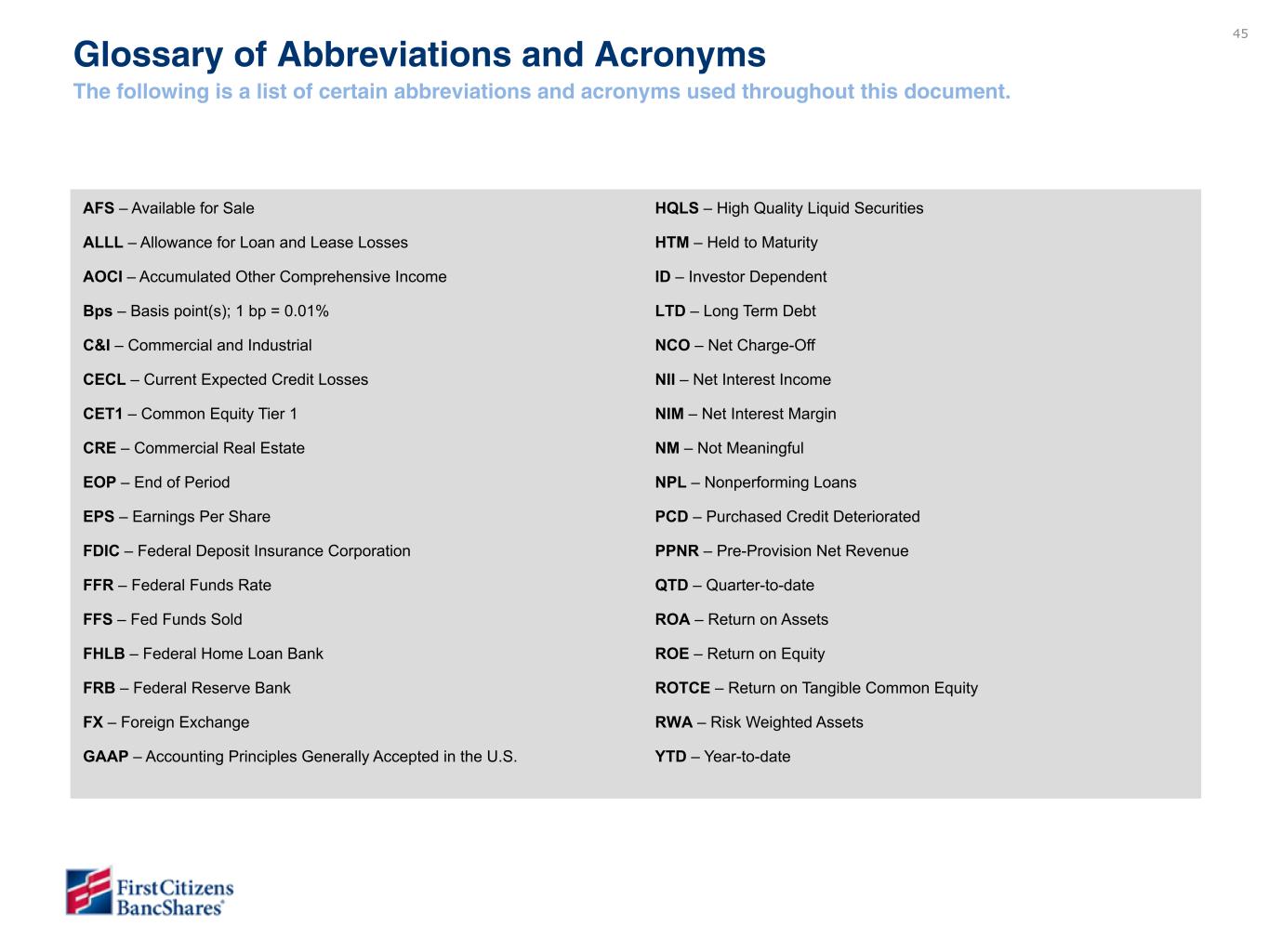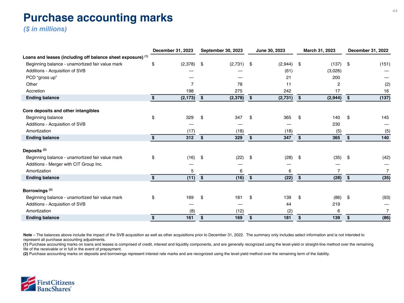 44 December 31, 2023 September 30, 2023 June 30, 2023 March 31, 2023 December 31, 2022 Loans and leases (including off balance sheet exposure) (1) Beginning balance - unamortized fair value mark $ (2,378) $ (2,731) $ (2,944) $ (137) $ (151) Additions - Acquisition of SVB — — (61) (3,026) — PCD “gross up” — — 21 200 — Other 7 78 11 2 (2) Accretion 198 275 242 17 16 Ending balance $ (2,173) $ (2,378) $ (2,731) $ (2,944) $ (137) Core deposits and other intangibles Beginning balance $ 329 $ 347 $ 365 $ 140 $ 145 Additions - Acquisition of SVB — — — 230 — Amortization (17) (18) (18) (5) (5) Ending balance $ 312 $ 329 $ 347 $ 365 $ 140 Deposits (2) Beginning balance - unamortized fair value mark $ (16) $ (22) $ (28) $ (35) $ (42) Additions - Merger with CIT Group Inc. — — — — — Amortization 5 6 6 7 7 Ending balance $ (11) $ (16) $ (22) $ (28) $ (35) Borrowings (2) Beginning balance - unamortized fair value mark $ 169 $ 181 $ 139 $ (86) $ (93) Additions - Acquisition of SVB — — 44 219 — Amortization (8) (12) (2) 6 7 Ending balance $ 161 $ 169 $ 181 $ 139 $ (86) Note – The balances above include the impact of the SVB acquisition as well as other acquisitions prior to December 31, 2022. The summary only includes select information and is not intended to represent all purchase accounting adjustments. (1) Purchase accounting marks on loans and leases is comprised of credit, interest and liquidity components, and are generally recognized using the level-yield or straight-line method over the remaining life of the receivable or in full in the event of prepayment. (2) Purchase accounting marks on deposits and borrowings represent interest rate marks and are recognized using the level-yield method over the remaining term of the liability. Purchase accounting marks ($ in millions)