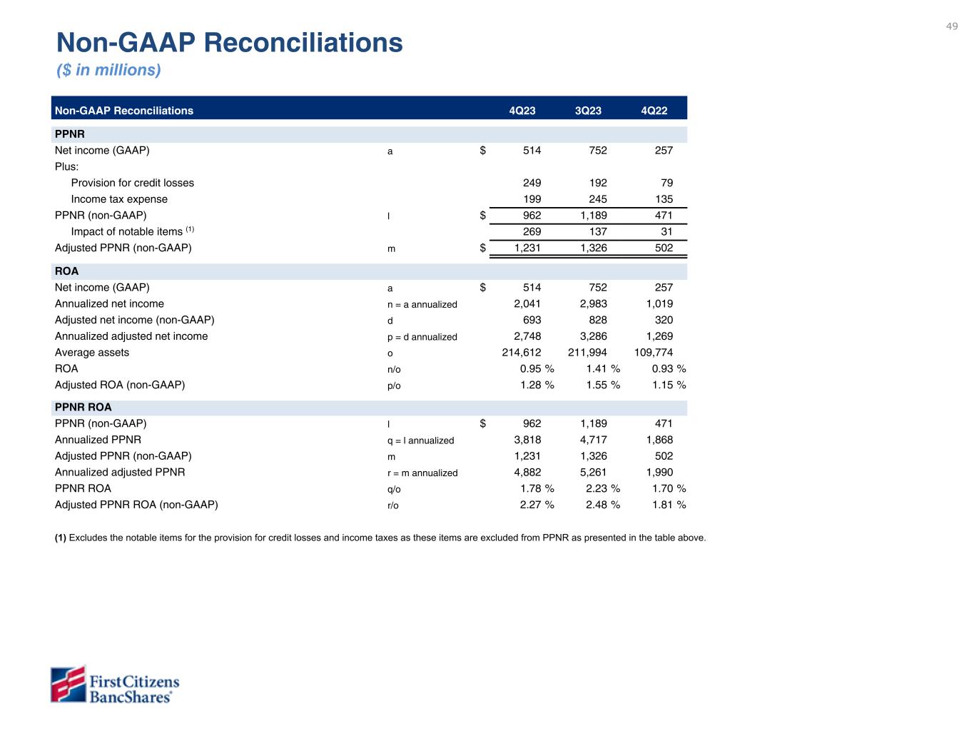 48 Non-GAAP Reconciliations 4Q23 3Q23 4Q22 Net income and EPS Net income (GAAP) a $ 514 752 257 Preferred stock dividends 15 15 14 Net income available to common stockholders (GAAP) b 499 737 243 Total notable items, after income tax c 179 76 63 Adjusted net income (non-GAAP) d = (a+c) 693 828 320 Adjusted net income available to common stockholders (non-GAAP) e = (b+c) $ 678 813 306 Weighted average common shares outstanding Basic f 14,528,447 14,528,310 14,590,387 Diluted g 14,539,838 14,539,133 14,607,426 EPS (GAAP) Basic b/f $ 34.36 50.71 16.69 Diluted b/g 34.33 50.67 16.67 Adjusted EPS (non-GAAP) Basic e/f $ 46.62 55.96 20.97 Diluted e/g 46.58 55.92 20.94 Noninterest income and expense Noninterest income h $ 543 615 429 Impact of notable items, before income tax (88) (147) (139) Adjusted noninterest income (non-GAAP) i $ 455 468 290 Noninterest expense j $ 1,492 1,416 760 Impact of notable items, before income tax (357) (284) (170) Adjusted noninterest expense (non-GAAP) k $ 1,135 1,132 590 Provision for credit losses $ 249 192 79 Plus: Benefit for credit losses on investment securities AFS — 3 — Adjusted provision for credit losses (non-GAAP) $ 249 195 79 Non-GAAP Reconciliations ($ in millions, except share and per share data)