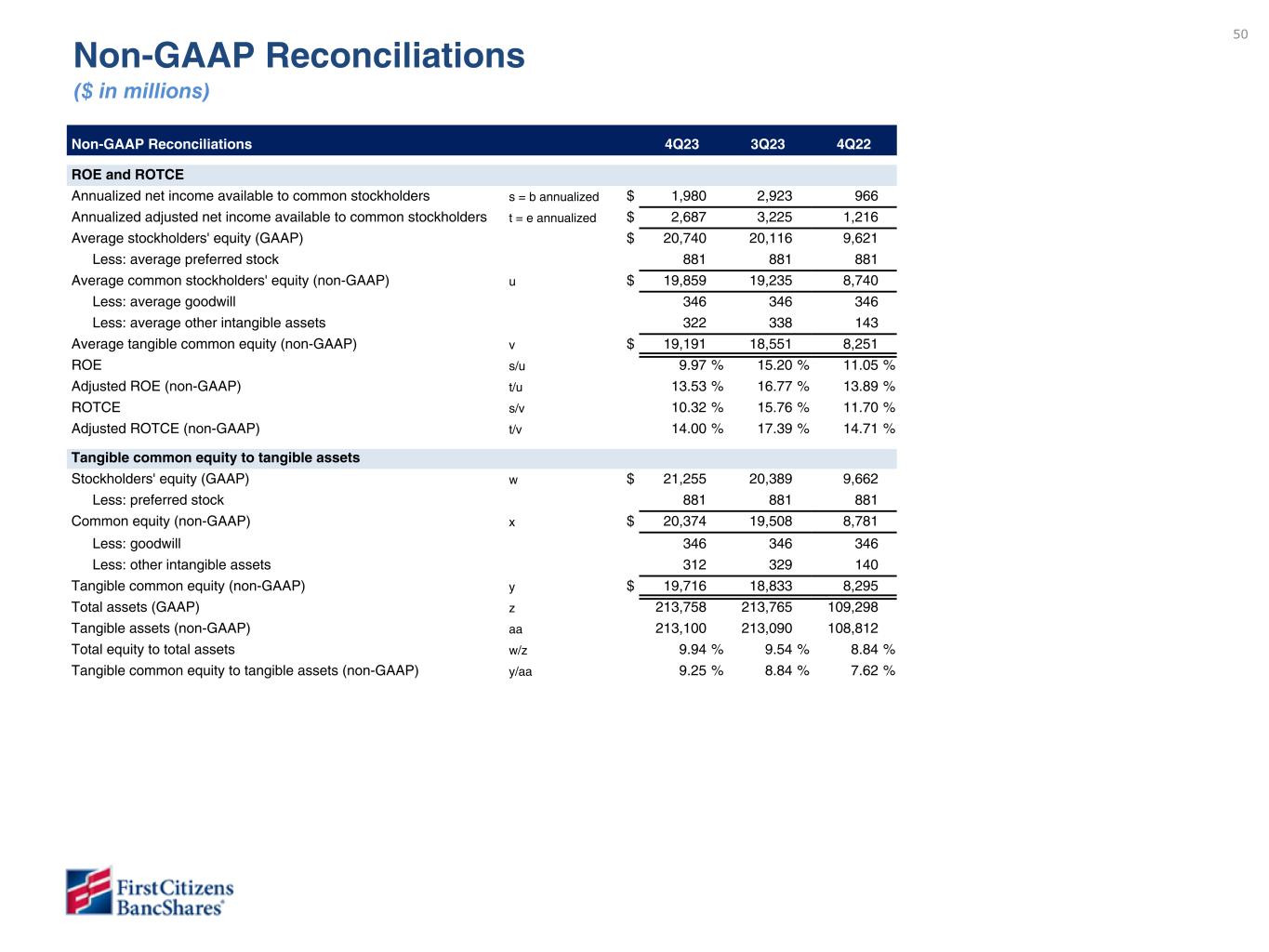 49 Non-GAAP Reconciliations ($ in millions) Non-GAAP Reconciliations 4Q23 3Q23 4Q22 PPNR Net income (GAAP) a $ 514 752 257 Plus: Provision for credit losses 249 192 79 Income tax expense 199 245 135 PPNR (non-GAAP) l $ 962 1,189 471 Impact of notable items (1) 269 137 31 Adjusted PPNR (non-GAAP) m $ 1,231 1,326 502 ROA Net income (GAAP) a $ 514 752 257 Annualized net income n = a annualized 2,041 2,983 1,019 Adjusted net income (non-GAAP) d 693 828 320 Annualized adjusted net income p = d annualized 2,748 3,286 1,269 Average assets o 214,612 211,994 109,774 ROA n/o 0.95 % 1.41 % 0.93 % Adjusted ROA (non-GAAP) p/o 1.28 % 1.55 % 1.15 % PPNR ROA PPNR (non-GAAP) l $ 962 1,189 471 Annualized PPNR q = l annualized 3,818 4,717 1,868 Adjusted PPNR (non-GAAP) m 1,231 1,326 502 Annualized adjusted PPNR r = m annualized 4,882 5,261 1,990 PPNR ROA q/o 1.78 % 2.23 % 1.70 % Adjusted PPNR ROA (non-GAAP) r/o 2.27 % 2.48 % 1.81 % (1) Excludes the notable items for the provision for credit losses and income taxes as these items are excluded from PPNR as presented in the table above.