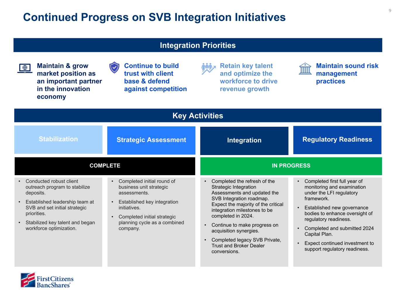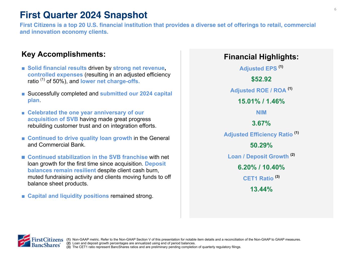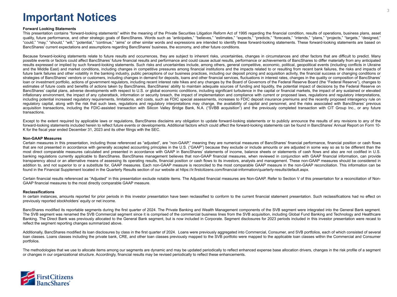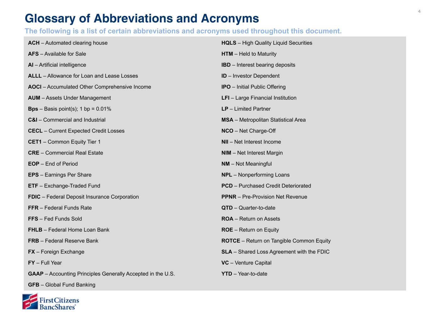 3 Forward Looking Statements This presentation contains “forward-looking statements” within the meaning of the Private Securities Litigation Reform Act of 1995 regarding the financial condition, results of operations, business plans, asset quality, future performance, and other strategic goals of BancShares. Words such as “anticipates,” “believes,” “estimates,” “expects,” “predicts,” “forecasts,” “intends,” “plans,” “projects,” “targets,” “designed,” “could,” “may,” “should,” “will,” “potential,” “continue,” “aims” or other similar words and expressions are intended to identify these forward-looking statements. These forward-looking statements are based on BancShares’ current expectations and assumptions regarding BancShares’ business, the economy, and other future conditions. Because forward-looking statements relate to future results and occurrences, they are subject to inherent risks, uncertainties, changes in circumstances and other factors that are difficult to predict. Many possible events or factors could affect BancShares’ future financial results and performance and could cause actual results, performance or achievements of BancShares to differ materially from any anticipated results expressed or implied by such forward-looking statements. Such risks and uncertainties include, among others, general competitive, economic, political, geopolitical events (including conflicts in Ukraine and the Middle East) and market conditions, including changes in competitive pressures among financial institutions and the impacts related to or resulting from recent bank failures, the risks and impacts of future bank failures and other volatility in the banking industry, public perceptions of our business practices, including our deposit pricing and acquisition activity, the financial success or changing conditions or strategies of BancShares’ vendors or customers, including changes in demand for deposits, loans and other financial services, fluctuations in interest rates, changes in the quality or composition of BancShares’ loan or investment portfolio, actions of government regulators, including recent interest rate hikes and any changes by the Board of Governors of the Federal Reserve Board (the “Federal Reserve”), changes to estimates of future costs and benefits of actions taken by BancShares, BancShares’ ability to maintain adequate sources of funding and liquidity, the potential impact of decisions by the Federal Reserve on BancShares’ capital plans, adverse developments with respect to U.S. or global economic conditions, including significant turbulence in the capital or financial markets, the impact of any sustained or elevated inflationary environment, the impact of any cyberattack, information or security breach, the impact of implementation and compliance with current or proposed laws, regulations and regulatory interpretations, including potential increased regulatory requirements, limitations, and costs, such as FDIC special assessments, increases to FDIC deposit insurance premiums and the recently proposed interagency rule on regulatory capital, along with the risk that such laws, regulations and regulatory interpretations may change, the availability of capital and personnel, and the risks associated with BancShares’ previous acquisition transactions, including the FDIC-assisted transaction with Silicon Valley Bridge Bank, N.A. (“SVBB acquisition”) and the previously completed transaction with CIT Group Inc., or any future transactions. Except to the extent required by applicable laws or regulations, BancShares disclaims any obligation to update forward-looking statements or to publicly announce the results of any revisions to any of the forward-looking statements included herein to reflect future events or developments. Additional factors which could affect the forward-looking statements can be found in BancShares’ Annual Report on Form 10- K for the fiscal year ended December 31, 2023 and its other filings with the SEC. Non-GAAP Measures Certain measures in this presentation, including those referenced as “adjusted”, are “non-GAAP,” meaning they are numerical measures of BancShares’ financial performance, financial position or cash flows that are not presented in accordance with generally accepted accounting principles in the U.S. (“GAAP”) because they exclude or include amounts or are adjusted in some way so as to be different than the most direct comparable measures calculated and presented in accordance with GAAP in BancShares’ statements of income, balance sheets or statements of cash flows and also are not codified in U.S. banking regulations currently applicable to BancShares. BancShares management believes that non-GAAP financial measures, when reviewed in conjunction with GAAP financial information, can provide transparency about or an alternative means of assessing its operating results, financial position or cash flows to its investors, analysts and management. These non-GAAP measures should be considered in addition to, and not superior to or a substitute for, GAAP measures. Each non-GAAP measure is reconciled to the most comparable GAAP measure in the non-GAAP reconciliation. This information can be found in the Financial Supplement located in the Quarterly Results section of our website at https://ir.firstcitizens.com/financial-information/quarterly-results/default.aspx. Certain financial results referenced as “Adjusted” in this presentation exclude notable items. The Adjusted financial measures are Non-GAAP. Refer to Section V of this presentation for a reconciliation of Non- GAAP financial measures to the most directly comparable GAAP measure. Reclassifications In certain instances, amounts reported for prior periods in this investor presentation have been reclassified to conform to the current financial statement presentation. Such reclassifica