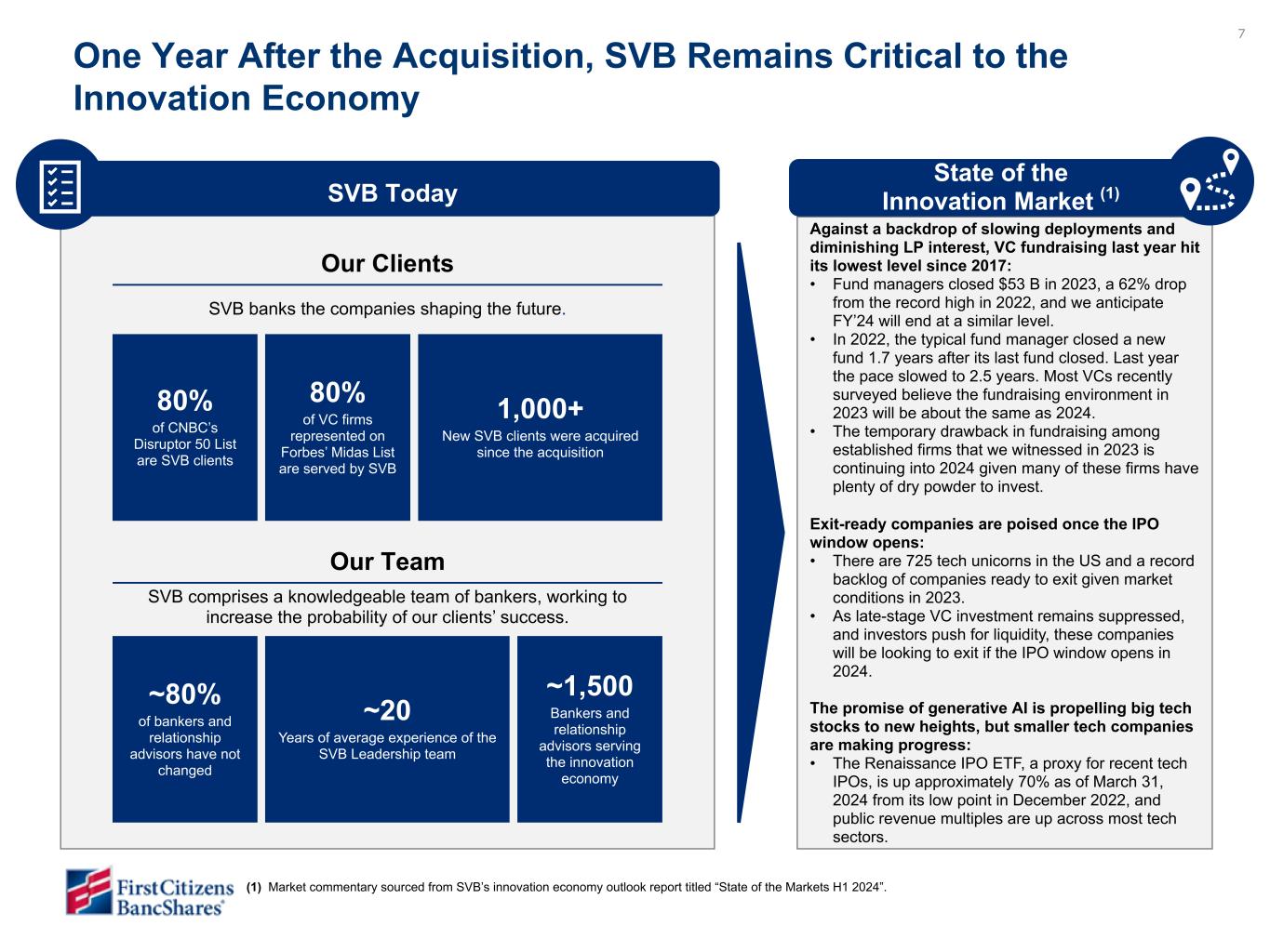 6 First Quarter 2024 Snapshot First Citizens is a top 20 U.S. financial institution that provides a diverse set of offerings to retail, commercial and innovation economy clients. Key Accomplishments: ■ Solid financial results driven by strong net revenue, controlled expenses (resulting in an adjusted efficiency ratio (1) of 50%), and lower net charge-offs. ■ Successfully completed and submitted our 2024 capital plan. ■ Celebrated the one year anniversary of our acquisition of SVB having made great progress rebuilding customer trust and on integration efforts. ■ Continued to drive quality loan growth in the General and Commercial Bank. ■ Continued stabilization in the SVB franchise with net loan growth for the first time since acquisition. Deposit balances remain resilient despite client cash burn, muted fundraising activity and clients moving funds to off balance sheet products. ■ Capital and liquidity positions remained strong. Financial Highlights: Adjusted EPS (1) $52.92 Adjusted ROE / ROA (1) 15.01% / 1.46% NIM 3.67% Adjusted Efficiency Ratio (1) 50.29% Loan / Deposit Growth (2) 6.20% / 10.40% CET1 Ratio (3) 13.44% (1) Non-GAAP metric. Refer to the Non-GAAP Section V of this presentation for notable item details and a reconciliation of the Non-GAAP to GAAP measures. (2) Loan and deposit growth percentages are annualized using end of period balances. (3) The CET1 ratio represent BancShares ratios and are preliminary pending completion of quarterly regulatory filings.