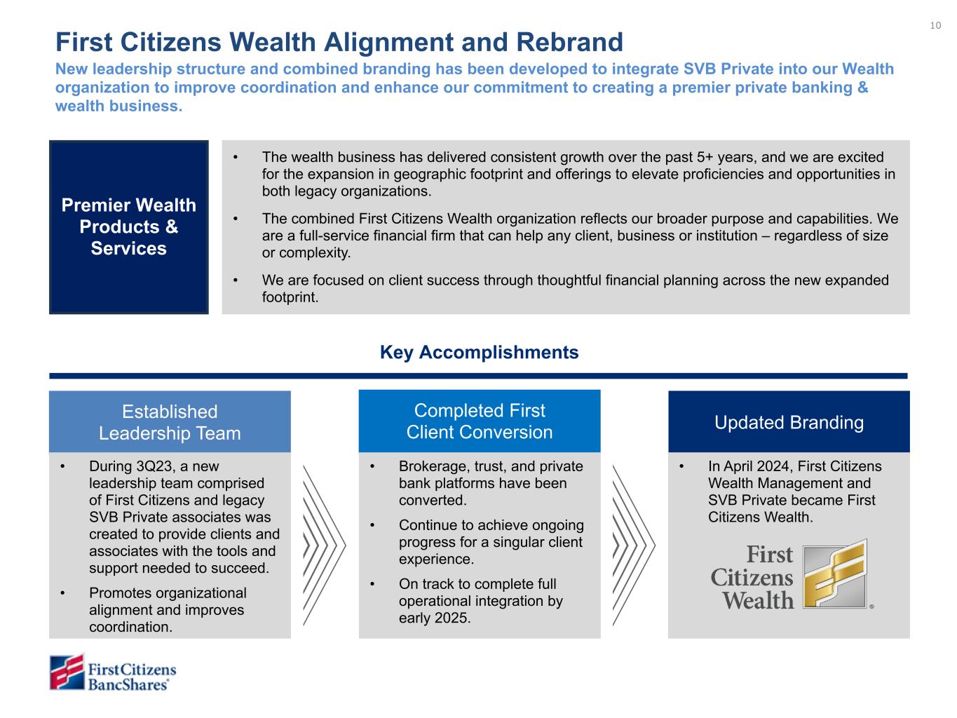 9 • Completed first full year of monitoring and examination under the LFI regulatory framework. • Established new governance bodies to enhance oversight of regulatory readiness. • Completed and submitted 2024 Capital Plan. • Expect continued investment to support regulatory readiness. Regulatory Readiness Key Activities 1 2 3Maintain & grow market position as an important partner in the innovation economy Continue to build trust with client base & defend against competition Retain key talent and optimize the workforce to drive revenue growth Integration Priorities • Conducted robust client outreach program to stabilize deposits. • Established leadership team at SVB and set initial strategic priorities. • Stabilized key talent and began workforce optimization. Stabilization Strategic Assessment • Completed initial round of business unit strategic assessments. • Established key integration initiatives. • Completed initial strategic planning cycle as a combined company. • Completed the refresh of the Strategic Integration Assessments and updated the SVB Integration roadmap. Expect the majority of the critical integration milestones to be completed in 2024. • Continue to make progress on acquisition synergies. • Completed legacy SVB Private, Trust and Broker Dealer conversions. Integration IN PROGRESS Maintain sound risk management practices COMPLETE Continued Progress on SVB Integration Initiatives