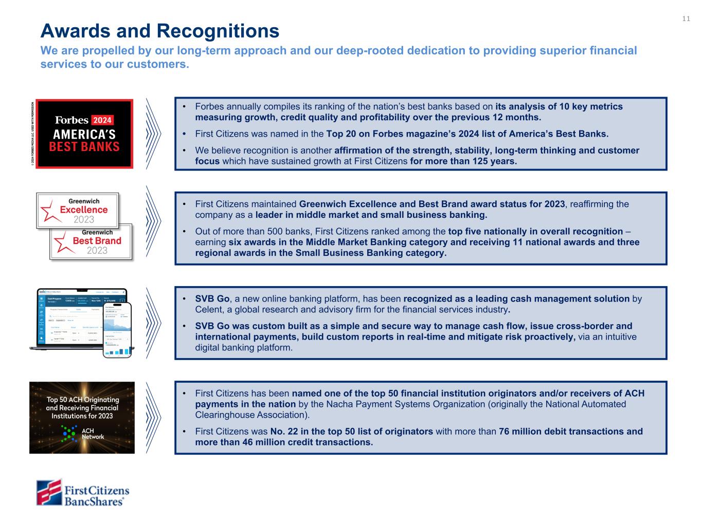 10 Premier Wealth Products & Services • The wealth business has delivered consistent growth over the past 5+ years, and we are excited for the expansion in geographic footprint and offerings to elevate proficiencies and opportunities in both legacy organizations. • The combined First Citizens Wealth organization reflects our broader purpose and capabilities. We are a full-service financial firm that can help any client, business or institution – regardless of size or complexity. • We are focused on client success through thoughtful financial planning across the new expanded footprint. Established Leadership Team Key Accomplishments Completed First Client Conversion Updated Branding • During 3Q23, a new leadership team comprised of First Citizens and legacy SVB Private associates was created to provide clients and associates with the tools and support needed to succeed. • Promotes organizational alignment and improves coordination. • Brokerage, trust, and private bank platforms have been converted. • Continue to achieve ongoing progress for a singular client experience. • On track to complete full operational integration by early 2025. • In April 2024, First Citizens Wealth Management and SVB Private became First Citizens Wealth. First Citizens Wealth Alignment and Rebrand New leadership structure and combined branding has been developed to integrate SVB Private into our Wealth organization to improve coordination and enhance our commitment to creating a premier private banking & wealth business.