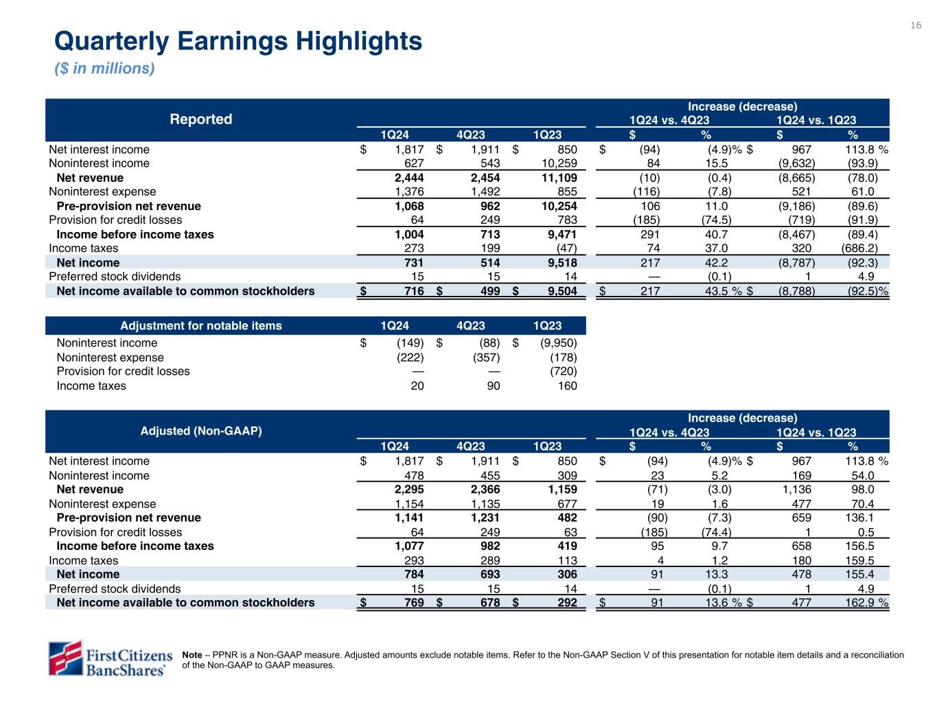 14 1Q24 Financial Results - Takeaways Quarter-to-date Year-to-date Mar 23 Dec 22 Mar 22 Mar 23 Dec 21 EPS $ 16.67 $ 20.94 $ 19.25 $ 20.77 $ 12.09 $ 12.82 $ 67.40 $ 77.24 $ 53.88 $ 51.88 ROE 11.05 % 13.89 % 12.49 % 13.47 % 10.96 % 11.63 % 11.15 % 12.78 % 12.84 % 12.36 % ROTCE 11.70 % 14.71 % 13.17 % 14.20 % 12.00 % 12.72 % 11.78 % 13.50 % 14.12 % 13.60 % ROA 0.93 % 1.15 % 1.16 % 1.24 % 1.20 % 1.09 % 1.01 % 1.15 % 1.33 % 1.10 % PPNR ROA 1.70 % 1.81 % 1.72 % 1.86 % 1.33 % 1.17 % 1.84 % 1.64 % 1.41 % 1.11 % NIM 3.36 % 3.36 % 3.40 % 3.40 % 2.56 % 2.56 % 3.14 % 3.14 % 2.55 % 2.55 % Net charge-off ratio 0.14 % 0.14 % 0.10 % 0.10 % 0.04 % 0.04 % 0.12 % 0.12 % 0.08 % 0.08 % Efficiency ratio 61.74 % 54.08 % 61.91 % 53.32 % 65.40 % 62.51 % 60.50 % 56.40 % 64.43 % 64.34 % Reported Adjusted (Non-GAAP) Reported Adjusted (Non-GAAP) Reported Adjusted (Non-GAAP) Reported Adjusted (Non-GAAP) Reported Adjusted (Non-GAAP) PPNR exceeded expectations on strong net revenue and controlled expenses. 1 While NII and NIM declined during the quarter, as anticipated, both were in line with our forecast. 2 While the pace of IPOs remains muted, recent issuances are encouraging despite fundraising pressures which continue to be a headwind for loan and deposit growth in the SVB Commercial segment. 6 Remained well-positioned to meet our capital priorities, and the proposed future capital requirements. 7 Deposits grew $3.8 billion from the linked quarter due to growth in the General Bank segment and in the Direct Bank. 5 NCOs declined 22 basis points and were favorable to our forecast.3 Loan growth was strong in the General and Commercial Bank segments and we achieved loan growth for the first time since acquisition in the SVB Commercial segment. 4 Continued to refine and mature our regulatory capabilities to meet heightened expectations for First Citizens’ new size and complexity. 8
