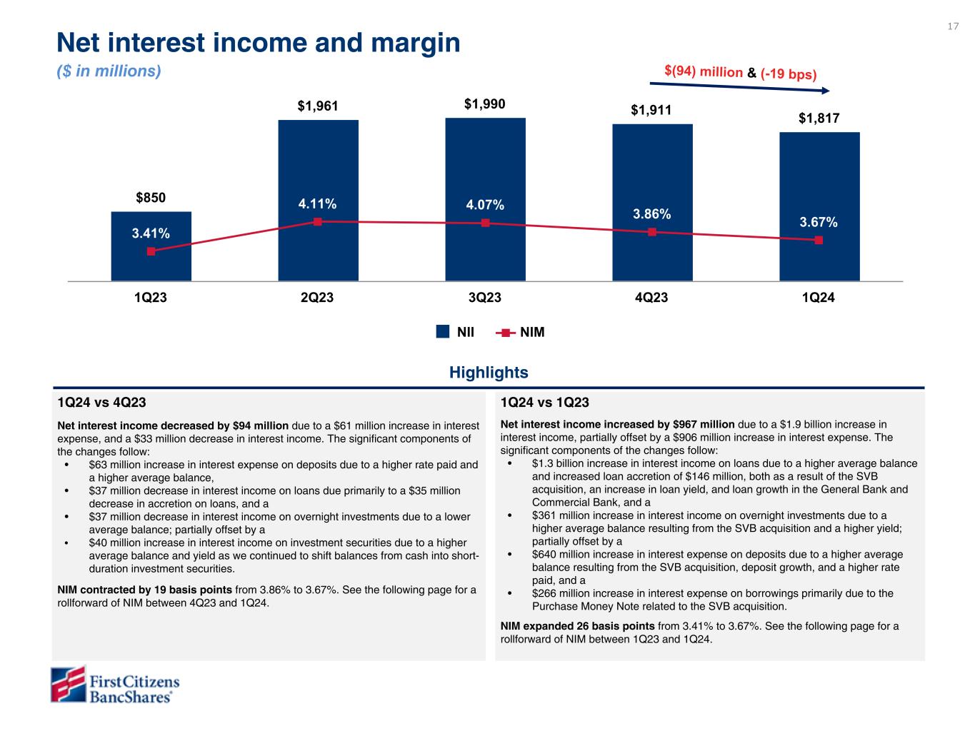 16 Reported Increase (decrease) 1Q24 vs. 4Q23 1Q24 vs. 1Q23 1Q24 4Q23 1Q23 $ % $ % Net interest income $ 1,817 $ 1,911 $ 850 $ (94) (4.9) % $ 967 113.8 % Noninterest income 627 543 10,259 84 15.5 (9,632) (93.9) Net revenue 2,444 2,454 11,109 (10) (0.4) (8,665) (78.0) Noninterest expense 1,376 1,492 855 (116) (7.8) 521 61.0 Pre-provision net revenue 1,068 962 10,254 106 11.0 (9,186) (89.6) Provision for credit losses 64 249 783 (185) (74.5) (719) (91.9) Income before income taxes 1,004 713 9,471 291 40.7 (8,467) (89.4) Income taxes 273 199 (47) 74 37.0 320 (686.2) Net income 731 514 9,518 217 42.2 (8,787) (92.3) Preferred stock dividends 15 15 14 — (0.1) 1 4.9 Net income available to common stockholders $ 716 $ 499 $ 9,504 $ 217 43.5 % $ (8,788) (92.5) % Adjustment for notable items 1Q24 4Q23 1Q23 Noninterest income $ (149) $ (88) $ (9,950) Noninterest expense (222) (357) (178) Provision for credit losses — — (720) Income taxes 20 90 160 Adjusted (Non-GAAP) Increase (decrease) 1Q24 vs. 4Q23 1Q24 vs. 1Q23 1Q24 4Q23 1Q23 $ % $ % Net interest income $ 1,817 $ 1,911 $ 850 $ (94) (4.9) % $ 967 113.8 % Noninterest income 478 455 309 23 5.2 169 54.0 Net revenue 2,295 2,366 1,159 (71) (3.0) 1,136 98.0 Noninterest expense 1,154 1,135 677 19 1.6 477 70.4 Pre-provision net revenue 1,141 1,231 482 (90) (7.3) 659 136.1 Provision for credit losses 64 249 63 (185) (74.4) 1 0.5 Income before income taxes 1,077 982 419 95 9.7 658 156.5 Income taxes 293 289 113 4 1.2 180 159.5 Net income 784 693 306 91 13.3 478 155.4 Preferred stock dividends 15 15 14 — (0.1) 1 4.9 Net income available to common stockholders $ 769 $ 678 $ 292 $ 91 13.6 % $ 477 162.9 % Quarterly Earnings Highlights ($ in millions) Note – PPNR is a Non-GAAP measure. Adjusted amounts exclude notable items. Refer to the Non-GAAP Section V of this presentation for notable item details and a reconciliation of the Non-GAAP to GAAP measures.