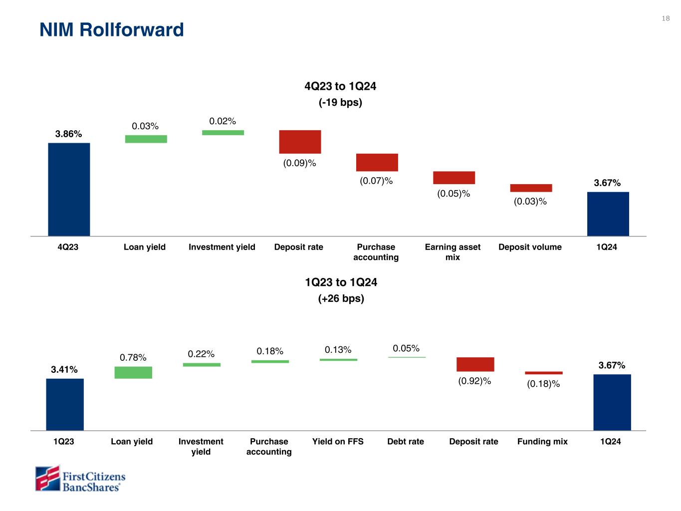 17 $850 $1,961 $1,990 $1,911 $1,817 3.41% 4.11% 4.07% 3.86% 3.67% NII NIM 1Q23 2Q23 3Q23 4Q23 1Q24 $2,441 $2,946 2.55% 3.14% YTD Dec 21 YTD Dec 22 1Q24 vs 4Q23 Net interest income decreased by $94 million due to a $61 million increase in interest expense, and a $33 million decrease in interest income. The significant components of the changes follow: • $63 million increase in interest expense on deposits due to a higher rate paid and a higher average balance, • $37 million decrease in interest income on loans due primarily to a $35 million decrease in accretion on loans, and a • $37 million decrease in interest income on overnight investments due to a lower average balance; partially offset by a • $40 million increase in interest income on investment securities due to a higher average balance and yield as we continued to shift balances from cash into short- duration investment securities. NIM contracted by 19 basis points from 3.86% to 3.67%. See the following page for a rollforward of NIM between 4Q23 and 1Q24. YTD December 2022 vs YTD December 2021 Net interest income increased by $505 million due to a $483 million increase in interest income and a $22 million decrease in interest expense. The change in net interest income was primarily due to the following: ◦ $256 million increase on interest income on loans due to a higher yield and growth offset by lower SBA- PPP interest and fee income and lower accretion income, ◦ $138 million increase in interest income on investment securities due to higher yield and average balance, ◦ $118 million decline in interest expense on borrowings due to a lower rate and average balance, ◦ $89 million increase in interest income on overnight investments due to a higher yield despite a lower average balance; partially offset by a ◦ $96 million increase in interest expense on deposits due to a higher rate paid. NIM expanded from 2.55% to 3.14%. $505 million & 59 bps Highlights $(94) million & (-19 bps) 1Q24 vs 1Q23 Net interest income increased by $967 million due to a $1.9 billion increase in interest income, partially offset by a $906 million increase in interest expense. The significant components of the changes follow: • $1.3 billion increase in interest income on loans due to a higher average balance and increased loan accretion of $146 million, both as a result of the SVB acquisition, an increase in loan yield, and loan growth in the General Bank and Commercial Bank, and a • $361 million increase in interest income on overnight investments due to a higher average balance resulting from the SVB acquisition and a higher yield; partially offset by a • $640 million increase in interest expense on deposits due to a higher average balance resulting from the SVB acquisition, deposit growth, and a higher rate paid, and a • $266 million increase in interest expense on borrowings primarily due to the Purchase Money Note related to the SVB acquisition. NIM expanded 26 basis points from 3.41% to 3.67%. See the following page for a rollforward of NIM between 1Q23 and 1Q24. Net interest income and margin ($ in millions)