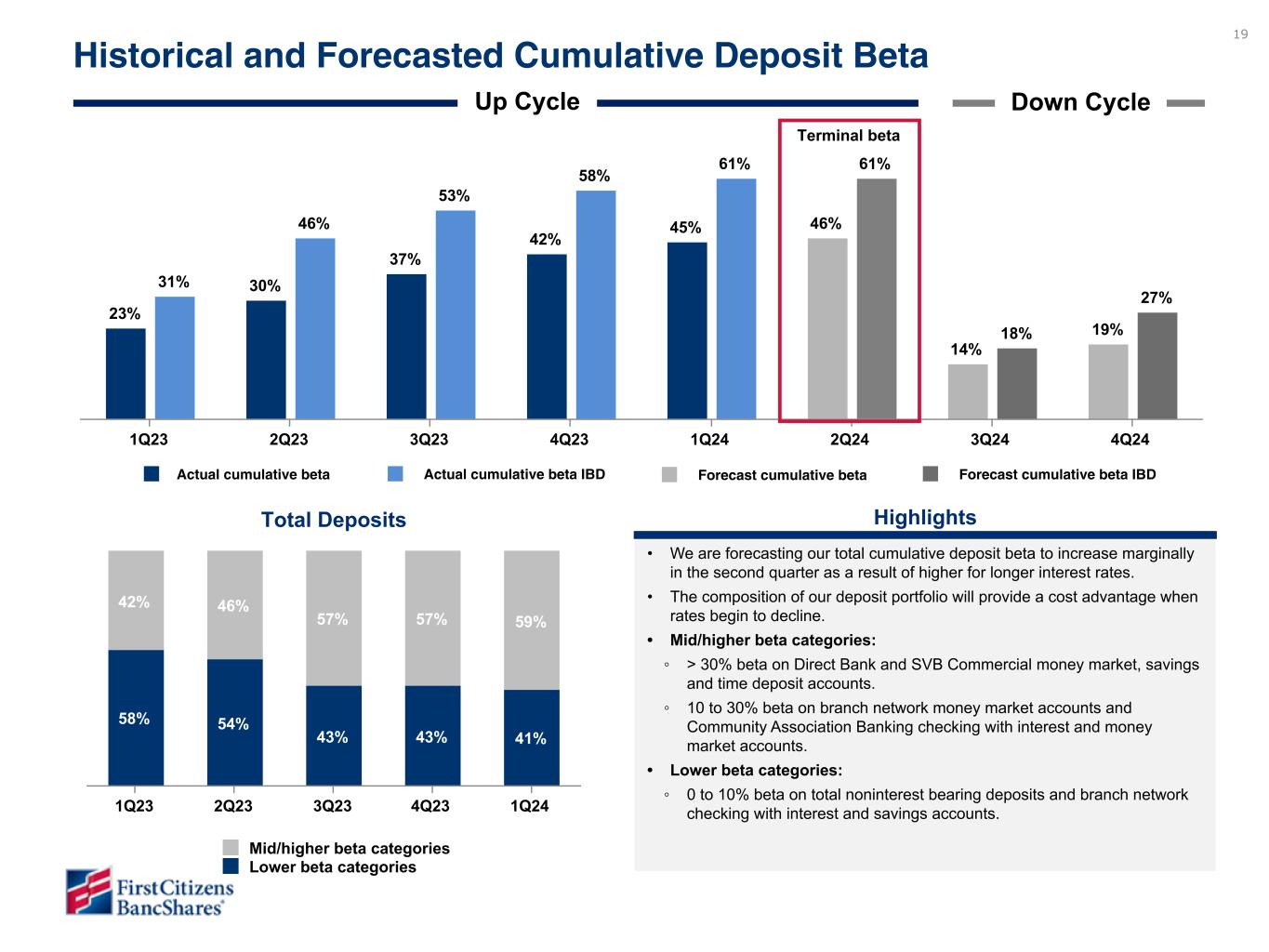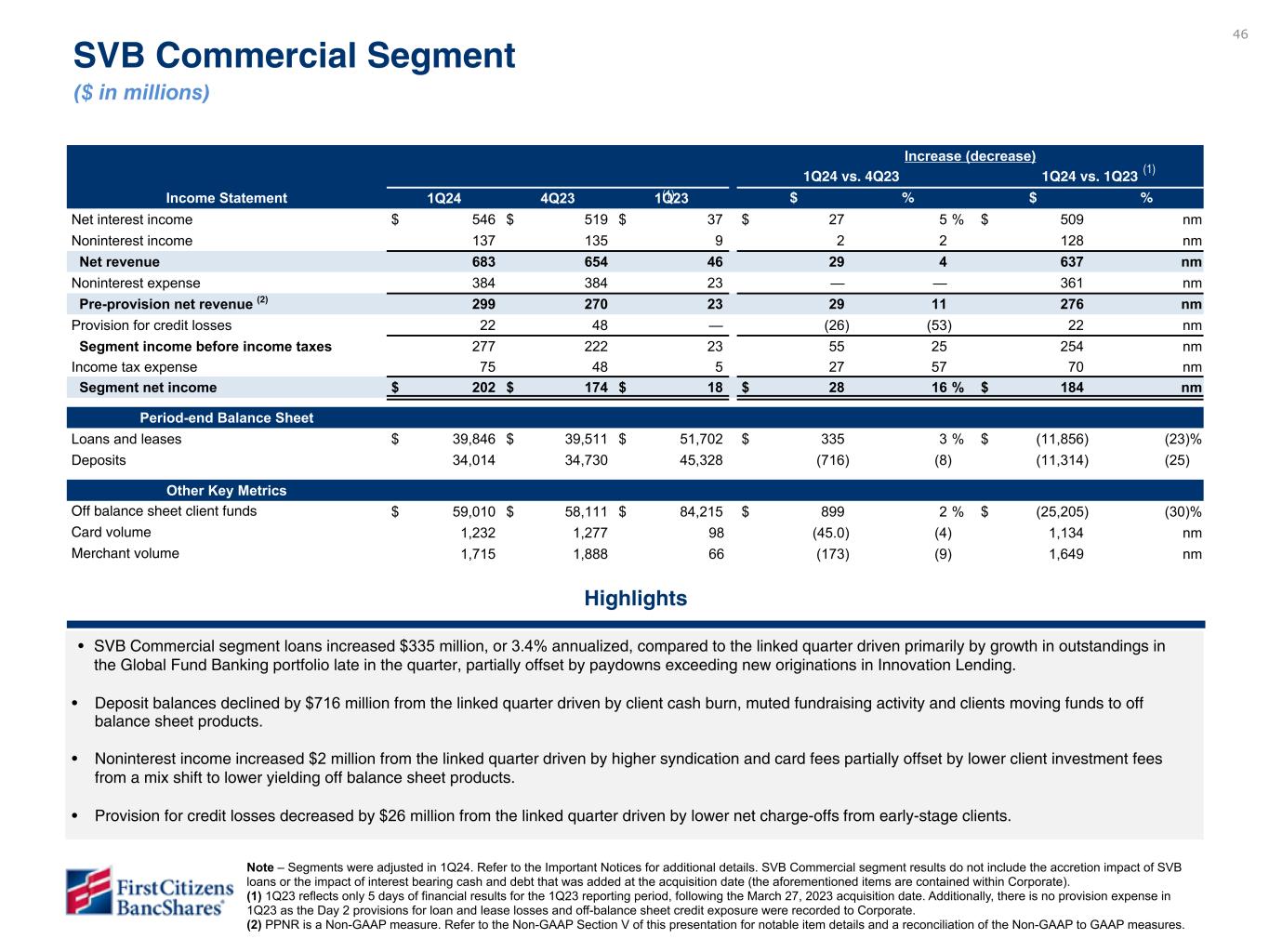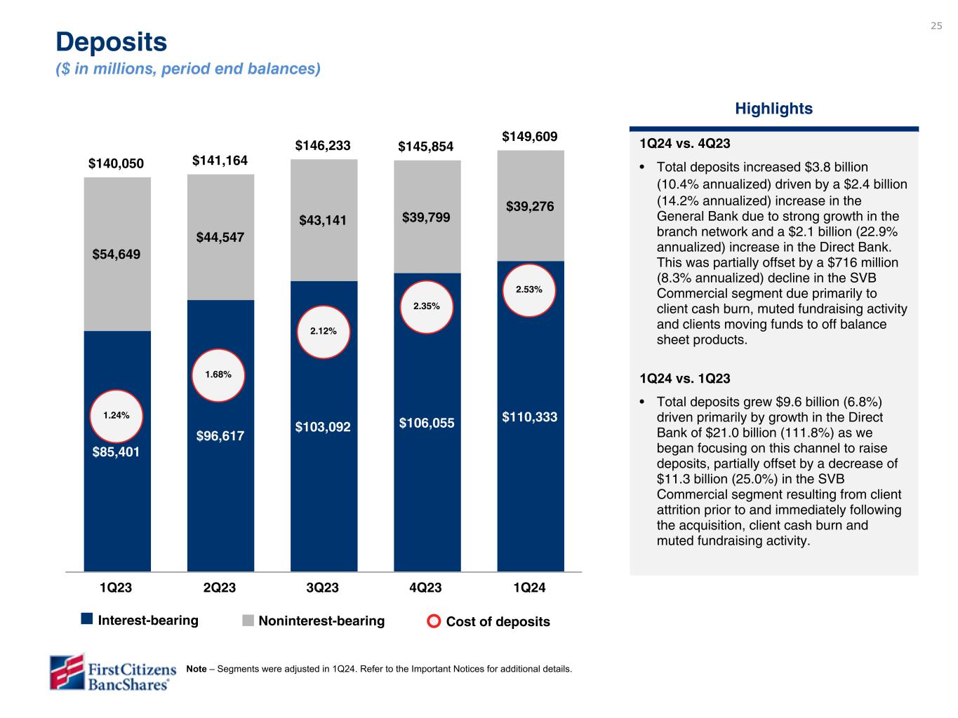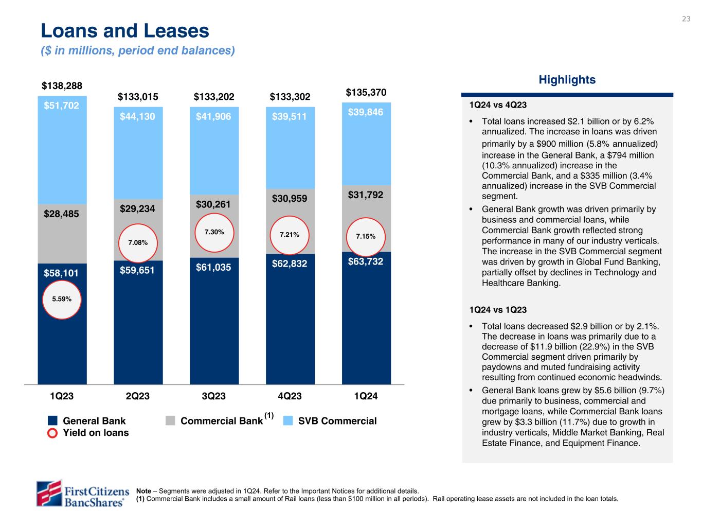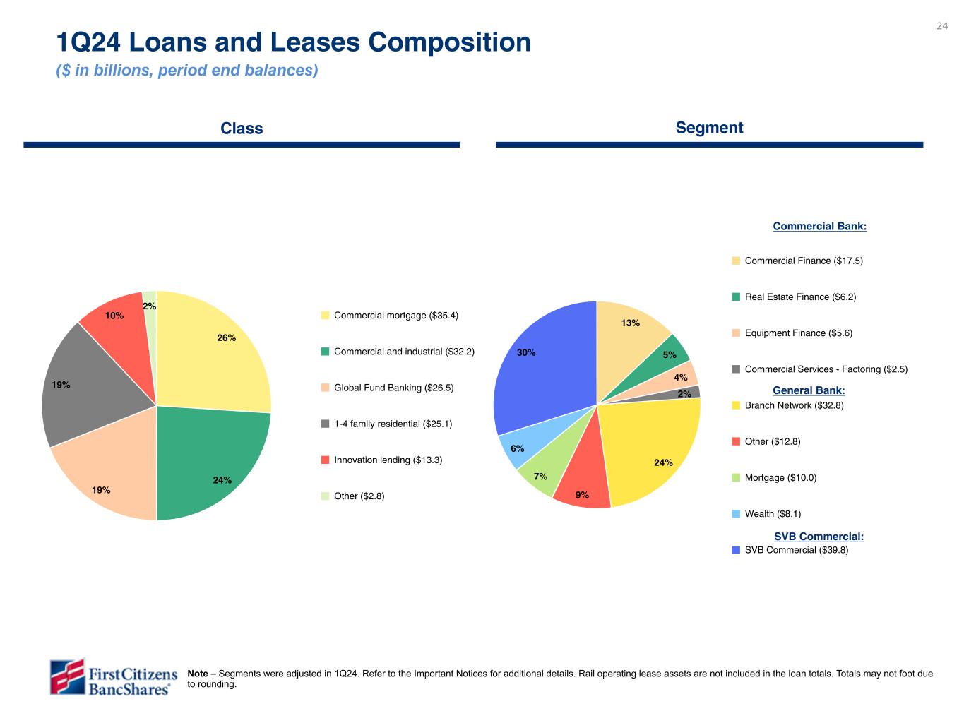 23 $138,288 $133,015 $133,202 $133,302 $135,370 $58,101 $59,651 $61,035 $62,832 $63,732 $28,485 $29,234 $30,261 $30,959 $31,792 $51,702 $44,130 $41,906 $39,511 $39,846 General Bank Commercial Bank SVB Commercial Yield on loans 1Q23 2Q23 3Q23 4Q23 1Q24 Highlights 1Q24 vs 4Q23 • Total loans increased $2.1 billion or by 6.2% annualized. The increase in loans was driven primarily by a $900 million (5.8% annualized) increase in the General Bank, a $794 million (10.3% annualized) increase in the Commercial Bank, and a $335 million (3.4% annualized) increase in the SVB Commercial segment. • General Bank growth was driven primarily by business and commercial loans, while Commercial Bank growth reflected strong performance in many of our industry verticals. The increase in the SVB Commercial segment was driven by growth in Global Fund Banking, partially offset by declines in Technology and Healthcare Banking. 1Q24 vs 1Q23 • Total loans decreased $2.9 billion or by 2.1%. The decrease in loans was primarily due to a decrease of $11.9 billion (22.9%) in the SVB Commercial segment driven primarily by paydowns and muted fundraising activity resulting from continued economic headwinds. • General Bank loans grew by $5.6 billion (9.7%) due primarily to business, commercial and mortgage loans, while Commercial Bank loans grew by $3.3 billion (11.7%) due to growth in industry verticals, Middle Market Banking, Real Estate Finance, and Equipment Finance. Loans and Leases ($ in millions, period end balances) 7.21%7.30% 7.08% 5.59% 7.15% 10.1% (1) Note – Segments were adjusted in 1Q24. Refer to the Important Notices for additional details. (1) Commercial Bank includes a small amount of Rail loans (less than $100 million in all periods). Rail operating lease assets are not included in the loan totals.