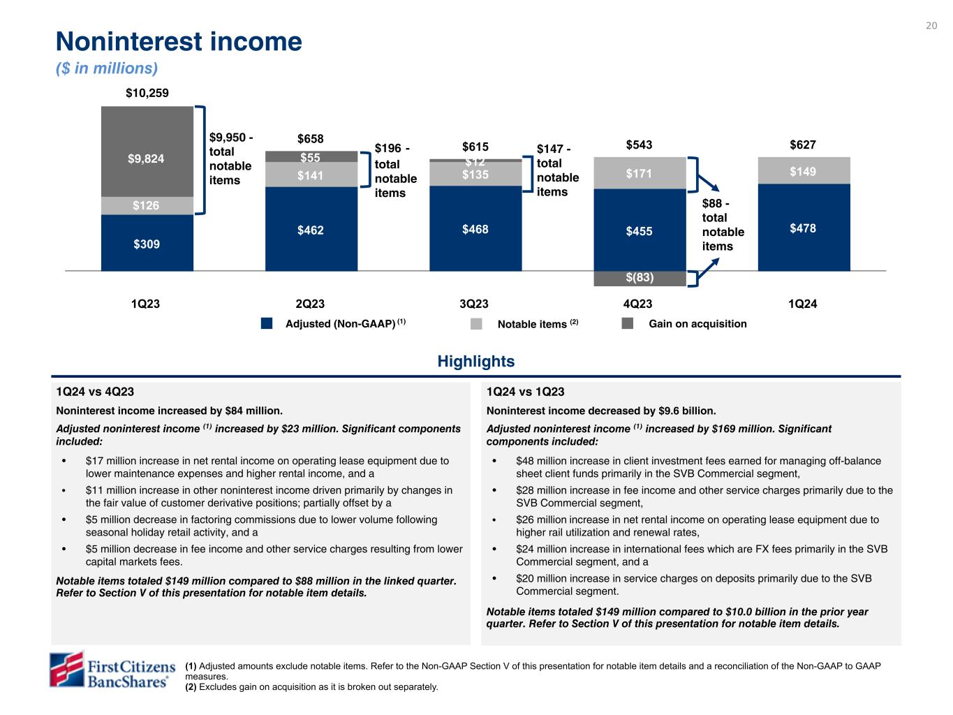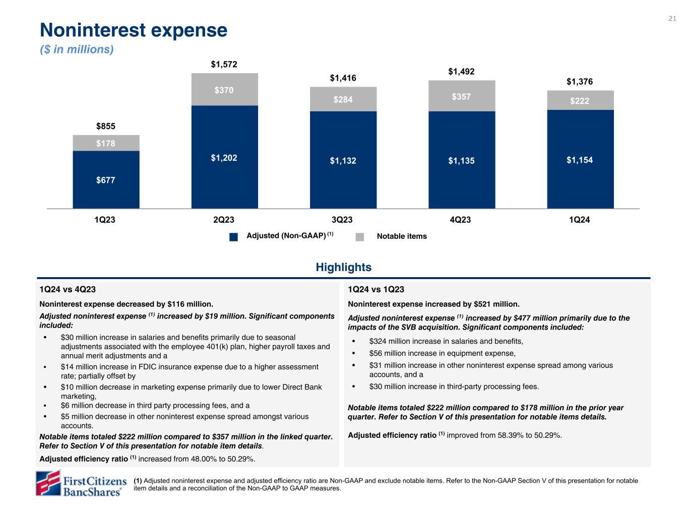 20 $658 $615 $543 $627 $309 $462 $468 $455 $478 $141 $135 $171 $149 $55 $12 1Q23 2Q23 3Q23 4Q23 1Q24 $10,259 $295 $149 1Q23 SVB contribution $1,940 $2,136 $996 $1,141 $944 $995 YTD Dec 21 YTD Dec 22 1Q24 vs 4Q23 Noninterest income increased by $84 million. Adjusted noninterest income (1) increased by $23 million. Significant components included: • $17 million increase in net rental income on operating lease equipment due to lower maintenance expenses and higher rental income, and a • $11 million increase in other noninterest income driven primarily by changes in the fair value of customer derivative positions; partially offset by a • $5 million decrease in factoring commissions due to lower volume following seasonal holiday retail activity, and a • $5 million decrease in fee income and other service charges resulting from lower capital markets fees. Notable items totaled $149 million compared to $88 million in the linked quarter. Refer to Section V of this presentation for notable item details. YTD22 vs YTD21 Noninterest income increased $196 million. Significant components of the change were: ◦ Rental income on operating leases increased $91 million due to the same reasons as in the linked quarter. Expenses on operating lease equipment declined $16 million resulting in a $107 million increase in adjusted rental income. ◦ Cardholder services income, net increased $15 million due to higher volume and fee income and other service charges increased $14 million, primarily due to higher capital markets and portfolio servicing fees. ◦ Wealth management services increased $13 million due to increased brokerage transactions and higher assets under management. ◦ Other noninterest income increased $63 million spread among various line items, including a $431 million bargain purchase gain, partially offset by a $147 million decline in investment gains and a $188 million decline in gains on asset and loan sales. Highlights Noninterest income ($ in millions) Core: ### increase 1Q24 vs 1Q23 Noninterest income decreased by $9.6 billion. Adjusted noninterest income (1) increased by $169 million. Significant components included: • $48 million increase in client investment fees earned for managing off-balance sheet client funds primarily in the SVB Commercial segment, • $28 million increase in fee income and other service charges primarily due to the SVB Commercial segment, • $26 million increase in net rental income on operating lease equipment due to higher rail utilization and renewal rates, • $24 million increase in international fees which are FX fees primarily in the SVB Commercial segment, and a • $20 million increase in service charges on deposits primarily due to the SVB Commercial segment. Notable items totaled $149 million compared to $10.0 billion in the prior year quarter. Refer to Section V of this presentation for notable item details. $126 Adjusted (Non-GAAP) (1) Notable items (2) Gain on acquisition $9,824 $9,950 - total notable items $149 - total notable items $478 - total adjusted (Non-GAAP) (1) $9,950 - total notable items $196 - total notable items $147 - total notable items $88 - total notable items (1) Adjusted amounts exclude notable items. Refer to the Non-GAAP Section V of this presentation for notable item details and a reconciliation of the Non-GAAP to GAAP measures. (2) Excludes gain on acquisition as it is broken out separately. $(83)