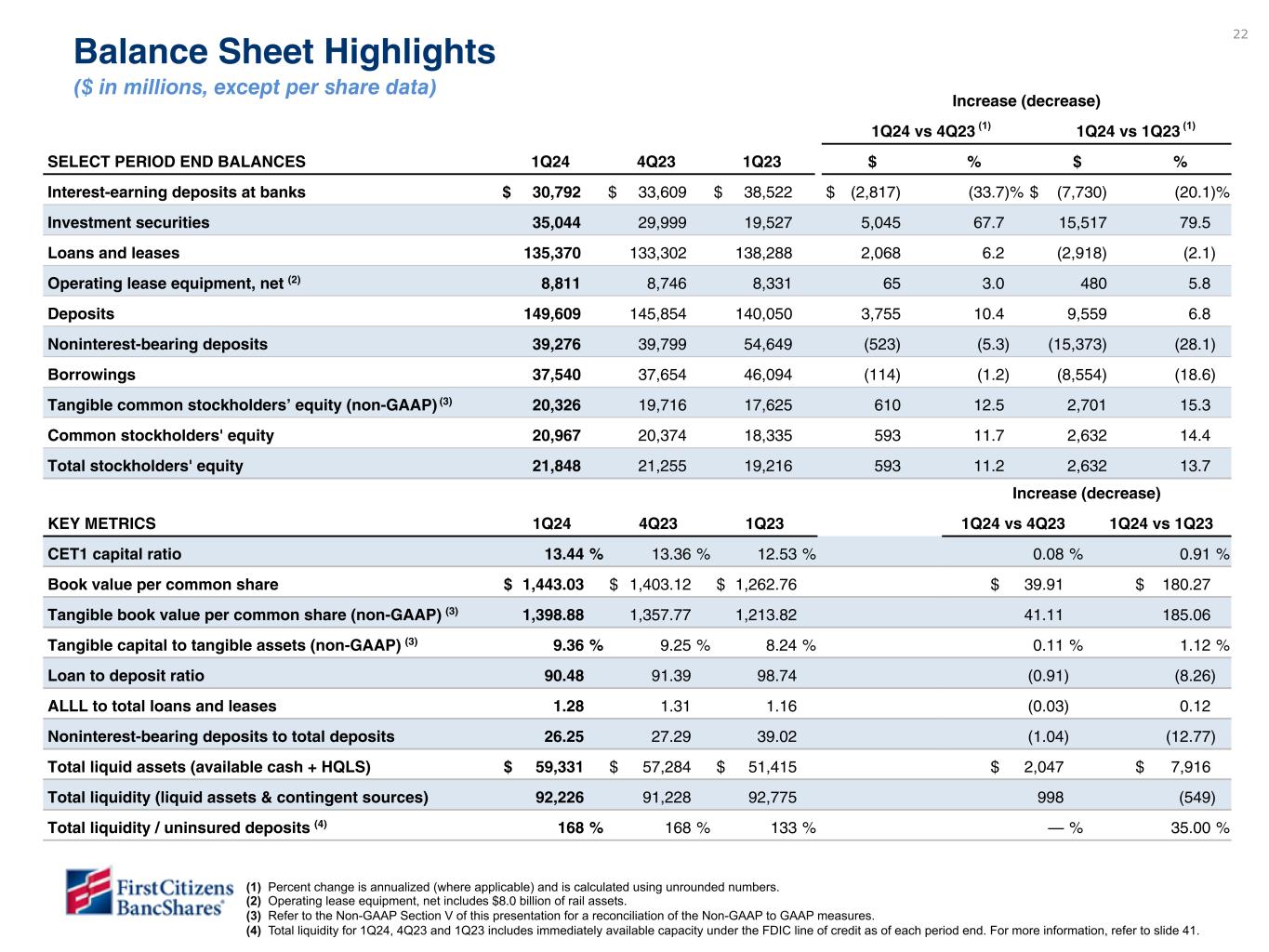 22 22 Increase (decrease) 1Q24 vs 4Q23 1Q24 vs 1Q23 SELECT PERIOD END BALANCES 1Q24 4Q23 1Q23 $ % $ % Interest-earning deposits at banks $ 30,792 $ 33,609 $ 38,522 $ (2,817) (33.7) % $ (7,730) (20.1) % Investment securities 35,044 29,999 19,527 5,045 67.7 15,517 79.5 Loans and leases 135,370 133,302 138,288 2,068 6.2 (2,918) (2.1) Operating lease equipment, net (2) 8,811 8,746 8,331 65 3.0 480 5.8 Deposits 149,609 145,854 140,050 3,755 10.4 9,559 6.8 Noninterest-bearing deposits 39,276 39,799 54,649 (523) (5.3) (15,373) (28.1) Borrowings 37,540 37,654 46,094 (114) (1.2) (8,554) (18.6) Tangible common stockholders’ equity (non-GAAP) (3) 20,326 19,716 17,625 610 12.5 2,701 15.3 Common stockholders' equity 20,967 20,374 18,335 593 11.7 2,632 14.4 Total stockholders' equity 21,848 21,255 19,216 593 11.2 2,632 13.7 Increase (decrease) KEY METRICS 1Q24 4Q23 1Q23 1Q24 vs 4Q23 1Q24 vs 1Q23 CET1 capital ratio 13.44 % 13.36 % 12.53 % 0.08 % 0.91 % Book value per common share $ 1,443.03 $ 1,403.12 $ 1,262.76 $ 39.91 $ 180.27 Tangible book value per common share (non-GAAP) (3) 1,398.88 1,357.77 1,213.82 41.11 185.06 Tangible capital to tangible assets (non-GAAP) (3) 9.36 % 9.25 % 8.24 % 0.11 % 1.12 % Loan to deposit ratio 90.48 91.39 98.74 (0.91) (8.26) ALLL to total loans and leases 1.28 1.31 1.16 (0.03) 0.12 Noninterest-bearing deposits to total deposits 26.25 27.29 39.02 (1.04) (12.77) Total liquid assets (available cash + HQLS) $ 59,331 $ 57,284 $ 51,415 $ 2,047 $ 7,916 Total liquidity (liquid assets & contingent sources) 92,226 91,228 92,775 998 (549) Total liquidity / uninsured deposits (4) 168 % 168 % 133 % — % 35.00 % Balance Sheet Highlights ($ in millions, except per share data) (1) (1) (1) Percent change is annualized (where applicable) and is calculated using unrounded numbers. (2) Operating lease equipment, net includes $8.0 billion of rail assets. (3) Refer to the Non-GAAP Section V of this presentation for a reconciliation of the Non-GAAP to GAAP measures. (4) Total liquidity for 1Q24, 4Q23 and 1Q23 includes immediately available capacity under the FDIC line of credit as of each period end. For more information, refer to slide 41.