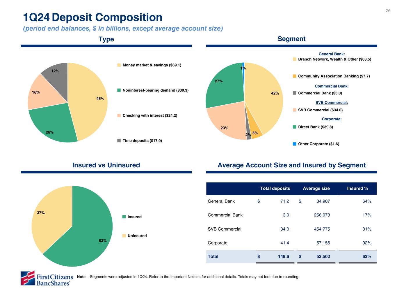25 $140,050 $141,164 $146,233 $145,854 $149,609 $85,401 $96,617 $103,092 $106,055 $110,333 $54,649 $44,547 $43,141 $39,799 $39,276 1Q23 2Q23 3Q23 4Q23 1Q24 2.35% 2.12% 1.68% 1.24% 2.53% Highlights Interest-bearing Noninterest-bearing Cost of deposits Deposits ($ in millions, period end balances) $140,050 $66,686 $24,105 $18,715 $30,544 1Q23 1Q24 vs. 4Q23 • Total deposits increased $3.8 billion (10.4% annualized) driven by a $2.4 billion (14.2% annualized) increase in the General Bank due to strong growth in the branch network and a $2.1 billion (22.9% annualized) increase in the Direct Bank. This was partially offset by a $716 million (8.3% annualized) decline in the SVB Commercial segment due primarily to client cash burn, muted fundraising activity and clients moving funds to off balance sheet products. 1Q24 vs. 1Q23 • Total deposits grew $9.6 billion (6.8%) driven primarily by growth in the Direct Bank of $21.0 billion (111.8%) as we began focusing on this channel to raise deposits, partially offset by a decrease of $11.3 billion (25.0%) in the SVB Commercial segment resulting from client attrition prior to and immediately following the acquisition, client cash burn and muted fundraising activity. Note – Segments were adjusted in 1Q24. Refer to the Important Notices for additional details.