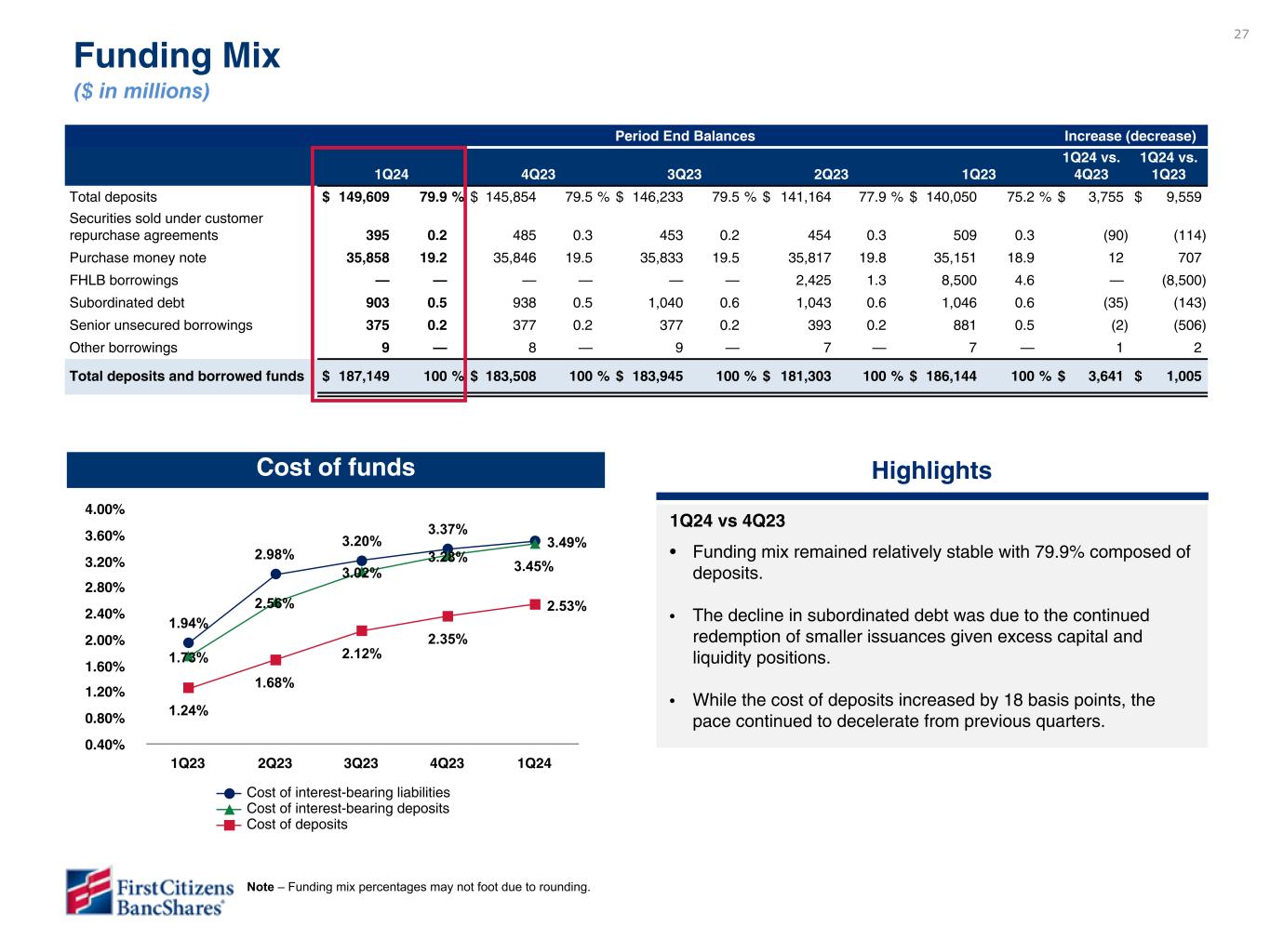27 1.94% 2.98% 3.20% 3.37% 3.49% 1.73% 2.56% 3.02% 3.28% 3.45% 1.24% 1.68% 2.12% 2.35% 2.53% Cost of interest-bearing liabilities Cost of interest-bearing deposits Cost of deposits 1Q23 2Q23 3Q23 4Q23 1Q24 0.40% 0.80% 1.20% 1.60% 2.00% 2.40% 2.80% 3.20% 3.60% 4.00% Cost of funds Additional sources of liquidity Categories $ in millions FHLB $ 9,218 FRB 4,203 Line of credit 100 Total $ 13,521 Period End Balances Increase (decrease) 1Q24 4Q23 3Q23 2Q23 1Q23 1Q24 vs. 4Q23 1Q24 vs. 1Q23 Total deposits $ 149,609 79.9 % $ 145,854 79.5 % $ 146,233 79.5 % $ 141,164 77.9 % $ 140,050 75.2 % $ 3,755 $ 9,559 Securities sold under customer repurchase agreements 395 0.2 485 0.3 453 0.2 454 0.3 509 0.3 (90) (114) Purchase money note 35,858 19.2 35,846 19.5 35,833 19.5 35,817 19.8 35,151 18.9 12 707 FHLB borrowings — — — — — — 2,425 1.3 8,500 4.6 — (8,500) Subordinated debt 903 0.5 938 0.5 1,040 0.6 1,043 0.6 1,046 0.6 (35) (143) Senior unsecured borrowings 375 0.2 377 0.2 377 0.2 393 0.2 881 0.5 (2) (506) Other borrowings 9 — 8 — 9 — 7 — 7 — 1 2 Total deposits and borrowed funds $ 187,149 100 % $ 183,508 100 % $ 183,945 100 % $ 181,303 100 % $ 186,144 100 % $ 3,641 $ 1,005 Funding Mix ($ in millions) Highlights 1Q24 vs 4Q23 • Funding mix remained relatively stable with 79.9% composed of deposits. • The decline in subordinated debt was due to the continued redemption of smaller issuances given excess capital and liquidity positions. • While the cost of deposits increased by 18 basis points, the pace continued to decelerate from previous quarters. Note – Funding mix percentages may not foot due to rounding.