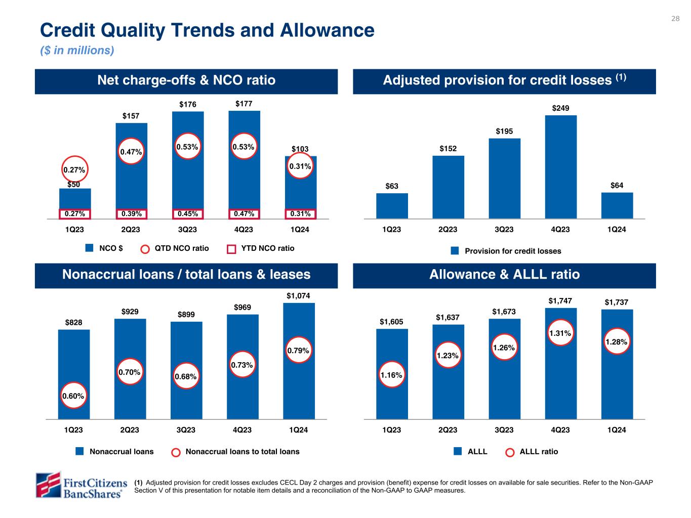 28 $63 $152 $195 $249 $64 Provision for credit losses 1Q23 2Q23 3Q23 4Q23 1Q24 Credit Quality Trends and Allowance ($ in millions) Net charge-offs & NCO ratio Adjusted provision for credit losses (1) $157 $176 $177 $103 0.27% 0.47% 0.53% 0.53% 0.31% NCO $ QTD NCO ratio YTD NCO ratio 1Q23 2Q23 3Q23 4Q23 1Q24 $828 $929 $899 $969 $1,074 0.60% 0.70% 0.68% 0.73% 0.79% Nonaccrual loans Nonaccrual loans to total loans 1Q23 2Q23 3Q23 4Q23 1Q24 Nonaccrual loans / total loans & leases Allowance & ALLL ratio $1,605 $1,637 $1,673 $1,747 $1,737 1.16% 1.23% 1.26% 1.31% 1.28% ALLL ALLL ratio 1Q23 2Q23 3Q23 4Q23 1Q24 0.31%0.27% 0.39% 0.45% 0.47% Please see addition of the YTD NCO totals. Note that we did not move the coverage ratios here as the rollforward slide looked bare without another metric included on that slide. (1) Adjusted provision for credit losses excludes CECL Day 2 charges and provision (benefit) expense for credit losses on available for sale securities. Refer to the Non-GAAP Section V of this presentation for notable item details and a reconciliation of the Non-GAAP to GAAP measures. $50