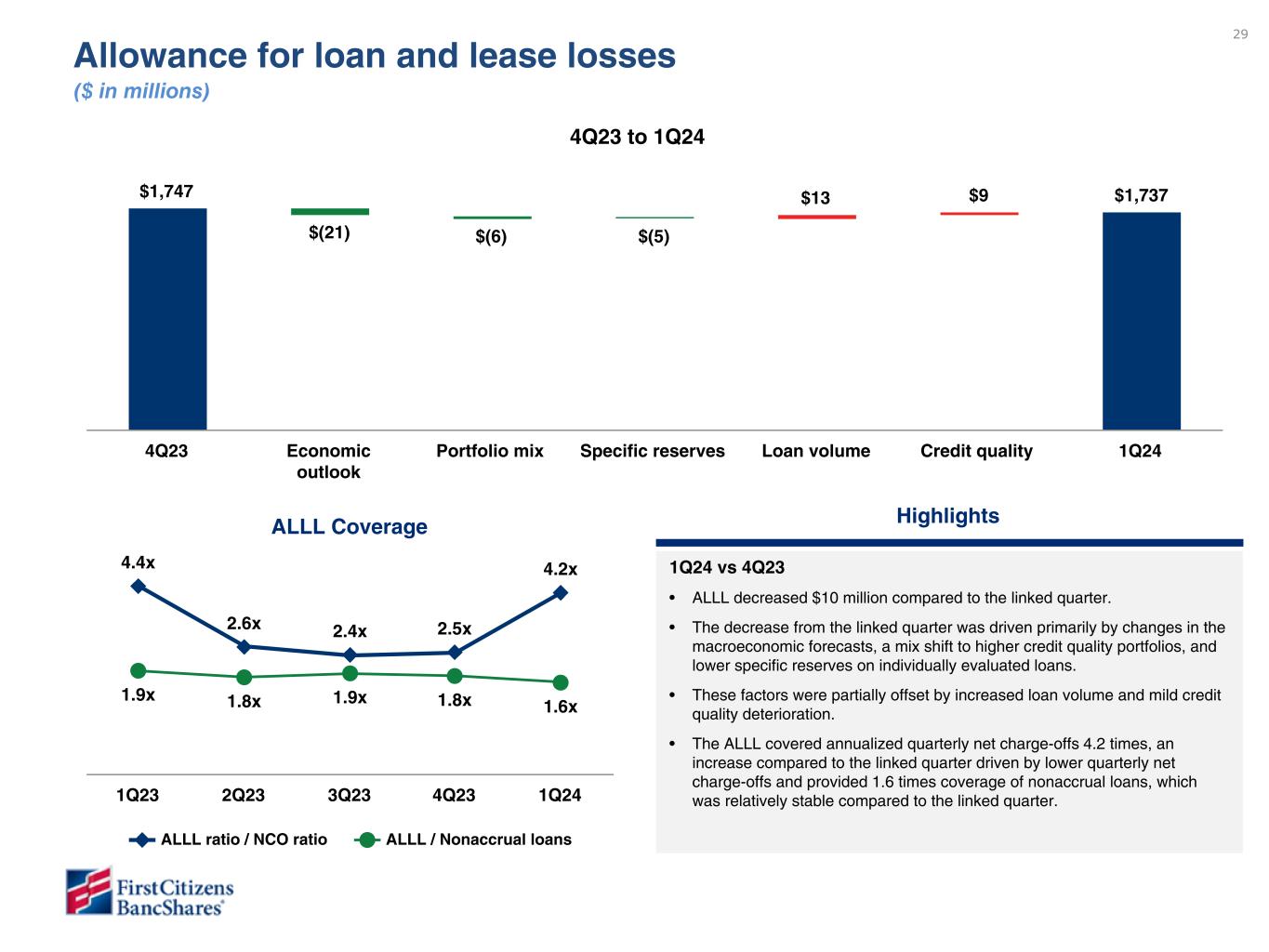 29 $1,747 $(21) $(6) $(5) $13 $9 $1,737 4Q23 Economic outlook Portfolio mix Specific reserves Loan volume Credit quality 1Q24 Highlights 1Q24 vs 4Q23 • ALLL decreased $10 million compared to the linked quarter. • The decrease from the linked quarter was driven primarily by changes in the macroeconomic forecasts, a mix shift to higher credit quality portfolios, and lower specific reserves on individually evaluated loans. • These factors were partially offset by increased loan volume and mild credit quality deterioration. • The ALLL covered annualized quarterly net charge-offs 4.2 times, an increase compared to the linked quarter driven by lower quarterly net charge-offs and provided 1.6 times coverage of nonaccrual loans, which was relatively stable compared to the linked quarter. ALLL Coverage 4.4x 2.6x 2.4x 2.5x 4.2x 1.9x 1.8x 1.9x 1.8x 1.6x ALLL ratio / NCO ratio ALLL / Nonaccrual loans 1Q23 2Q23 3Q23 4Q23 1Q24 4Q23 to 1Q24 Allowance for loan and lease losses ($ in millions)