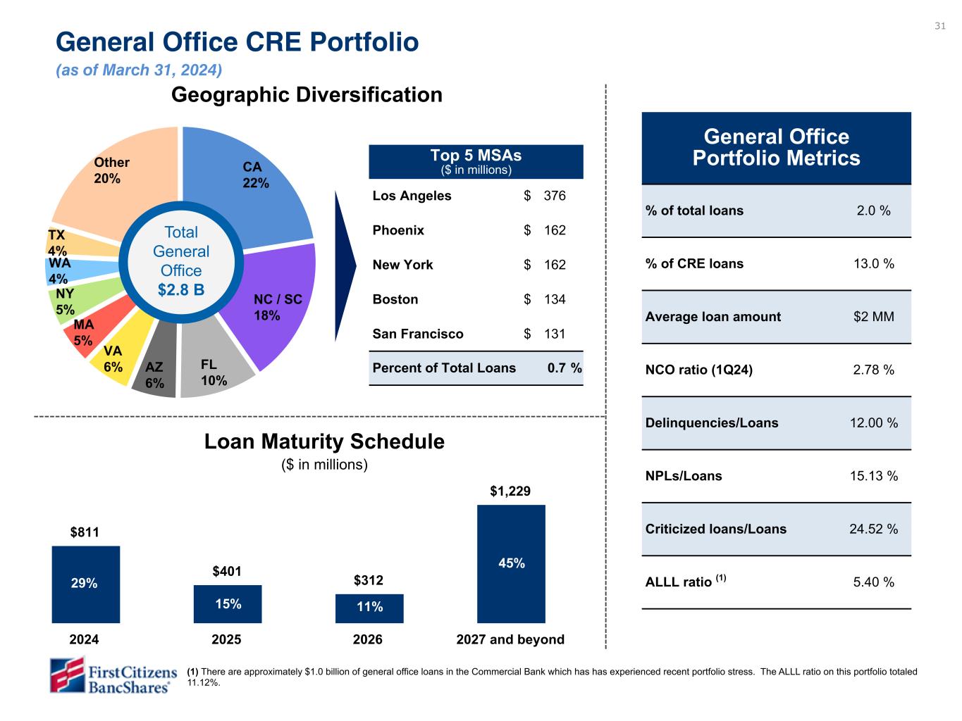 30 Loan Portfolios in Focus ($ in billions, as of March 31, 2024) Total Loans $135.4 Total Loans CRE $21.1 CRE Portfolio Composition Balance % of total loans Multi-Family $ 5.3 3.9 % Medical Office 3.4 2.6 General Office 2.8 2.0 Commercial Bank 1.0 0.7 Other 1.8 1.3 Industrial / Warehouse 3.1 2.3 Retail 2.0 1.5 Hotel/Motel 0.8 0.6 Other 3.7 2.7 Total $ 21.1 15.6 % Innovation Portfolio Composition Balance % of total loans Innovation C&I and cash flow dependent $ 9.3 7.0 % Investor dependent - growth stage 2.7 2.0 Investor dependent - early stage 1.3 1.0 Total $ 13.3 10.0 % Innovation $13.3 Note – The definition of CRE in these tables is aligned with supervisory guidance on commercial real estate and includes the following: construction loans (1.a.1 and 1.a.2), loans where the primary repayment is from 3rd party rental income (1.d and 1.e.2), and loans not secured by real estate but for the purpose of real estate (4.a, 8, and 9). Please do not review - data is not available. To be provided in subsequent draft Please confirm you agree with changes in the CRE portfolio chart below