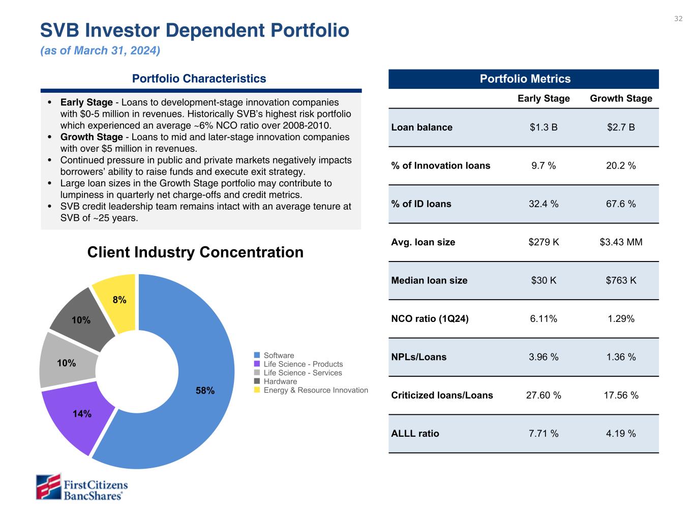 32 SVB Investor Dependent Portfolio (as of March 31, 2024) Portfolio Metrics Early Stage Growth Stage Loan balance $1.3 B $2.7 B % of Innovation loans 9.7 % 20.2 % % of ID loans 32.4 % 67.6 % Avg. loan size $279 K $3.43 MM Median loan size $30 K $763 K NCO ratio (1Q24) 6.11% 1.29% NPLs/Loans 3.96 % 1.36 % Criticized loans/Loans 27.60 % 17.56 % ALLL ratio 7.71 % 4.19 % Client Industry Concentration Portfolio Characteristics • Early Stage - Loans to development-stage innovation companies with $0-5 million in revenues. Historically SVB’s highest risk portfolio which experienced an average ~6% NCO ratio over 2008-2010. • Growth Stage - Loans to mid and later-stage innovation companies with over $5 million in revenues. • Continued pressure in public and private markets negatively impacts borrowers’ ability to raise funds and execute exit strategy. • Large loan sizes in the Growth Stage portfolio may contribute to lumpiness in quarterly net charge-offs and credit metrics. • SVB credit leadership team remains intact with an average tenure at SVB of ~25 years. 58% 14% 10% 10% 8% Software Life Science - Products Life Science - Services Hardware Energy & Resource Innovation