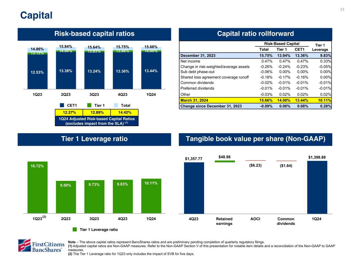 33 16.72% 9.50% 9.73% 9.83% 10.11% Tier 1 Leverage ratio 1Q23 2Q23 3Q23 4Q23 1Q24 Risk-based capital ratios Capital ratio rollforward Tier 1 Leverage ratio Tangible book value per share (Non-GAAP) Capital Risk-Based Capital Tier 1 Leverage Total Tier 1 CET1 December 31, 2023 15.75 % 13.94 % 13.36 % 9.83 % Net income 0.47 % 0.47 % 0.47 % 0.33 % Change in risk-weighted/average assets -0.26 % -0.24 % -0.23 % -0.05 % Sub debt phase-out -0.06 % 0.00 % 0.00 % 0.00 % Shared loss agreement coverage runoff -0.18 % -0.17 % -0.16 % 0.00 % Common dividends -0.02 % -0.01 % -0.01 % -0.01 % Preferred dividends -0.01 % -0.01 % -0.01 % -0.01 % Other -0.03 % 0.02 % 0.02 % 0.02 % March 31, 2024 15.66 % 14.00 % 13.44 % 10.11 % Change since December 31, 2023 -0.09 % 0.06 % 0.08 % 0.28 % 12.53% 13.38% 13.24% 13.36% 13.44% 13.13% 14.00% 13.83% 13.94% 14.00%14.86% 15.84% 15.64% 15.75% 15.66% CET1 Tier 1 Total 1Q23 2Q23 3Q23 4Q23 1Q24 $1,357.77 $48.98 ($6.23) ($1.64) $1,398.88 4Q23 Retained earnings AOCI Common dividends 1Q24(2) Note – The above capital ratios represent BancShares ratios and are preliminary pending completion of quarterly regulatory filings. (1) Adjusted capital ratios are Non-GAAP measures. Refer to the Non-GAAP Section V of this presentation for notable item details and a reconciliation of the Non-GAAP to GAAP measures. (2) The Tier 1 Leverage ratio for 1Q23 only includes the impact of SVB for five days. 12.37% 12.89% 14.42% 1Q24 Adjusted Risk-based Capital Ratios (excludes impact from the SLA) (1)