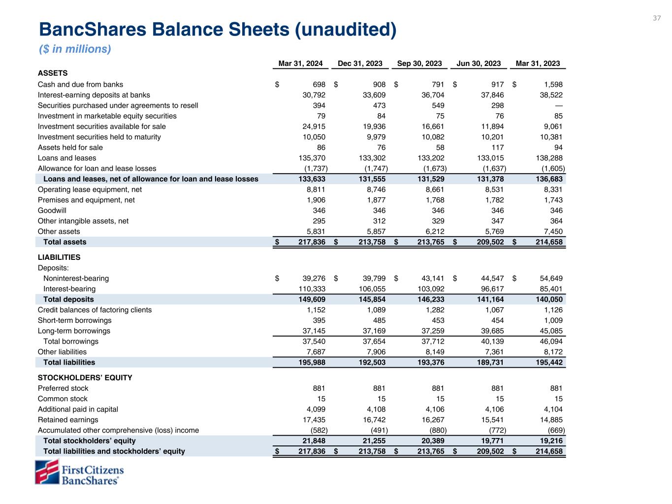 37 Mar 31, 2024 Dec 31, 2023 Sep 30, 2023 Jun 30, 2023 Mar 31, 2023 ASSETS Cash and due from banks $ 698 $ 908 $ 791 $ 917 $ 1,598 Interest-earning deposits at banks 30,792 33,609 36,704 37,846 38,522 Securities purchased under agreements to resell 394 473 549 298 — Investment in marketable equity securities 79 84 75 76 85 Investment securities available for sale 24,915 19,936 16,661 11,894 9,061 Investment securities held to maturity 10,050 9,979 10,082 10,201 10,381 Assets held for sale 86 76 58 117 94 Loans and leases 135,370 133,302 133,202 133,015 138,288 Allowance for loan and lease losses (1,737) (1,747) (1,673) (1,637) (1,605) Loans and leases, net of allowance for loan and lease losses 133,633 131,555 131,529 131,378 136,683 Operating lease equipment, net 8,811 8,746 8,661 8,531 8,331 Premises and equipment, net 1,906 1,877 1,768 1,782 1,743 Goodwill 346 346 346 346 346 Other intangible assets, net 295 312 329 347 364 Other assets 5,831 5,857 6,212 5,769 7,450 Total assets $ 217,836 $ 213,758 $ 213,765 $ 209,502 $ 214,658 LIABILITIES Deposits: Noninterest-bearing $ 39,276 $ 39,799 $ 43,141 $ 44,547 $ 54,649 Interest-bearing 110,333 106,055 103,092 96,617 85,401 Total deposits 149,609 145,854 146,233 141,164 140,050 Credit balances of factoring clients 1,152 1,089 1,282 1,067 1,126 Short-term borrowings 395 485 453 454 1,009 Long-term borrowings 37,145 37,169 37,259 39,685 45,085 Total borrowings 37,540 37,654 37,712 40,139 46,094 Other liabilities 7,687 7,906 8,149 7,361 8,172 Total liabilities 195,988 192,503 193,376 189,731 195,442 STOCKHOLDERS’ EQUITY Preferred stock 881 881 881 881 881 Common stock 15 15 15 15 15 Additional paid in capital 4,099 4,108 4,106 4,106 4,104 Retained earnings 17,435 16,742 16,267 15,541 14,885 Accumulated other comprehensive (loss) income (582) (491) (880) (772) (669) Total stockholders’ equity 21,848 21,255 20,389 19,771 19,216 Total liabilities and stockholders’ equity $ 217,836 $ 213,758 $ 213,765 $ 209,502 $ 214,658 BancShares Balance Sheets (unaudited) ($ in millions)