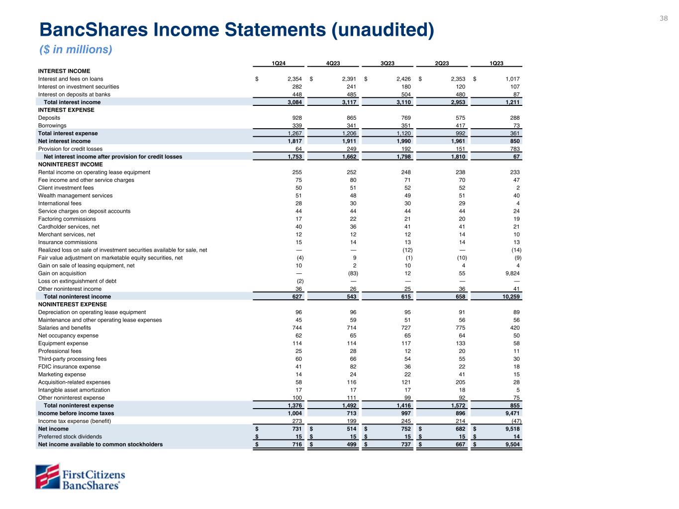 38 1Q24 4Q23 3Q23 2Q23 1Q23 INTEREST INCOME Interest and fees on loans $ 2,354 $ 2,391 $ 2,426 $ 2,353 $ 1,017 Interest on investment securities 282 241 180 120 107 Interest on deposits at banks 448 485 504 480 87 Total interest income 3,084 3,117 3,110 2,953 1,211 INTEREST EXPENSE Deposits 928 865 769 575 288 Borrowings 339 341 351 417 73 Total interest expense 1,267 1,206 1,120 992 361 Net interest income 1,817 1,911 1,990 1,961 850 Provision for credit losses 64 249 192 151 783 Net interest income after provision for credit losses 1,753 1,662 1,798 1,810 67 NONINTEREST INCOME Rental income on operating lease equipment 255 252 248 238 233 Fee income and other service charges 75 80 71 70 47 Client investment fees 50 51 52 52 2 Wealth management services 51 48 49 51 40 International fees 28 30 30 29 4 Service charges on deposit accounts 44 44 44 44 24 Factoring commissions 17 22 21 20 19 Cardholder services, net 40 36 41 41 21 Merchant services, net 12 12 12 14 10 Insurance commissions 15 14 13 14 13 Realized loss on sale of investment securities available for sale, net — — (12) — (14) Fair value adjustment on marketable equity securities, net (4) 9 (1) (10) (9) Gain on sale of leasing equipment, net 10 2 10 4 4 Gain on acquisition — (83) 12 55 9,824 Loss on extinguishment of debt (2) — — — — Other noninterest income 36 26 25 36 41 Total noninterest income 627 543 615 658 10,259 NONINTEREST EXPENSE Depreciation on operating lease equipment 96 96 95 91 89 Maintenance and other operating lease expenses 45 59 51 56 56 Salaries and benefits 744 714 727 775 420 Net occupancy expense 62 65 65 64 50 Equipment expense 114 114 117 133 58 Professional fees 25 28 12 20 11 Third-party processing fees 60 66 54 55 30 FDIC insurance expense 41 82 36 22 18 Marketing expense 14 24 22 41 15 Acquisition-related expenses 58 116 121 205 28 Intangible asset amortization 17 17 17 18 5 Other noninterest expense 100 111 99 92 75 Total noninterest expense 1,376 1,492 1,416 1,572 855 Income before income taxes 1,004 713 997 896 9,471 Income tax expense (benefit) 273 199 245 214 (47) Net income $ 731 $ 514 $ 752 $ 682 $ 9,518 Preferred stock dividends $ 15 $ 15 $ 15 $ 15 $ 14 Net income available to common stockholders $ 716 $ 499 $ 737 $ 667 $ 9,504 BancShares Income Statements (unaudited) ($ in millions)