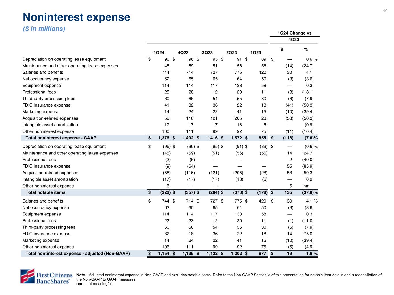 39 Noninterest income ($ in millions) 1Q24 Change vs 4Q23 1Q24 4Q23 3Q23 2Q23 1Q23 $ % Rental income on operating lease equipment $ 255 $ 252 $ 248 $ 238 $ 233 $ 3 0.9 % Fee income and other service charges 75 80 71 70 47 (5) (5.0) Client investment fees 50 51 52 52 2 (1) (1.9) Wealth management services 51 48 49 51 40 3 5.2 International fees 28 30 30 29 4 (2) (4.0) Service charges on deposit accounts 44 44 44 44 24 — 0.6 Factoring commissions 17 22 21 20 19 (5) (20.6) Cardholder services, net 40 36 41 41 21 4 10.0 Merchant services, net 12 12 12 14 10 — (3.2) Insurance commissions 15 14 13 14 13 1 8.7 Realized loss on sale of investment securities available for sale, net — — (12) — (14) — (47.5) Fair value adjustment on marketable equity securities, net (4) 9 (1) (10) (9) (13) (152.1) Gain on sale of leasing equipment, net 10 2 10 4 4 8 301.5 Gain on acquisition — (83) 12 55 9,824 83 (100.0) Loss on extinguishment of debt (2) — — — — (2) nm Other noninterest income 36 26 25 36 41 10 39.8 Total noninterest income - GAAP $ 627 $ 543 $ 615 $ 658 $ 10,259 $ 84 15.5 % Depreciation on operating lease equipment $ (96) $ (96) $ (95) $ (91) $ (89) $ — (0.6) % Maintenance and other operating lease expenses (45) (59) (51) (56) (56) 14 24.7 Realized loss on sale of investment securities available for sale, net — — 12 — 14 — — Fair value adjustment on marketable equity securities, net 4 (9) 1 10 9 13 152.1 Gain on sale of leasing equipment, net (10) (2) (10) (4) (4) (8) (301.5) Gain on acquisition — 83 (12) (55) (9,824) (83) nm Loss on extinguishment of debt 2 — — — — 2 nm Other noninterest income (4) (5) 8 — — 1 (20.0) Total notable items $ (149) $ (88) $ (147) $ (196) $ (9,950) $ (61) 69.3 % Rental income on operating lease equipment $ 114 $ 97 $ 102 $ 91 $ 88 $ 17 16.6 % Fee income and other service charges 75 80 71 70 47 (5) (5.0) Client investment fees 50 51 52 52 2 (1) (1.9) Wealth management services 51 48 49 51 40 3 5.2 International fees 28 30 30 29 4 (2) (4.0) Service charges on deposit accounts 44 44 44 44 24 — 0.6 Factoring commissions 17 22 21 20 19 (5) (20.6) Cardholder services, net 40 36 41 41 21 4 10.0 Merchant services, net 12 12 12 14 10 — (3.2) Insurance commissions 15 14 13 14 13 1 8.7 Other noninterest income 32 21 33 36 41 11 51.3 Total noninterest income - adjusted (Non-GAAP) $ 478 $ 455 $ 468 $ 462 $ 309 $ 23 5.2 % Note – Adjusted noninterest income is Non-GAAP and excludes notable items. Refer to the Non-GAAP Section V of this presentation for notable item details and a reconciliation of the Non-GAAP to GAAP measures. nm – not meaningful.