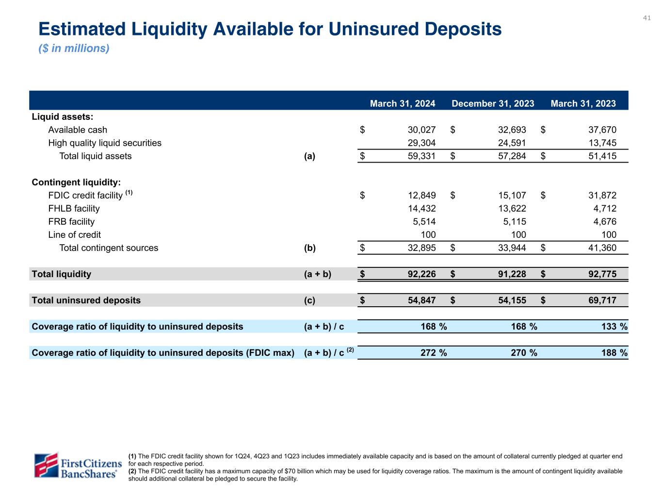 41 Estimated Liquidity Available for Uninsured Deposits ($ in millions) Total Deposits Less: Insured and/or collateralized deposits Total deposits - uninsured/ uncollateralized Estimated liquidity available for uninsured deposits: Immediately available cash Unpledged securities FDIC Line of Credit FHLB Fed Discount Window BTFP Program Estimated liquidity available for uninsured deposits Coverage ratio of liquidity available to uninsured and un-collateralized deposits $XX,XXX (XX,XXX) $X,XXX $X,XXX $X,XXX $X,XXX $X,XXX $XX,XXX $XX,XXX $XX,XXX March 31, 2024 December 31, 2023 March 31, 2023 Liquid assets: Available cash $ 30,027 $ 32,693 $ 37,670 High quality liquid securities 29,304 24,591 13,745 Total liquid assets (a) $ 59,331 $ 57,284 $ 51,415 Contingent liquidity: FDIC credit facility (1) $ 12,849 $ 15,107 $ 31,872 FHLB facility 14,432 13,622 4,712 FRB facility 5,514 5,115 4,676 Line of credit 100 100 100 Total contingent sources (b) $ 32,895 $ 33,944 $ 41,360 Total liquidity (a + b) $ 92,226 $ 91,228 $ 92,775 Total uninsured deposits (c) $ 54,847 $ 54,155 $ 69,717 Coverage ratio of liquidity to uninsured deposits (a + b) / c 168 % 168 % 133 % Coverage ratio of liquidity to uninsured deposits (FDIC max) (a + b) / c (2) 272 % 270 % 188 % SEC MD&A Liquidity Risk (1) The FDIC credit facility shown for 1Q24, 4Q23 and 1Q23 includes immediately available capacity and is based on the amount of collateral currently pledged at quarter end for each respective period. (2) The FDIC credit facility has a maximum capacity of $70 billion which may be used for liquidity coverage ratios. The maximum is the amount of contingent liquidity available should additional collateral be pledged to secure the facility.
