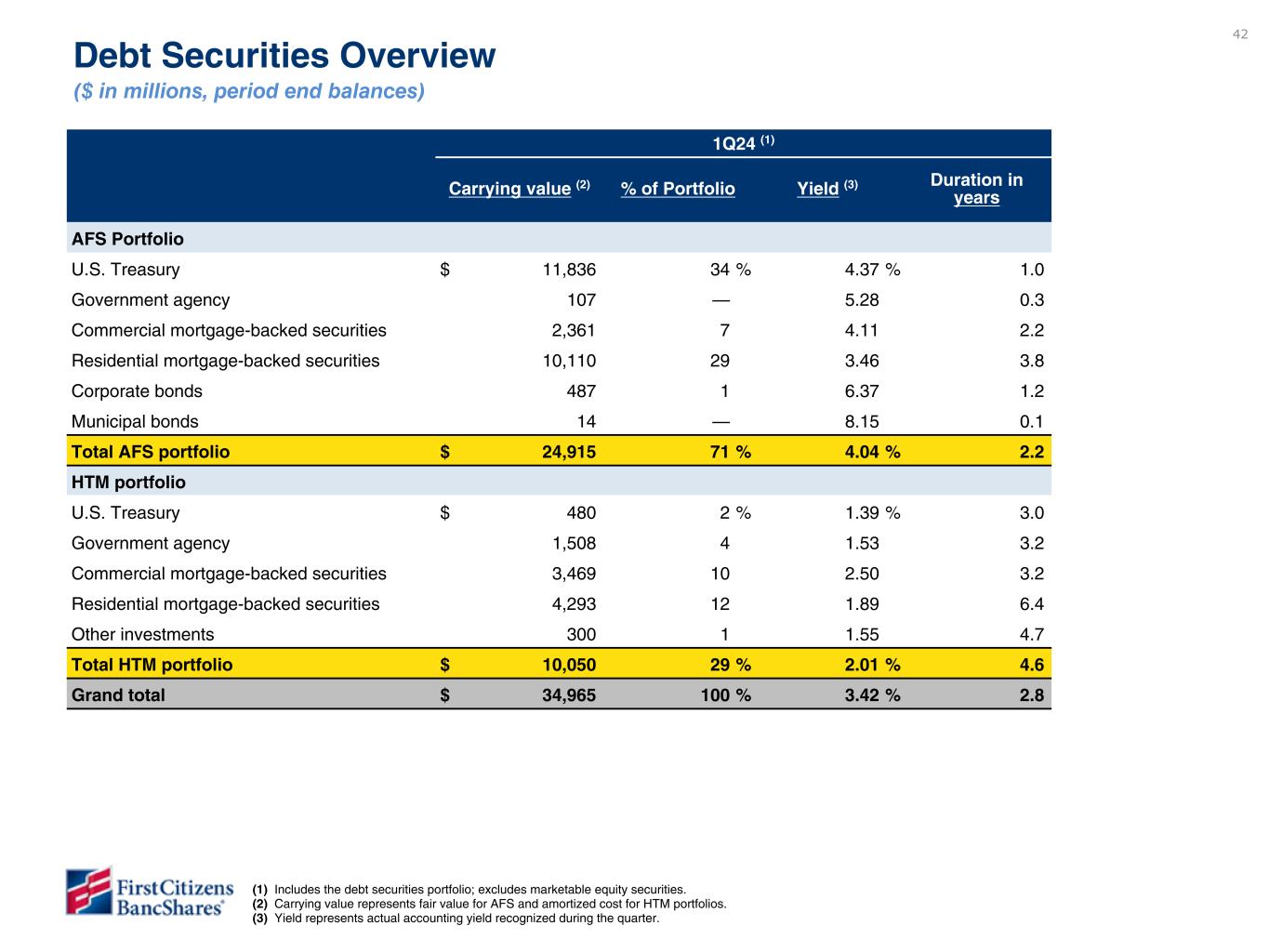 42 (1) 1Q24 (1) Carrying value (2) % of Portfolio Yield (3) Duration in years AFS Portfolio U.S. Treasury $ 11,836 34 % 4.37 % 1.0 Government agency 107 — 5.28 0.3 Commercial mortgage-backed securities 2,361 7 4.11 2.2 Residential mortgage-backed securities 10,110 29 3.46 3.8 Corporate bonds 487 1 6.37 1.2 Municipal bonds 14 — 8.15 0.1 Total AFS portfolio $ 24,915 71 % 4.04 % 2.2 HTM portfolio U.S. Treasury $ 480 2 % 1.39 % 3.0 Government agency 1,508 4 1.53 3.2 Commercial mortgage-backed securities 3,469 10 2.50 3.2 Residential mortgage-backed securities 4,293 12 1.89 6.4 Other investments 300 1 1.55 4.7 Total HTM portfolio $ 10,050 29 % 2.01 % 4.6 Grand total $ 34,965 100 % 3.42 % 2.8 Debt Securities Overview ($ in millions, period end balances) (1) Includes the debt securities portfolio; excludes marketable equity securities. (2) Carrying value represents fair value for AFS and amortized cost for HTM portfolios. (3) Yield represents actual accounting yield recognized during the quarter.