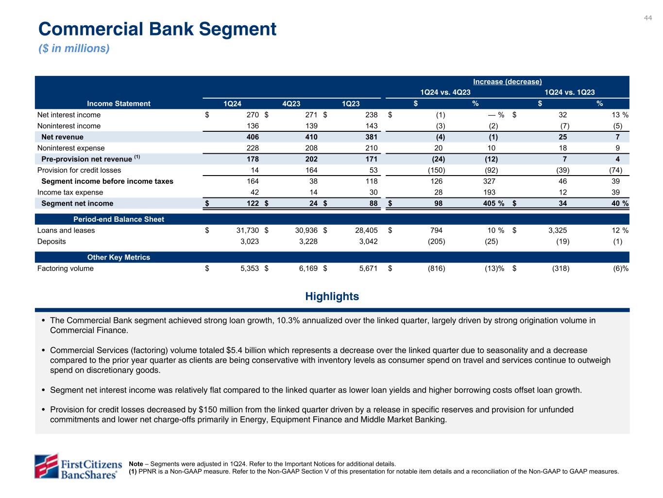 43 Change vs. 1Q24 4Q23 1Q23 4Q23 1Q23 Avg. Balance Income / Expense Yield / Rate Avg. Balance Income / Expense Yield / Rate Avg. Balance Income / Expense Yield / Rate Avg. Balance Income / Expense Yield / Rate Avg. Balance Income / Expense Yield / Rate Loans and leases (1) $ 132,313 $ 2,354 7.15 % $ 131,594 $ 2,391 7.21 % $ 73,592 $ 1,017 5.59 % $ 719 $ (37) (0.06) % $ 58,721 $ 1,337 1.56 % Investment securities 32,647 279 3.42 28,722 239 3.30 19,416 107 2.21 3,925 40 0.12 13,231 172 1.21 Securities purchased under agreements to resell 244 3 5.40 225 2 5.36 — — — 19 1 0.04 244 3 5.40 Interest-earning deposits at banks 33,383 448 5.39 35,712 485 5.39 7,585 87 4.61 (2,329) (37) — 25,798 361 0.78 Total interest-earning assets (1) $ 198,587 $ 3,084 6.23 % $ 196,253 $ 3,117 6.30 % $ 100,593 $ 1,211 4.86 % $ 2,334 $ (33) -0.07 % $ 97,994 $ 1,873 1.37 % Interest-bearing deposits $ 108,064 $ 928 3.45 % $ 104,717 $ 865 3.28 % $ 67,357 $ 288 1.73 % $ 3,347 $ 63 0.17 % $ 40,707 $ 640 1.72 % Securities sold under customer repurchase agreements 431 1 0.47 455 1 0.44 455 — 0.30 (24) — 0.03 (24) 1 0.17 Other short-term borrowings — — — — — — 328 4 4.67 — — — (328) (4) (4.67) Long-term borrowings 37,146 338 3.64 37,260 340 3.65 7,193 69 3.84 (114) (2) (0.01) 29,953 269 (0.20) Total borrowings $ 37,577 $ 339 3.60 % $ 37,715 $ 341 3.61 % $ 7,976 $ 73 3.67 % $ (138) $ (2) (0.01) % $ 29,601 $ 266 (0.07) % Total interest-bearing liabilities $ 145,641 $ 1,267 3.49 % $ 142,432 $ 1,206 3.37 % $ 75,333 $ 361 1.94 % $ 3,209 $ 61 0.12 % $ 70,308 $ 906 1.55 % Net interest income $ 1,817 $ 1,911 $ 850 $ (94) $ 967 Net interest spread (1) 2.74 % 2.93 % 2.92 % (0.19) % (0.18) % Net interest margin (1) 3.67 % 3.86 % 3.41 % (0.19) % 0.26 % Change vs. YTD23 YTD22 YTD22 Avg. Balance Income / Expense Yield / Rate Avg. Balance Income / Expense Yield / Rate Avg. Balance Income / Expense Yield / Rate Loans and leases (1) $ 66,634 $ 2,953 4.41 % $ 65,639 $ 2,697 4.09 % $ 995 $ 256 0.32 % Investment securities 19,166 354 1.85 16,110 216 1.32 3,056 138 0.53 Interest-earning deposits at banks 7,726 106 1.38 13,246 17 0.13 (5,520) 89 1.25 Total interest-earning assets (1) $ 93,526 $ 3,413 3.63 % $ 94,995 $ 2,930 3.07 % $ (1,469) $ 483 0.56 % Interest-bearing deposits $ 63,598 $ 335 0.53 % $ 65,295 $ 239 0.37 % $ (1,697) $ 96 0.16 % Securities sold under customer repurchase agreements 590 1 0.19 660 1 0.20 (70) — (0.01) Other short-term borrowings 824 28 3.30 — — — 824 28 3.30 Long-term borrowings 3,882 103 2.64 5,915 249 4.15 (2,033) (146) (1.51) Total borrowings $ 5,296 $ 132 2.47 % $ 6,575 $ 250 3.75 % $ (1,279) $ (118) (1.28) % Total interest-bearing liabilities $ 68,894 $ 467 0.68 % $ 71,870 $ 489 0.68 % $ (2,976) $ (22) — % Net interest income $ 2,946 $ 2,441 $ 505 Net interest spread (1) 2.95 % 2.39 % 0.56 % Net interest margin (1) 3.14 % 2.55 % 0.59 % Average Balances and Yields ($ in millions) YTD not disclosed Q1 (1) The balance and rate presented is calculated net of average credit balances and deposits of factoring clients.