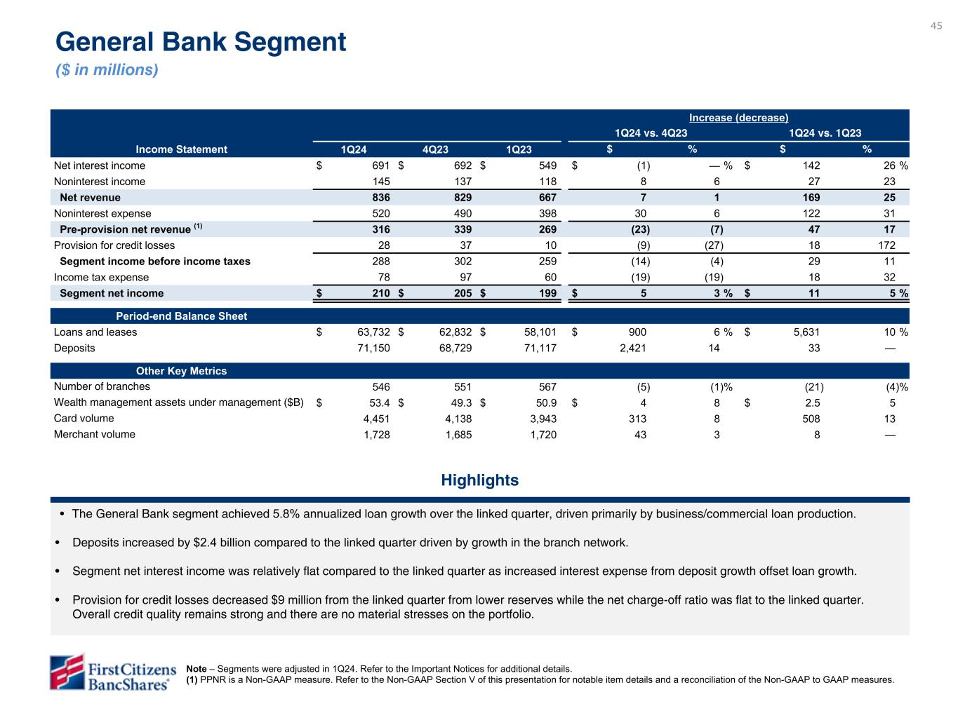 44 Highlights • The Commercial Bank segment achieved strong loan growth, 10.3% annualized over the linked quarter, largely driven by strong origination volume in Commercial Finance. • Commercial Services (factoring) volume totaled $5.4 billion which represents a decrease over the linked quarter due to seasonality and a decrease compared to the prior year quarter as clients are being conservative with inventory levels as consumer spend on travel and services continue to outweigh spend on discretionary goods. • Segment net interest income was relatively flat compared to the linked quarter as lower loan yields and higher borrowing costs offset loan growth. • Provision for credit losses decreased by $150 million from the linked quarter driven by a release in specific reserves and provision for unfunded commitments and lower net charge-offs primarily in Energy, Equipment Finance and Middle Market Banking. Increase (decrease) 1Q24 vs. 4Q23 1Q24 vs. 1Q23 Income Statement 1Q24 4Q23 1Q23 $ % $ % Net interest income $ 270 $ 271 $ 238 $ (1) — % $ 32 13 % Noninterest income 136 139 143 (3) (2) (7) (5) Net revenue 406 410 381 (4) (1) 25 7 Noninterest expense 228 208 210 20 10 18 9 Pre-provision net revenue (1) 178 202 171 (24) (12) 7 4 Provision for credit losses 14 164 53 (150) (92) (39) (74) Segment income before income taxes 164 38 118 126 327 46 39 Income tax expense 42 14 30 28 193 12 39 Segment net income $ 122 $ 24 $ 88 $ 98 405 % $ 34 40 % Period-end Balance Sheet Loans and leases $ 31,730 $ 30,936 $ 28,405 $ 794 10 % $ 3,325 12 % Deposits 3,023 3,228 3,042 (205) (25) (19) (1) Other Key Metrics Factoring volume $ 5,353 $ 6,169 $ 5,671 $ (816) (13) % $ (318) (6) % Commercial Bank Segment ($ in millions) Note – Segments were adjusted in 1Q24. Refer to the Important Notices for additional details. (1) PPNR is a Non-GAAP measure. Refer to the Non-GAAP Section V of this presentation for notable item details and a reconciliation of the Non-GAAP to GAAP measures. Please do not review - data is update based on latest rounded financials but has not yet been validated and data and commentary will be updated in subsequent draft