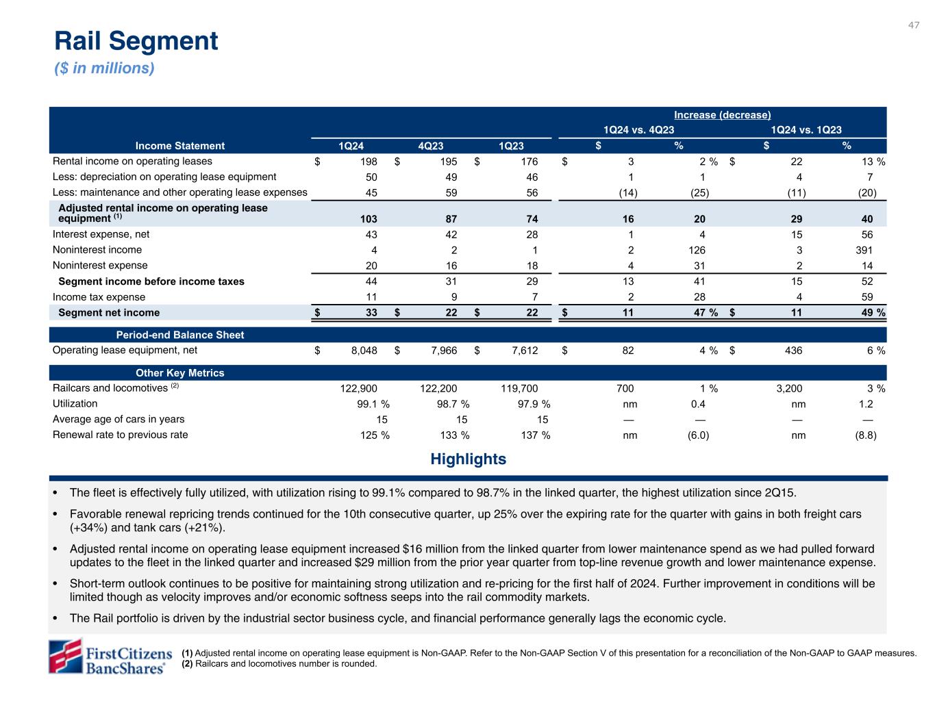 47 Rail Segment ($ in millions) (1) Adjusted rental income on operating lease equipment is Non-GAAP. Refer to the Non-GAAP Section V of this presentation for a reconciliation of the Non-GAAP to GAAP measures. (2) Railcars and locomotives number is rounded. Highlights • The fleet is effectively fully utilized, with utilization rising to 99.1% compared to 98.7% in the linked quarter, the highest utilization since 2Q15. • Favorable renewal repricing trends continued for the 10th consecutive quarter, up 25% over the expiring rate for the quarter with gains in both freight cars (+34%) and tank cars (+21%). • Adjusted rental income on operating lease equipment increased $16 million from the linked quarter from lower maintenance spend as we had pulled forward updates to the fleet in the linked quarter and increased $29 million from the prior year quarter from top-line revenue growth and lower maintenance expense. • Short-term outlook continues to be positive for maintaining strong utilization and re-pricing for the first half of 2024. Further improvement in conditions will be limited though as velocity improves and/or economic softness seeps into the rail commodity markets. • The Rail portfolio is driven by the industrial sector business cycle, and financial performance generally lags the economic cycle. Increase (decrease) 1Q24 vs. 4Q23 1Q24 vs. 1Q23 Income Statement 1Q24 4Q23 1Q23 $ % $ % Rental income on operating leases $ 198 $ 195 $ 176 $ 3 2 % $ 22 13 % Less: depreciation on operating lease equipment 50 49 46 1 1 4 7 Less: maintenance and other operating lease expenses 45 59 56 (14) (25) (11) (20) Adjusted rental income on operating lease equipment (1) 103 87 74 16 20 29 40 Interest expense, net 43 42 28 1 4 15 56 Noninterest income 4 2 1 2 126 3 391 Noninterest expense 20 16 18 4 31 2 14 Segment income before income taxes 44 31 29 13 41 15 52 Income tax expense 11 9 7 2 28 4 59 Segment net income $ 33 $ 22 $ 22 $ 11 47 % $ 11 49 % Period-end Balance Sheet Operating lease equipment, net $ 8,048 $ 7,966 $ 7,612 $ 82 4 % $ 436 6 % Other Key Metrics Railcars and locomotives (2) 122,900 122,200 119,700 700 1 % 3,200 3 % Utilization 99.1 % 98.7 % 97.9 % nm 0.4 nm 1.2 Average age of cars in years 15 15 15 — — — — Renewal rate to previous rate 125 % 133 % 137 % nm (6.0) nm (8.8) Please do not review - data is update based on latest rounded financials but has not yet been validated and data and commentary will be updated in subsequent draft