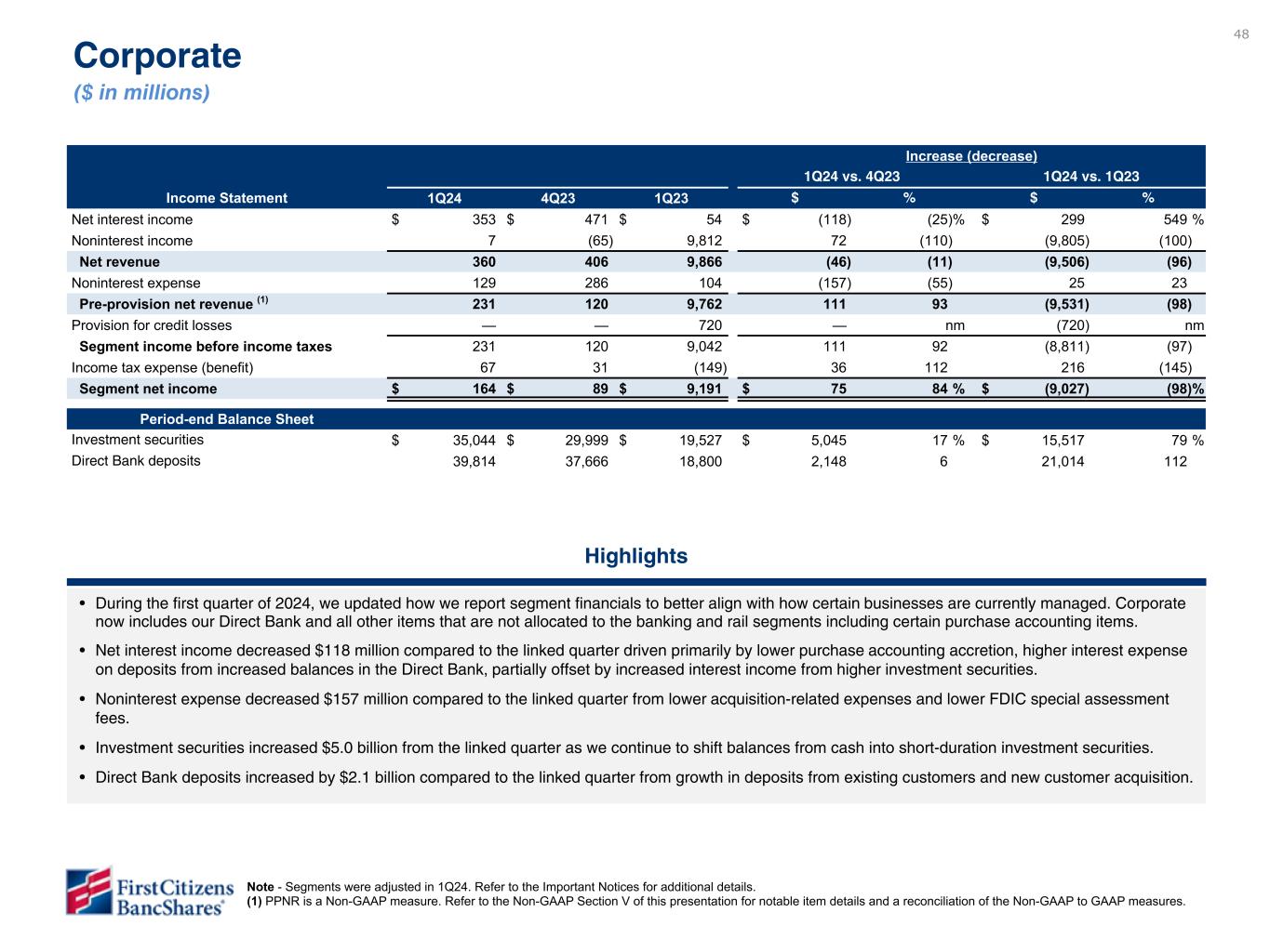 48 Highlights • During the first quarter of 2024, we updated how we report segment financials to better align with how certain businesses are currently managed. Corporate now includes our Direct Bank and all other items that are not allocated to the banking and rail segments including certain purchase accounting items. • Net interest income decreased $118 million compared to the linked quarter driven primarily by lower purchase accounting accretion, higher interest expense on deposits from increased balances in the Direct Bank, partially offset by increased interest income from higher investment securities. • Noninterest expense decreased $157 million compared to the linked quarter from lower acquisition-related expenses and lower FDIC special assessment fees. • Investment securities increased $5.0 billion from the linked quarter as we continue to shift balances from cash into short-duration investment securities. • Direct Bank deposits increased by $2.1 billion compared to the linked quarter from growth in deposits from existing customers and new customer acquisition. Corporate ($ in millions) Note - Segments were adjusted in 1Q24. Refer to the Important Notices for additional details. (1) PPNR is a Non-GAAP measure. Refer to the Non-GAAP Section V of this presentation for notable item details and a reconciliation of the Non-GAAP to GAAP measures. Increase (decrease) 1Q24 vs. 4Q23 1Q24 vs. 1Q23 Income Statement 1Q24 4Q23 1Q23 $ % $ % Net interest income $ 353 $ 471 $ 54 $ (118) (25) % $ 299 549 % Noninterest income 7 (65) 9,812 72 (110) (9,805) (100) Net revenue 360 406 9,866 (46) (11) (9,506) (96) Noninterest expense 129 286 104 (157) (55) 25 23 Pre-provision net revenue (1) 231 120 9,762 111 93 (9,531) (98) Provision for credit losses — — 720 — nm (720) nm Segment income before income taxes 231 120 9,042 111 92 (8,811) (97) Income tax expense (benefit) 67 31 (149) 36 112 216 (145) Segment net income $ 164 $ 89 $ 9,191 $ 75 84 % $ (9,027) (98) % Period-end Balance Sheet Investment securities $ 35,044 $ 29,999 $ 19,527 $ 5,045 17 % $ 15,517 79 % Direct Bank deposits 39,814 37,666 18,800 2,148 6 21,014 112 Please do not review - data is update based on latest rounded financials but has not yet been validated and data and commentary will be updated in subsequent draft