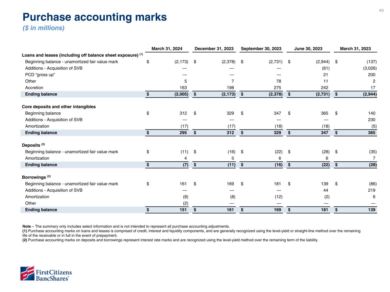 49 March 31, 2024 December 31, 2023 September 30, 2023 June 30, 2023 March 31, 2023 Loans and leases (including off balance sheet exposure) (1) Beginning balance - unamortized fair value mark $ (2,173) $ (2,378) $ (2,731) $ (2,944) $ (137) Additions - Acquisition of SVB — — — (61) (3,026) PCD “gross up” — — — 21 200 Other 5 7 78 11 2 Accretion 163 198 275 242 17 Ending balance $ (2,005) $ (2,173) $ (2,378) $ (2,731) $ (2,944) Core deposits and other intangibles Beginning balance $ 312 $ 329 $ 347 $ 365 $ 140 Additions - Acquisition of SVB — — — — 230 Amortization (17) (17) (18) (18) (5) Ending balance $ 295 $ 312 $ 329 $ 347 $ 365 Deposits (2) Beginning balance - unamortized fair value mark $ (11) $ (16) $ (22) $ (28) $ (35) Amortization 4 5 6 6 7 Ending balance $ (7) $ (11) $ (16) $ (22) $ (28) Borrowings (2) Beginning balance - unamortized fair value mark $ 161 $ 169 $ 181 $ 139 $ (86) Additions - Acquisition of SVB — — — 44 219 Amortization (8) (8) (12) (2) 6 Other (2) — — — — Ending balance $ 151 $ 161 $ 169 $ 181 $ 139 Purchase accounting marks ($ in millions) Note – The summary only includes select information and is not intended to represent all purchase accounting adjustments. (1) Purchase accounting marks on loans and leases is comprised of credit, interest and liquidity components, and are generally recognized using the level-yield or straight-line method over the remaining life of the receivable or in full in the event of prepayment. (2) Purchase accounting marks on deposits and borrowings represent interest rate marks and are recognized using the level-yield method over the remaining term of the liability.