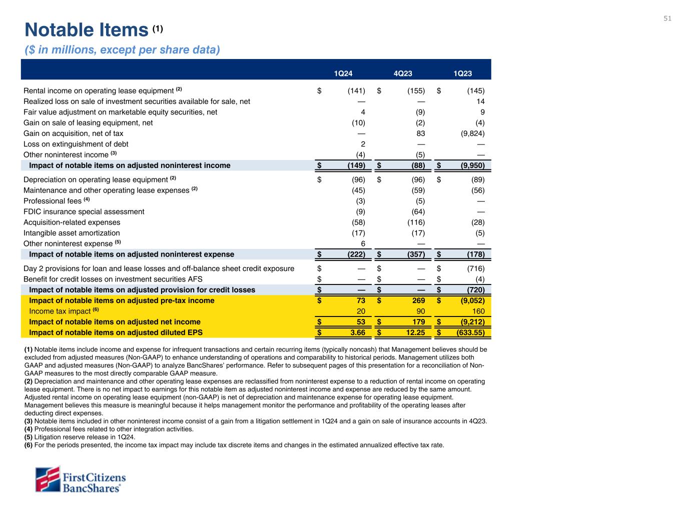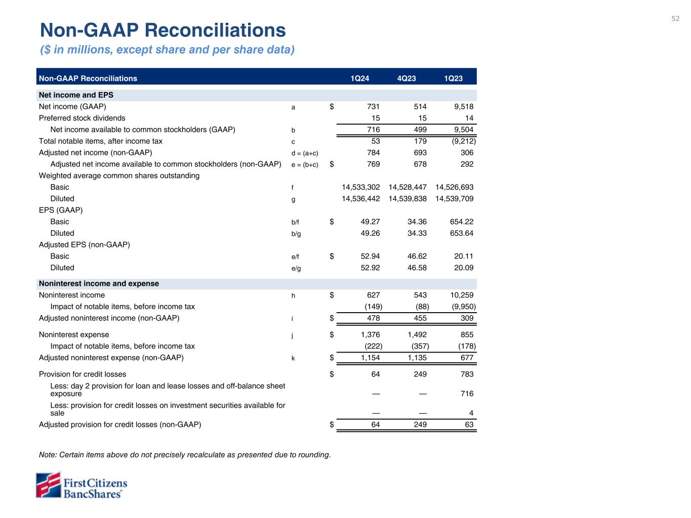 51 1Q23 4Q22 1Q22 Rental income on operating lease equipment (2) $ (141) $ (155) $ (145) Realized gain on sale of investment securities available for sale, net — — 14 Fair value adjustment on marketable equity securities, net 4 (9) 9 Gain on sale of leasing equipment, net (10) (2) (4) Gain on acquisition — 83 (9,824) Gain on extinguishment of debt 2 — — Other noninterest income(3) (4) (5) — Impact on adjusted noninterest income $ (149) $ (88) $ (9,950) Depreciation on operating lease equipment (2) $ (96) $ (96) $ (89) Maintenance and other operating lease expenses (2) (45) (59) (56) Salaries and benefits — — — Acquisition-related expenses (58) (116) (28) Intangible asset amortization (17) (17) (5) Other noninterest expense (4) 6 — — Impact on adjusted noninterest expense $ (222) $ (357) $ (178) CECL Day 2 provision and reserve for unfunded commitments — (716) (720) Provision for credit losses- investment securities available for sale — (4) — Provision for credit losses - total adjustments $ — $ — $ (720) Impact on adjusted pre-tax income $ 134 $ 173 $ 38 Income tax impact (5) (6) 20 90 160 Impact on adjusted net income $ 53 $ 179 $ (9,212) Impact on adjusted diluted EPS $ 3.66 $ 12.25 -633.55 Notable Items (1) ($ in millions, except per share data) 1Q24 4Q23 1Q23 Rental income on operating lease equipment (2) $ (141) $ (155) $ (145) Realized loss on sale of investment securities available for sale, net — — 14 Fair value adjustment on marketable equity securities, net 4 (9) 9 Gain on sale of leasing equipment, net (10) (2) (4) Gain on acquisition, net of tax — 83 (9,824) Loss on extinguishment of debt 2 — — Other noninterest income (3) (4) (5) — Impact of notable items on adjusted noninterest income $ (149) $ (88) $ (9,950) Depreciation on operating lease equipment (2) $ (96) $ (96) $ (89) Maintenance and other operating lease expenses (2) (45) (59) (56) Professional fees (4) (3) (5) — FDIC insurance special assessment (9) (64) — Acquisition-related expenses (58) (116) (28) Intangible asset amortization (17) (17) (5) Other noninterest expense (5) 6 — — Impact of notable items on adjusted noninterest expense $ (222) $ (357) $ (178) Day 2 provisions for loan and lease losses and off-balance sheet credit exposure $ — $ — $ (716) Benefit for credit losses on investment securities AFS $ — $ — $ (4) Impact of notable items on adjusted provision for credit losses $ — $ — $ (720) Impact of notable items on adjusted pre-tax income $ 73 $ 269 $ (9,052) Income tax impact (6) 20 90 160 Impact of notable items on adjusted net income $ 53 $ 179 $ (9,212) Impact of notable items on adjusted diluted EPS $ 3.66 $ 12.25 $ (633.55) (1) Notable items include income and expense for infrequent transactions and certain recurring items (typically noncash) that Management believes should be excluded from adjusted measures (Non-GAAP) to enhance understanding of operations and comparability to historical periods. Management utilizes both GAAP and adjusted measures (Non-GAAP) to analyze BancShares’ performance. Refer to subsequent pages of this presentation for a reconciliation of Non- GAAP measures to the most directly comparable GAAP measure. (2) Depreciation and maintenance and other operating lease expenses are reclassified from noninterest expense to a reduction of rental income on operating lease equipment. There is no net impact to earnings for this notable item as adjusted noninterest income and expense are reduced by the same amount. Adjusted rental income on operating lease equipment (non-GAAP) is net of depreciation and maintenance expense for operating lease equipment. Management believes this measure is meaningful because it helps management monitor the performance and profitability of the operating leases after deducting direct expenses. (3) Notable items included in other noninterest income consist of a gain from a litigation settlement in 1Q24 and a gain on sale of insurance accounts in 4Q23. (4) Professional fees related to other integration activities. (5) Litigation reserve release in 1Q24. (6) For the periods presented, the income tax impact may include tax discrete items and changes in the estimated annualized effective tax rate.
