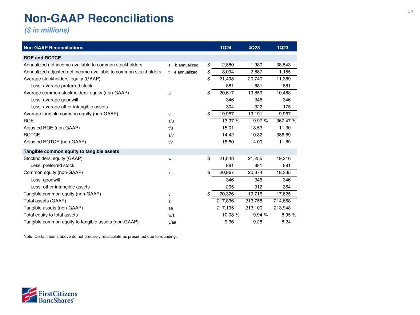 53 Non-GAAP Reconciliations ($ in millions) Non-GAAP Reconciliations 1Q24 4Q23 1Q23 PPNR Net income (GAAP) a $ 731 514 9,518 Plus: provision for credit losses 64 249 783 Plus: income tax expense 273 199 (47) PPNR (non-GAAP) l $ 1,068 962 10,254 Impact of notable items (1) 73 269 (9,772) Adjusted PPNR (non-GAAP) m $ 1,141 1,231 482 ROA Net income (GAAP) a $ 731 514 9,518 Annualized net income n = a annualized 2,942 2,041 38,602 Adjusted net income (non-GAAP) d 784 693 306 Annualized adjusted net income p = d annualized 3,156 2,748 1,244 Average assets o 216,081 214,612 116,164 ROA n/o 1.36 % 0.95 % 33.23 % Adjusted ROA (non-GAAP) p/o 1.46 1.28 1.07 PPNR ROA PPNR (non-GAAP) l $ 1,068 962 10,254 Annualized PPNR q = l annualized 4,296 3,818 41,586 Adjusted PPNR (non-GAAP) m 1,141 1,231 482 Annualized adjusted PPNR r = m annualized 4,589 4,882 1,954 PPNR ROA q/o 1.99 % 1.78 % 35.80 % Adjusted PPNR ROA (non-GAAP) r/o 2.12 2.27 1.69 (1) Excludes the notable items for the provision for credit losses and income taxes as these items are excluded from PPNR as presented in the table above. Note: Certain items above do not precisely recalculate as presented due to rounding.