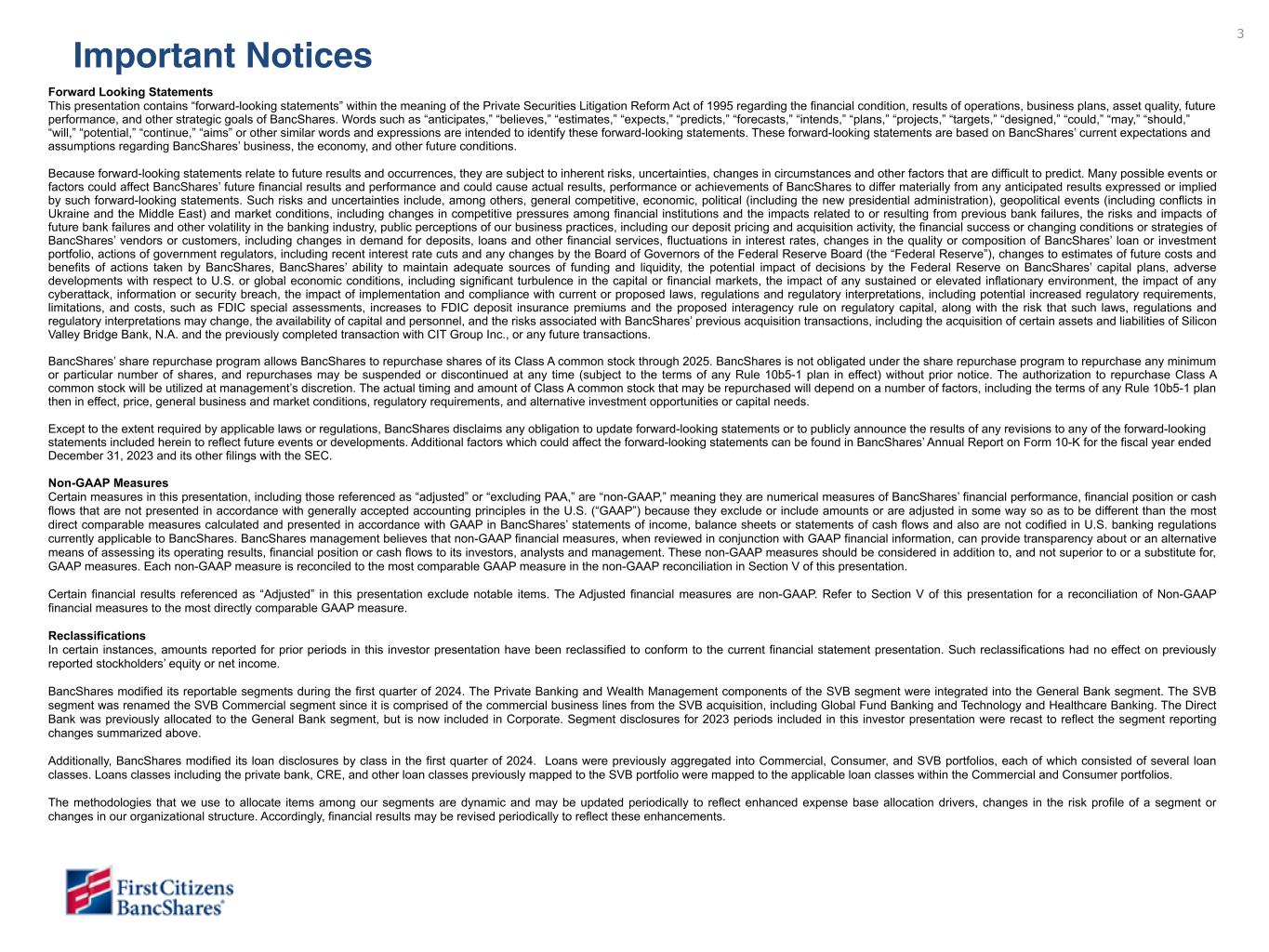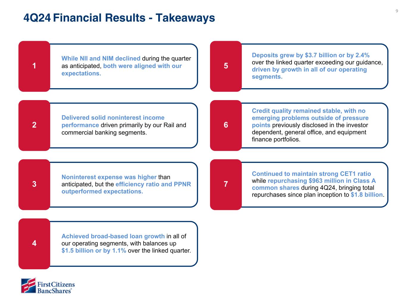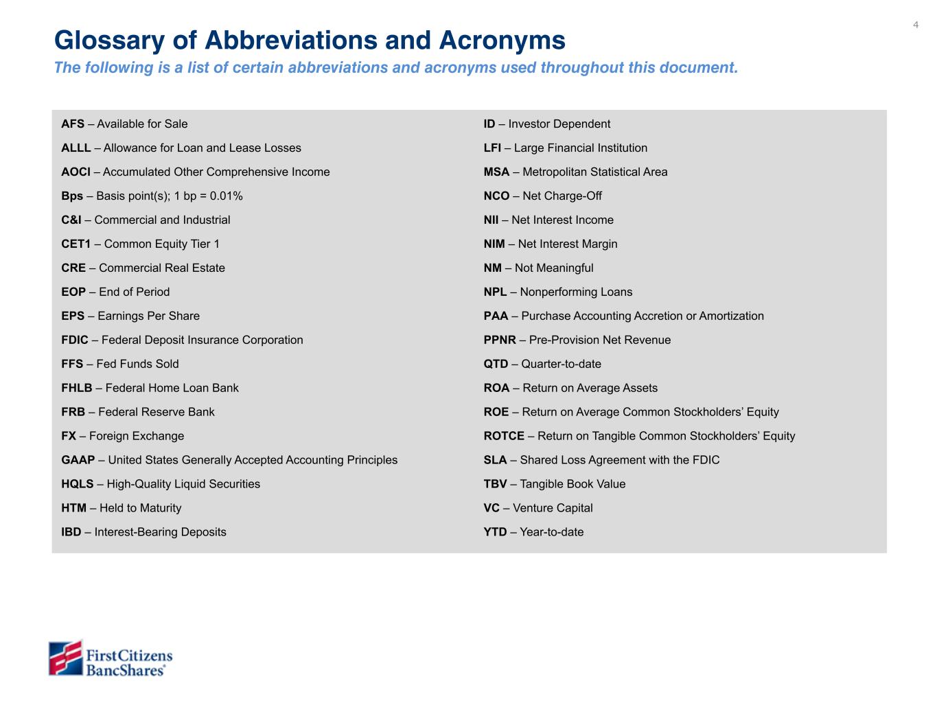 3 Forward Looking Statements This presentation contains “forward-looking statements” within the meaning of the Private Securities Litigation Reform Act of 1995 regarding the financial condition, results of operations, business plans, asset quality, future performance, and other strategic goals of BancShares. Words such as “anticipates,” “believes,” “estimates,” “expects,” “predicts,” “forecasts,” “intends,” “plans,” “projects,” “targets,” “designed,” “could,” “may,” “should,” “will,” “potential,” “continue,” “aims” or other similar words and expressions are intended to identify these forward-looking statements. These forward-looking statements are based on BancShares’ current expectations and assumptions regarding BancShares’ business, the economy, and other future conditions. Because forward-looking statements relate to future results and occurrences, they are subject to inherent risks, uncertainties, changes in circumstances and other factors that are difficult to predict. Many possible events or factors could affect BancShares’ future financial results and performance and could cause actual results, performance or achievements of BancShares to differ materially from any anticipated results expressed or implied by such forward-looking statements. Such risks and uncertainties include, among others, general competitive, economic, political (including the new presidential administration), geopolitical events (including conflicts in Ukraine and the Middle East) and market conditions, including changes in competitive pressures among financial institutions and the impacts related to or resulting from previous bank failures, the risks and impacts of future bank failures and other volatility in the banking industry, public perceptions of our business practices, including our deposit pricing and acquisition activity, the financial success or changing conditions or strategies of BancShares’ vendors or customers, including changes in demand for deposits, loans and other financial services, fluctuations in interest rates, changes in the quality or composition of BancShares’ loan or investment portfolio, actions of government regulators, including recent interest rate cuts and any changes by the Board of Governors of the Federal Reserve Board (the “Federal Reserve”), changes to estimates of future costs and benefits of actions taken by BancShares, BancShares’ ability to maintain adequate sources of funding and liquidity, the potential impact of decisions by the Federal Reserve on BancShares’ capital plans, adverse developments with respect to U.S. or global economic conditions, including significant turbulence in the capital or financial markets, the impact of any sustained or elevated inflationary environment, the impact of any cyberattack, information or security breach, the impact of implementation and compliance with current or proposed laws, regulations and regulatory interpretations, including potential increased regulatory requirements, limitations, and costs, such as FDIC special assessments, increases to FDIC deposit insurance premiums and the proposed interagency rule on regulatory capital, along with the risk that such laws, regulations and regulatory interpretations may change, the availability of capital and personnel, and the risks associated with BancShares’ previous acquisition transactions, including the acquisition of certain assets and liabilities of Silicon Valley Bridge Bank, N.A. and the previously completed transaction with CIT Group Inc., or any future transactions. BancShares’ share repurchase program allows BancShares to repurchase shares of its Class A common stock through 2025. BancShares is not obligated under the share repurchase program to repurchase any minimum or particular number of shares, and repurchases may be suspended or discontinued at any time (subject to the terms of any Rule 10b5-1 plan in effect) without prior notice. The authorization to repurchase Class A common stock will be utilized at management’s discretion. The actual timing and amount of Class A common stock that may be repurchased will depend on a number of factors, including the terms of any Rule 10b5-1 plan then in effect, price, general business and market conditions, regulatory requirements, and alternative investment opportunities or capital needs. Except to the extent required by applicable laws or regulations, BancShares disclaims any obligation to update forward-looking statements or to publicly announce the results of any revisions to any of the forward-looking statements included herein to reflect future events or developments. Additional factors which could affect the forward-looking statements can be found in BancShares’ Annual Report on Form 10-K for the fiscal year ended December 31, 2023 and its other filings with the SEC. Non-GAAP Measures Certain measures in this presentation, including those referenced as “adjusted” or “excluding PAA,” are “non-GAAP,” meaning they are numerical measures of BancShares’ financial performance, financial position or cash flows that are not presented in accordance with generally accepted accounting principles in the U.S. (“GAAP”) because they exclude or include amounts or are adjusted in some way so as to be different than the most direct comparable measures calculated and presented in accordance with GAAP in BancShares’ statements of income, balance sheets or statements of cash flows and also are not codified in U.S. banking regulations currently applicable to BancShares. BancShares management believes that non-GAAP financial measures, when reviewed in conjunction with GAAP financial information, can provide transparency about or an alternative means of assessing its operating results, financial position or cash flows to its investors, analysts and management. These non-GAAP measures should be considered in addition to, and not s
