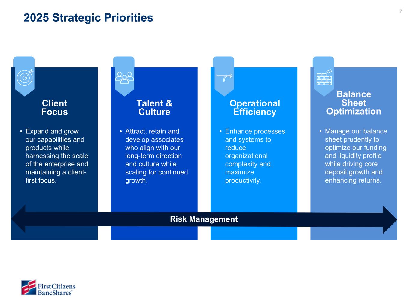 7 2025 Strategic Priorities • Expand and grow our capabilities and products while harnessing the scale of the enterprise and maintaining a client- first focus. Client Focus • Attract, retain and develop associates who align with our long-term direction and culture while scaling for continued growth. Talent & Culture • Enhance processes and systems to reduce organizational complexity and maximize productivity. Operational Efficiency • Manage our balance sheet prudently to optimize our funding and liquidity profile while driving core deposit growth and enhancing returns. Balance Sheet Optimization Risk Management
