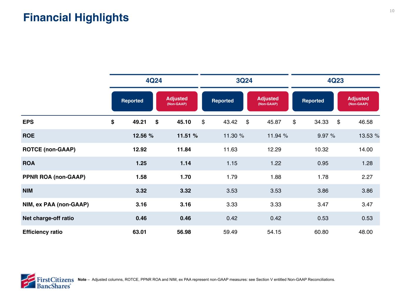 9 4Q24 Financial Results - Takeaways Quarter-to-date Year-to-date Mar 23 Dec 22 Mar 22 Mar 23 Dec 21 EPS $ 16.67 $ 20.94 $ 19.25 $ 20.77 $ 12.09 $ 12.82 $ 67.40 $ 77.24 $ 53.88 $ 51.88 ROE 11.05 % 13.89 % 12.49 % 13.47 % 10.96 % 11.63 % 11.15 % 12.78 % 12.84 % 12.36 % ROTCE 11.70 % 14.71 % 13.17 % 14.20 % 12.00 % 12.72 % 11.78 % 13.50 % 14.12 % 13.60 % ROA 0.93 % 1.15 % 1.16 % 1.24 % 1.20 % 1.09 % 1.01 % 1.15 % 1.33 % 1.10 % PPNR ROA 1.70 % 1.81 % 1.72 % 1.86 % 1.33 % 1.17 % 1.84 % 1.64 % 1.41 % 1.11 % NIM 3.36 % 3.36 % 3.40 % 3.40 % 2.56 % 2.56 % 3.14 % 3.14 % 2.55 % 2.55 % Net charge-off ratio 0.14 % 0.14 % 0.10 % 0.10 % 0.04 % 0.04 % 0.12 % 0.12 % 0.08 % 0.08 % Efficiency ratio 61.74 % 54.08 % 61.91 % 53.32 % 65.40 % 62.51 % 60.50 % 56.40 % 64.43 % 64.34 % Reported Adjusted (Non-GAAP) Reported Adjusted (Non-GAAP) Reported Adjusted (Non-GAAP) Reported Adjusted (Non-GAAP) Reported Adjusted (Non-GAAP) While NII and NIM declined during the quarter as anticipated, both were aligned with our expectations. 1 Continued to maintain strong CET1 ratio while repurchasing $963 million in Class A common shares during 4Q24, bringing total repurchases since plan inception to $1.8 billion. 7 Credit quality remained stable, with no emerging problems outside of pressure points previously disclosed in the investor dependent, general office, and equipment finance portfolios. 6 Delivered solid noninterest income performance driven primarily by our Rail and commercial banking segments. 2 Noninterest expense was higher than anticipated, but the efficiency ratio and PPNR outperformed expectations. 3 Deposits grew by $3.7 billion or by 2.4% over the linked quarter exceeding our guidance, driven by growth in all of our operating segments. 5 Achieved broad-based loan growth in all of our operating segments, with balances up $1.5 billion or by 1.1% over the linked quarter. 4