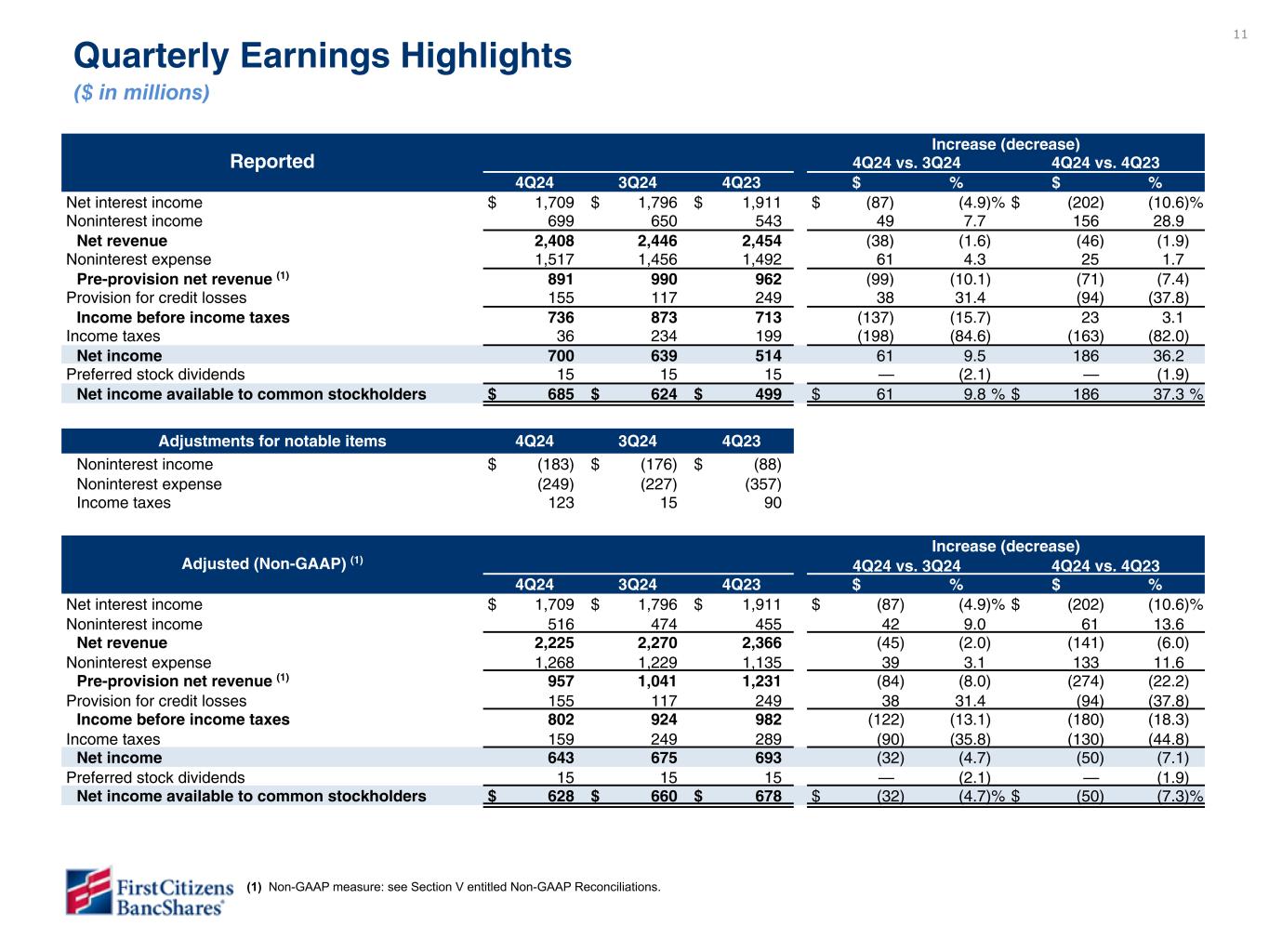 10 4Q24 3Q24 4Q23 EPS $ 49.21 $ 45.10 $ 43.42 $ 45.87 $ 34.33 $ 46.58 ROE 12.56 % 11.51 % 11.30 % 11.94 % 9.97 % 13.53 % ROTCE (non-GAAP) 12.92 11.84 11.63 12.29 10.32 14.00 ROA 1.25 1.14 1.15 1.22 0.95 1.28 PPNR ROA (non-GAAP) 1.58 1.70 1.79 1.88 1.78 2.27 NIM 3.32 3.32 3.53 3.53 3.86 3.86 NIM, ex PAA (non-GAAP) 3.16 3.16 3.33 3.33 3.47 3.47 Net charge-off ratio 0.46 0.46 0.42 0.42 0.53 0.53 Efficiency ratio 63.01 56.98 59.49 54.15 60.80 48.00 Reported Adjusted (Non-GAAP) Reported Adjusted (Non-GAAP) Reported Adjusted (Non-GAAP) Financial Highlights Quarter-to-date Year-to-date Mar 23 Dec 22 Mar 22 Mar 23 Dec 21 EPS $ 16.67 $ 20.94 $ 19.25 $ 20.77 $ 12.09 $ 12.82 $ 67.40 $ 77.24 $ 53.88 $ 51.88 ROE 11.05 % 13.89 % 12.49 % 13.47 % 10.96 % 11.63 % 11.15 % 12.78 % 12.84 % 12.36 % ROTCE 11.70 % 14.71 % 13.17 % 14.20 % 12.00 % 12.72 % 11.78 % 13.50 % 14.12 % 13.60 % ROA 0.93 % 1.15 % 1.16 % 1.24 % 1.20 % 1.09 % 1.01 % 1.15 % 1.33 % 1.10 % PPNR ROA 1.70 % 1.81 % 1.72 % 1.86 % 1.33 % 1.17 % 1.84 % 1.64 % 1.41 % 1.11 % NIM 3.36 % 3.36 % 3.40 % 3.40 % 2.56 % 2.56 % 3.14 % 3.14 % 2.55 % 2.55 % Net charge-off ratio 0.14 % 0.14 % 0.10 % 0.10 % 0.04 % 0.04 % 0.12 % 0.12 % 0.08 % 0.08 % Efficiency ratio 61.74 % 54.08 % 61.91 % 53.32 % 65.40 % 62.51 % 60.50 % 56.40 % 64.43 % 64.34 % Reported Adjusted (Non-GAAP) Reported Adjusted (Non-GAAP) Reported Adjusted (Non-GAAP) Reported Adjusted (Non-GAAP) Reported Adjusted (Non-GAAP) Note – Adjusted columns, ROTCE, PPNR ROA and NIM, ex PAA represent non-GAAP measures: see Section V entitled Non-GAAP Reconciliations.