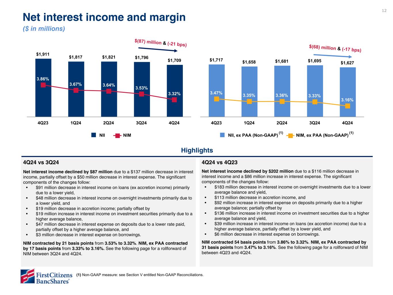 11 Reported Increase (decrease) 4Q24 vs. 3Q24 4Q24 vs. 4Q23 4Q24 3Q24 4Q23 $ % $ % Net interest income $ 1,709 $ 1,796 $ 1,911 $ (87) (4.9) % $ (202) (10.6) % Noninterest income 699 650 543 49 7.7 156 28.9 Net revenue 2,408 2,446 2,454 (38) (1.6) (46) (1.9) Noninterest expense 1,517 1,456 1,492 61 4.3 25 1.7 Pre-provision net revenue (1) 891 990 962 (99) (10.1) (71) (7.4) Provision for credit losses 155 117 249 38 31.4 (94) (37.8) Income before income taxes 736 873 713 (137) (15.7) 23 3.1 Income taxes 36 234 199 (198) (84.6) (163) (82.0) Net income 700 639 514 61 9.5 186 36.2 Preferred stock dividends 15 15 15 — (2.1) — (1.9) Net income available to common stockholders $ 685 $ 624 $ 499 $ 61 9.8 % $ 186 37.3 % Adjustments for notable items 4Q24 3Q24 4Q23 Noninterest income $ (183) $ (176) $ (88) Noninterest expense (249) (227) (357) Income taxes 123 15 90 Adjusted (Non-GAAP) (1) Increase (decrease) 4Q24 vs. 3Q24 4Q24 vs. 4Q23 4Q24 3Q24 4Q23 $ % $ % Net interest income $ 1,709 $ 1,796 $ 1,911 $ (87) (4.9) % $ (202) (10.6) % Noninterest income 516 474 455 42 9.0 61 13.6 Net revenue 2,225 2,270 2,366 (45) (2.0) (141) (6.0) Noninterest expense 1,268 1,229 1,135 39 3.1 133 11.6 Pre-provision net revenue (1) 957 1,041 1,231 (84) (8.0) (274) (22.2) Provision for credit losses 155 117 249 38 31.4 (94) (37.8) Income before income taxes 802 924 982 (122) (13.1) (180) (18.3) Income taxes 159 249 289 (90) (35.8) (130) (44.8) Net income 643 675 693 (32) (4.7) (50) (7.1) Preferred stock dividends 15 15 15 — (2.1) — (1.9) Net income available to common stockholders $ 628 $ 660 $ 678 $ (32) (4.7) % $ (50) (7.3) % Quarterly Earnings Highlights ($ in millions) (1) Non-GAAP measure: see Section V entitled Non-GAAP Reconciliations.