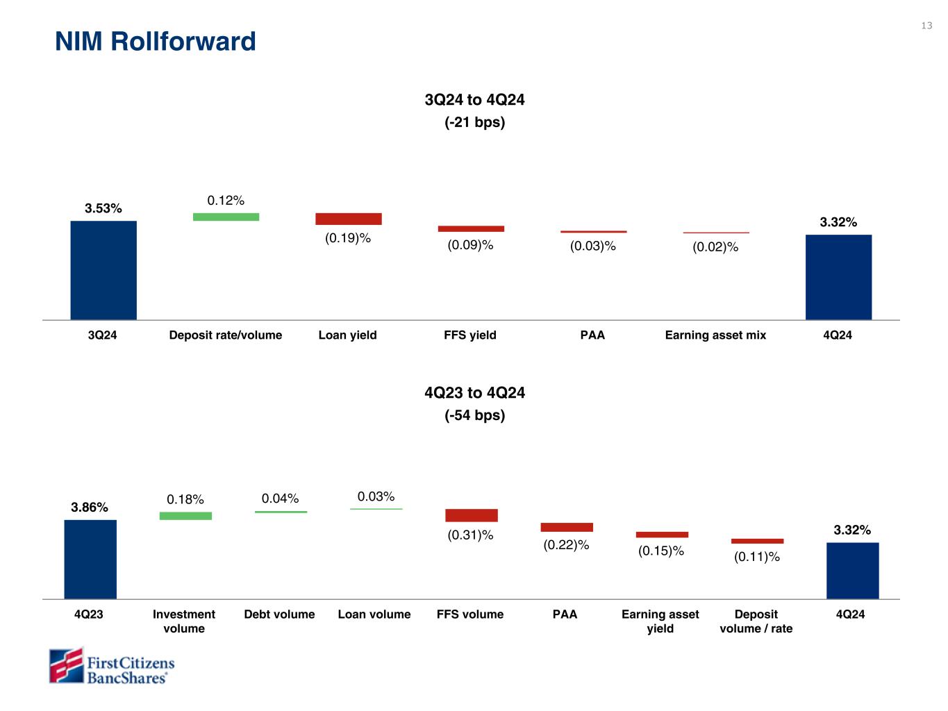 12 $1,717 $1,658 $1,681 $1,695 $1,627 3.47% 3.35% 3.36% 3.33% 3.16% NII, ex PAA (Non-GAAP) NIM, ex PAA (Non-GAAP) 4Q23 1Q24 2Q24 3Q24 4Q24 $1,911 $1,817 $1,821 $1,796 $1,709 3.86% 3.67% 3.64% 3.53% 3.32% NII NIM 4Q23 1Q24 2Q24 3Q24 4Q24 $2,441 $2,946 2.55% 3.14% YTD Dec 21 YTD Dec 22 YTD December 2022 vs YTD December 2021 Net interest income increased by $505 million due to a $483 million increase in interest income and a $22 million decrease in interest expense. The change in net interest income was primarily due to the following: ◦ $256 million increase on interest income on loans due to a higher yield and growth offset by lower SBA- PPP interest and fee income and lower accretion income, ◦ $138 million increase in interest income on investment securities due to higher yield and average balance, ◦ $118 million decline in interest expense on borrowings due to a lower rate and average balance, ◦ $89 million increase in interest income on overnight investments due to a higher yield despite a lower average balance; partially offset by a ◦ $96 million increase in interest expense on deposits due to a higher rate paid. NIM expanded from 2.55% to 3.14%. $505 million & 59 bps Highlights $(87) million & (-21 bps) Net interest income and margin ($ in millions) $(68) million & (-17 bps) 4Q24 vs 3Q24 Net interest income declined by $87 million due to a $137 million decrease in interest income, partially offset by a $50 million decrease in interest expense. The significant components of the changes follow: • $91 million decrease in interest income on loans (ex accretion income) primarily due to a lower yield, • $48 million decrease in interest income on overnight investments primarily due to a lower yield, and • $19 million decrease in accretion income; partially offset by • $19 million increase in interest income on investment securities primarily due to a higher average balance, • $47 million decrease in interest expense on deposits due to a lower rate paid, partially offset by a higher average balance, and • $3 million decrease in interest expense on borrowings. NIM contracted by 21 basis points from 3.53% to 3.32%. NIM, ex PAA contracted by 17 basis points from 3.33% to 3.16%. See the following page for a rollforward of NIM between 3Q24 and 4Q24. 4Q24 vs 4Q23 Net interest income declined by $202 million due to a $116 million decrease in interest income and a $86 million increase in interest expense. The significant components of the changes follow: • $183 million decrease in interest income on overnight investments due to a lower average balance and yield, • $113 million decrease in accretion income, and • $92 million increase in interest expense on deposits primarily due to a higher average balance; partially offset by • $136 million increase in interest income on investment securities due to a higher average balance and yield, • $39 million increase in interest income on loans (ex accretion income) due to a higher average balance, partially offset by a lower yield, and • $6 million decrease in interest expense on borrowings. NIM contracted 54 basis points from 3.86% to 3.32%. NIM, ex PAA contracted by 31 basis points from 3.47% to 3.16%. See the following page for a rollforward of NIM between 4Q23 and 4Q24. (1) Non-GAAP measure: see Section V entitled Non-GAAP Reconciliations. (1) (1)