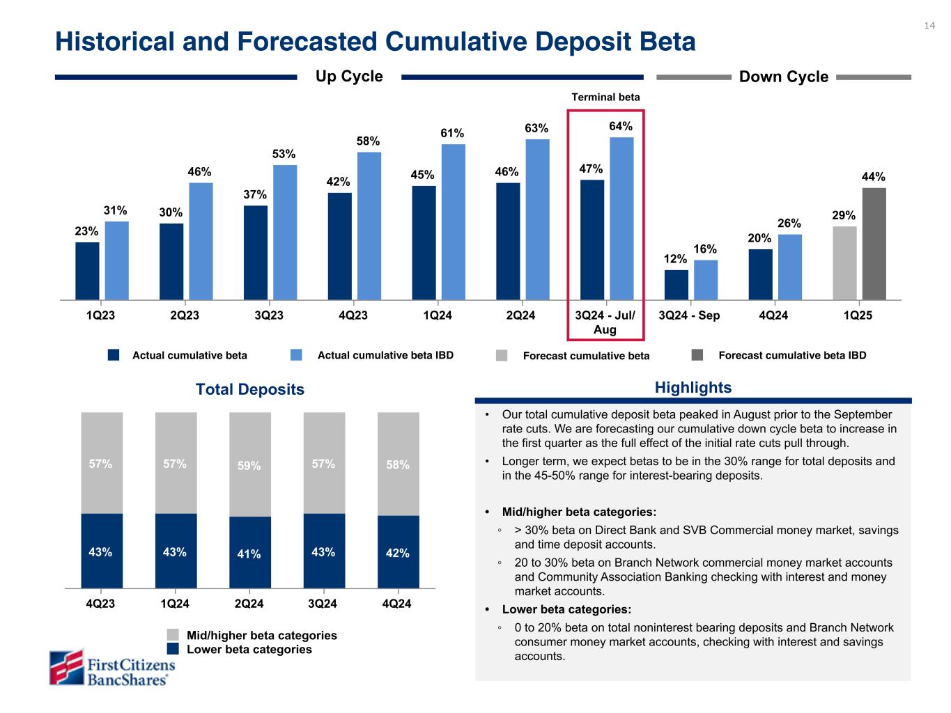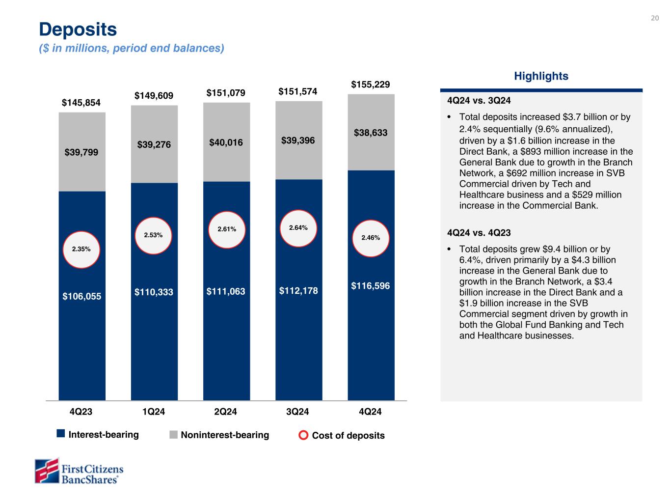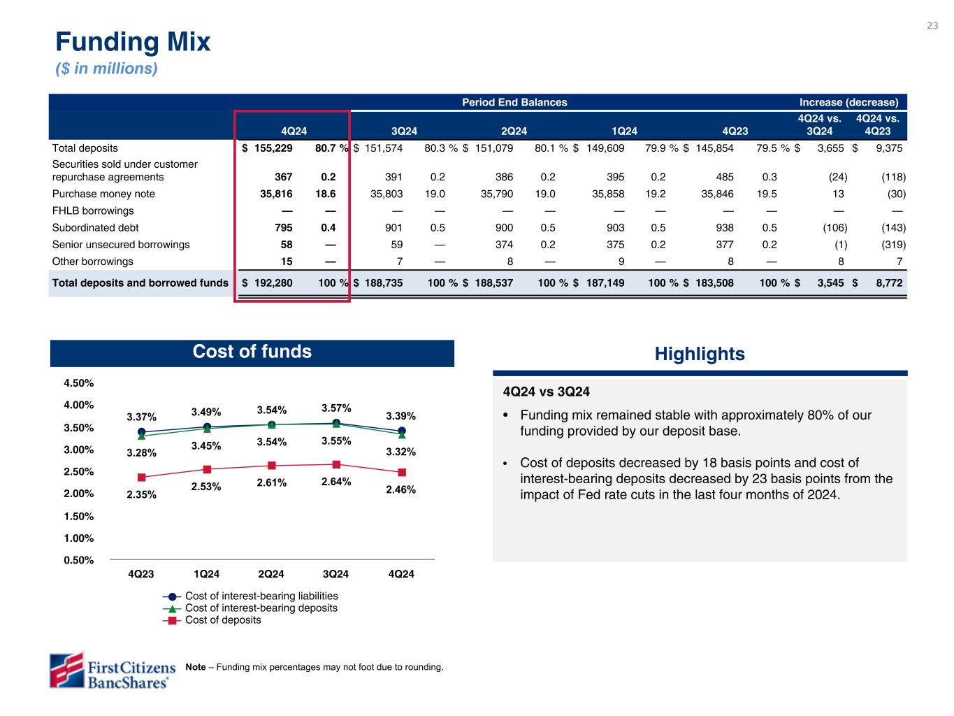 23 3.37% 3.49% 3.54% 3.57% 3.39% 3.28% 3.45% 3.54% 3.55% 3.32% 2.35% 2.53% 2.61% 2.64% 2.46% Cost of interest-bearing liabilities Cost of interest-bearing deposits Cost of deposits 4Q23 1Q24 2Q24 3Q24 4Q24 0.50% 1.00% 1.50% 2.00% 2.50% 3.00% 3.50% 4.00% 4.50% Cost of funds Additional sources of liquidity Categories $ in millions FHLB $ 9,218 FRB 4,203 Line of credit 100 Total $ 13,521 Period End Balances Increase (decrease) 4Q24 3Q24 2Q24 1Q24 4Q23 4Q24 vs. 3Q24 4Q24 vs. 4Q23 Total deposits $ 155,229 80.7 % $ 151,574 80.3 % $ 151,079 80.1 % $ 149,609 79.9 % $ 145,854 79.5 % $ 3,655 $ 9,375 Securities sold under customer repurchase agreements 367 0.2 391 0.2 386 0.2 395 0.2 485 0.3 (24) (118) Purchase money note 35,816 18.6 35,803 19.0 35,790 19.0 35,858 19.2 35,846 19.5 13 (30) FHLB borrowings — — — — — — — — — — — — Subordinated debt 795 0.4 901 0.5 900 0.5 903 0.5 938 0.5 (106) (143) Senior unsecured borrowings 58 — 59 — 374 0.2 375 0.2 377 0.2 (1) (319) Other borrowings 15 — 7 — 8 — 9 — 8 — 8 7 Total deposits and borrowed funds $ 192,280 100 % $ 188,735 100 % $ 188,537 100 % $ 187,149 100 % $ 183,508 100 % $ 3,545 $ 8,772 Funding Mix ($ in millions) Highlights 4Q24 vs 3Q24 • Funding mix remained stable with approximately 80% of our funding provided by our deposit base. • Cost of deposits decreased by 18 basis points and cost of interest-bearing deposits decreased by 23 basis points from the impact of Fed rate cuts in the last four months of 2024. Note – Funding mix percentages may not foot due to rounding. To be updated in subsequent draft