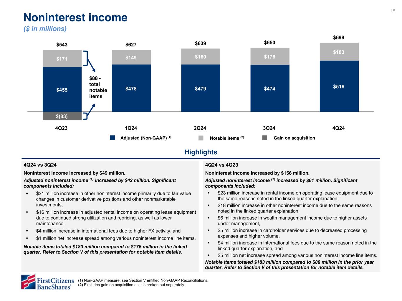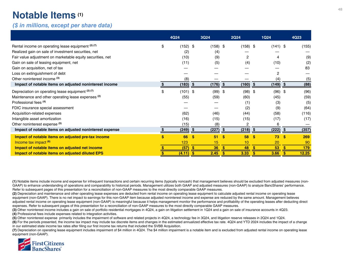 48 1Q23 4Q22 1Q22 Rental income on operating lease equipment (2) $ (152) $ (158) $ (155) Realized gain on sale of investment securities available for sale, net (2) (4) — Fair value adjustment on marketable equity securities, net (10) (9) (9) Gain on sale of leasing equipment, net (11) (5) (2) Gain on acquisition — — 83 Gain on extinguishment of debt — — — Other noninterest income(3) (8) — (5) Impact on adjusted noninterest income $ (183) $ (176) $ (88) Depreciation on operating lease equipment (2) $ (101) $ (99) $ (96) Maintenance and other operating lease expenses (2) (55) (59) (59) Salaries and benefits — — — Acquisition-related expenses (62) (46) (116) Intangible asset amortization (16) (15) (17) Other noninterest expense (4) (15) (8) — Impact on adjusted noninterest expense $ (249) $ (227) $ (357) CECL Day 2 provision and reserve for unfunded commitments — (716) — Provision for credit losses- investment securities available for sale — (4) — Provision for credit losses - total adjustments $ — $ — $ — Impact on adjusted pre-tax income $ 134 $ 173 $ 38 Income tax impact (5) (6) 123 15 90 Impact on adjusted net income $ (57) $ 36 $ 179 Impact on adjusted diluted EPS $ (4.11) $ 2.45 12.25 Notable Items (1) ($ in millions, except per share data) 4Q24 3Q24 2Q24 1Q24 4Q23 Rental income on operating lease equipment (2) (7) $ (152) $ (158) $ (158) $ (141) $ (155) Realized gain on sale of investment securities, net (2) (4) — — — Fair value adjustment on marketable equity securities, net (10) (9) 2 4 (9) Gain on sale of leasing equipment, net (11) (5) (4) (10) (2) Gain on acquisition, net of tax — — — — 83 Loss on extinguishment of debt — — — 2 — Other noninterest income (3) (8) — — (4) (5) Impact of notable items on adjusted noninterest income $ (183) $ (176) $ (160) $ (149) $ (88) Depreciation on operating lease equipment (2) (7) $ (101) $ (99) $ (98) $ (96) $ (96) Maintenance and other operating lease expenses (2) (55) (59) (60) (45) (59) Professional fees (4) — — (1) (3) (5) FDIC insurance special assessment — — (2) (9) (64) Acquisition-related expenses (62) (46) (44) (58) (116) Intangible asset amortization (16) (15) (15) (17) (17) Other noninterest expense (5) (15) (8) 2 6 — Impact of notable items on adjusted noninterest expense $ (249) $ (227) $ (218) $ (222) $ (357) Impact of notable items on adjusted pre-tax income $ 66 $ 51 $ 58 $ 73 $ 269 Income tax impact (6) 123 15 10 20 90 Impact of notable items on adjusted net income $ (57) $ 36 $ 48 $ 53 $ 179 Impact of notable items on adjusted diluted EPS $ (4.11) $ 2.45 $ 3.33 $ 3.66 $ 12.25 (1) Notable items include income and expense for infrequent transactions and certain recurring items (typically noncash) that management believes should be excluded from adjusted measures (non- GAAP) to enhance understanding of operations and comparability to historical periods. Management utilizes both GAAP and adjusted measures (non-GAAP) to analyze BancShares’ performance. Refer to subsequent pages of this presentation for a reconciliation of non-GAAP measures to the most directly comparable GAAP measures. (2) Depreciation and maintenance and other operating lease expenses are deducted from rental income on operating lease equipment to calculate adjusted rental income on operating lease equipment (non-GAAP). There is no net impact to earnings for this non-GAAP item because adjusted noninterest income and expense are reduced by the same amount. Management believes adjusted rental income on operating lease equipment (non-GAAP) is meaningful because it helps management monitor the performance and profitability of the operating leases after deducting direct expenses. Refer to subsequent pages of this presentation for a reconciliation of non-GAAP measures to the most directly comparable GAAP measures. (3) Other noninterest income includes a gain on sale of portfolio residential mortgages in 4Q24, a gain on litigation settlement in 1Q24 and a gain on sale of insurance accounts in 4Q23. (4) Professional fees include expenses related to integration activities. (5) Other noninterest expense primarily includes the impairment of software and related projects in 4Q24, a technology fee in 3Q24, and litigation reserve releases in 2Q24 and 1Q24. (6) For the periods presented, the income tax impact may include tax discrete items and changes in the estimated annualized effective tax rate. 4Q24 and YTD 2024 includes the impact of a change in our estimated state income tax rates after filing our first income tax returns that included the SVBB Acquisition. (7) Depreciation on operating lease equipment includes impairment of $4 million in 4Q24. The $4 million impairment is a notable item and is excluded from adjusted rental income on operating lease equipment (non-GAAP).
