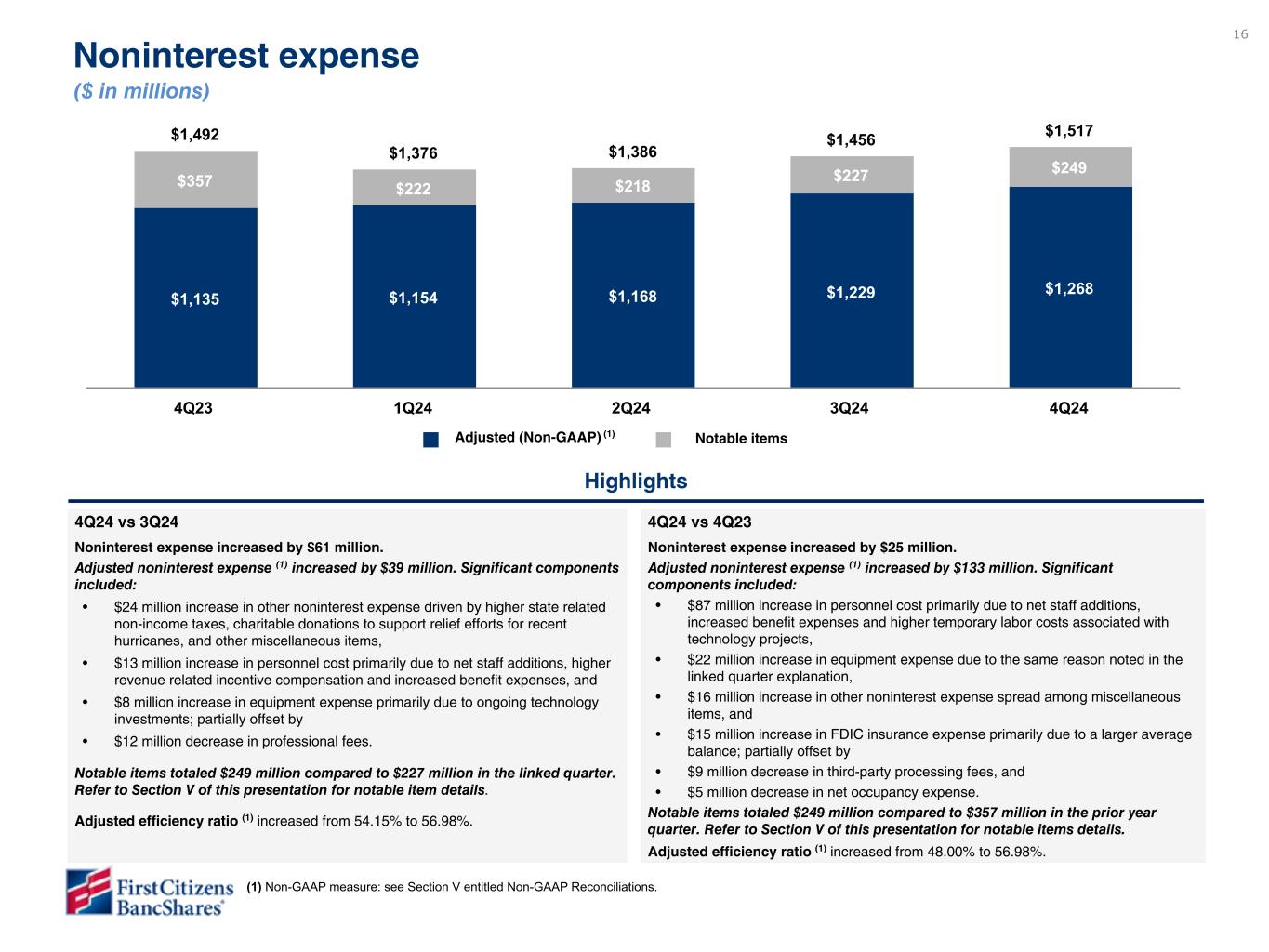 15 $543 $627 $639 $650 $699 $455 $478 $479 $474 $516 $171 $149 $160 $176 $183 $(83) 4Q23 1Q24 2Q24 3Q24 4Q24 $295 $183 1Q23 SVB contribution $1,940 $2,136 $996 $1,141 $944 $995 YTD Dec 21 YTD Dec 22 4Q24 vs 3Q24 Noninterest income increased by $49 million. Adjusted noninterest income (1) increased by $42 million. Significant components included: • $21 million increase in other noninterest income primarily due to fair value changes in customer derivative positions and other nonmarketable investments, • $16 million increase in adjusted rental income on operating lease equipment due to continued strong utilization and repricing, as well as lower maintenance, • $4 million increase in international fees due to higher FX activity, and • $1 million net increase spread among various noninterest income line items. Notable items totaled $183 million compared to $176 million in the linked quarter. Refer to Section V of this presentation for notable item details. YTD22 vs YTD21 Noninterest income increased $196 million. Significant components of the change were: ◦ Rental income on operating leases increased $91 million due to the same reasons as in the linked quarter. Expenses on operating lease equipment declined $16 million resulting in a $107 million increase in adjusted rental income. ◦ Cardholder services income, net increased $15 million due to higher volume and fee income and other service charges increased $14 million, primarily due to higher capital markets and portfolio servicing fees. ◦ Wealth management services increased $13 million due to increased brokerage transactions and higher assets under management. ◦ Other noninterest income increased $63 million spread among various line items, including a $431 million bargain purchase gain, partially offset by a $147 million decline in investment gains and a $188 million decline in gains on asset and loan sales. Highlights Noninterest income ($ in millions) Core: ### increase 4Q24 vs 4Q23 Noninterest income increased by $156 million. Adjusted noninterest income (1) increased by $61 million. Significant components included: • $23 million increase in rental income on operating lease equipment due to the same reasons noted in the linked quarter explanation, • $18 million increase in other noninterest income due to the same reasons noted in the linked quarter explanation, • $6 million increase in wealth management income due to higher assets under management, • $5 million increase in cardholder services due to decreased processing expenses and higher volume, • $4 million increase in international fees due to the same reason noted in the linked quarter explanation, and • $5 million net increase spread among various noninterest income line items. Notable items totaled $183 million compared to $88 million in the prior year quarter. Refer to Section V of this presentation for notable item details. Adjusted (Non-GAAP) (1) Notable items (2) Gain on acquisition $88 - total notable items $183 - total notable items $516 - total adjusted (Non-GAAP) (1) (1) Non-GAAP measure: see Section V entitled Non-GAAP Reconciliations. (2) Excludes gain on acquisition as it is broken out separately. $88 - total notable items