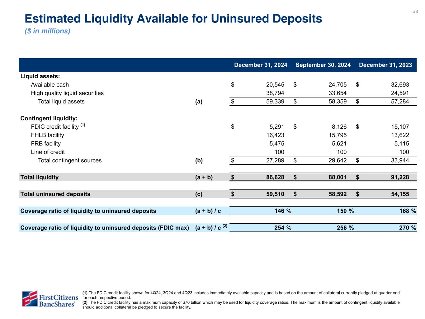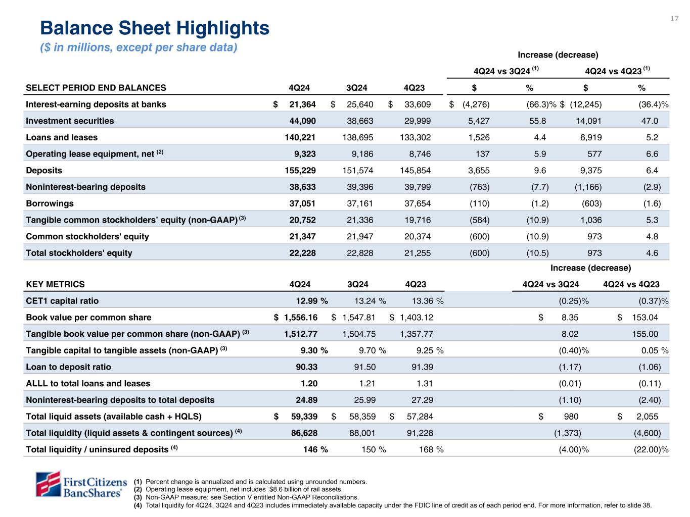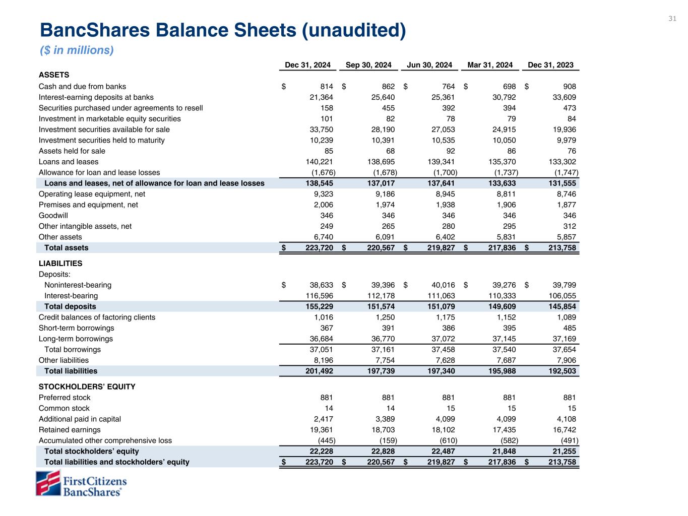 31 Dec 31, 2024 Sep 30, 2024 Jun 30, 2024 Mar 31, 2024 Dec 31, 2023 ASSETS Cash and due from banks $ 814 $ 862 $ 764 $ 698 $ 908 Interest-earning deposits at banks 21,364 25,640 25,361 30,792 33,609 Securities purchased under agreements to resell 158 455 392 394 473 Investment in marketable equity securities 101 82 78 79 84 Investment securities available for sale 33,750 28,190 27,053 24,915 19,936 Investment securities held to maturity 10,239 10,391 10,535 10,050 9,979 Assets held for sale 85 68 92 86 76 Loans and leases 140,221 138,695 139,341 135,370 133,302 Allowance for loan and lease losses (1,676) (1,678) (1,700) (1,737) (1,747) Loans and leases, net of allowance for loan and lease losses 138,545 137,017 137,641 133,633 131,555 Operating lease equipment, net 9,323 9,186 8,945 8,811 8,746 Premises and equipment, net 2,006 1,974 1,938 1,906 1,877 Goodwill 346 346 346 346 346 Other intangible assets, net 249 265 280 295 312 Other assets 6,740 6,091 6,402 5,831 5,857 Total assets $ 223,720 $ 220,567 $ 219,827 $ 217,836 $ 213,758 LIABILITIES Deposits: Noninterest-bearing $ 38,633 $ 39,396 $ 40,016 $ 39,276 $ 39,799 Interest-bearing 116,596 112,178 111,063 110,333 106,055 Total deposits 155,229 151,574 151,079 149,609 145,854 Credit balances of factoring clients 1,016 1,250 1,175 1,152 1,089 Short-term borrowings 367 391 386 395 485 Long-term borrowings 36,684 36,770 37,072 37,145 37,169 Total borrowings 37,051 37,161 37,458 37,540 37,654 Other liabilities 8,196 7,754 7,628 7,687 7,906 Total liabilities 201,492 197,739 197,340 195,988 192,503 STOCKHOLDERS’ EQUITY Preferred stock 881 881 881 881 881 Common stock 14 14 15 15 15 Additional paid in capital 2,417 3,389 4,099 4,099 4,108 Retained earnings 19,361 18,703 18,102 17,435 16,742 Accumulated other comprehensive loss (445) (159) (610) (582) (491) Total stockholders’ equity 22,228 22,828 22,487 21,848 21,255 Total liabilities and stockholders’ equity $ 223,720 $ 220,567 $ 219,827 $ 217,836 $ 213,758 BancShares Balance Sheets (unaudited) ($ in millions)