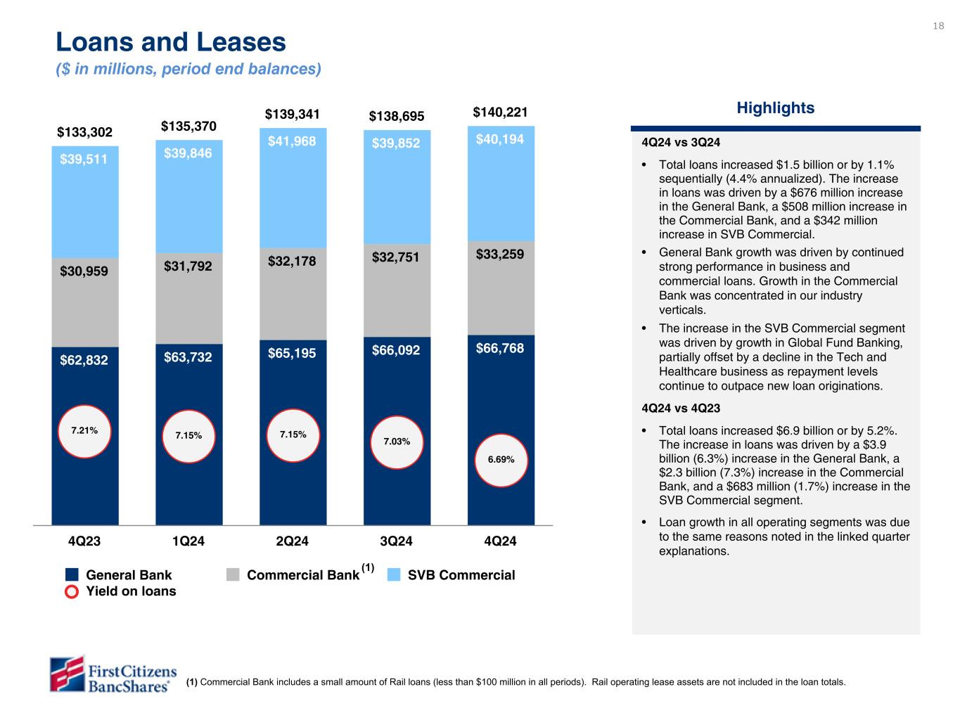 17 17 Increase (decrease) 4Q24 vs 3Q24 4Q24 vs 4Q23 SELECT PERIOD END BALANCES 4Q24 3Q24 4Q23 $ % $ % Interest-earning deposits at banks $ 21,364 $ 25,640 $ 33,609 $ (4,276) (66.3) % $ (12,245) (36.4) % Investment securities 44,090 38,663 29,999 5,427 55.8 14,091 47.0 Loans and leases 140,221 138,695 133,302 1,526 4.4 6,919 5.2 Operating lease equipment, net (2) 9,323 9,186 8,746 137 5.9 577 6.6 Deposits 155,229 151,574 145,854 3,655 9.6 9,375 6.4 Noninterest-bearing deposits 38,633 39,396 39,799 (763) (7.7) (1,166) (2.9) Borrowings 37,051 37,161 37,654 (110) (1.2) (603) (1.6) Tangible common stockholders’ equity (non-GAAP) (3) 20,752 21,336 19,716 (584) (10.9) 1,036 5.3 Common stockholders' equity 21,347 21,947 20,374 (600) (10.9) 973 4.8 Total stockholders' equity 22,228 22,828 21,255 (600) (10.5) 973 4.6 Increase (decrease) KEY METRICS 4Q24 3Q24 4Q23 4Q24 vs 3Q24 4Q24 vs 4Q23 CET1 capital ratio 12.99 % 13.24 % 13.36 % (0.25) % (0.37) % Book value per common share $ 1,556.16 $ 1,547.81 $ 1,403.12 $ 8.35 $ 153.04 Tangible book value per common share (non-GAAP) (3) 1,512.77 1,504.75 1,357.77 8.02 155.00 Tangible capital to tangible assets (non-GAAP) (3) 9.30 % 9.70 % 9.25 % (0.40) % 0.05 % Loan to deposit ratio 90.33 91.50 91.39 (1.17) (1.06) ALLL to total loans and leases 1.20 1.21 1.31 (0.01) (0.11) Noninterest-bearing deposits to total deposits 24.89 25.99 27.29 (1.10) (2.40) Total liquid assets (available cash + HQLS) $ 59,339 $ 58,359 $ 57,284 $ 980 $ 2,055 Total liquidity (liquid assets & contingent sources) (4) 86,628 88,001 91,228 (1,373) (4,600) Total liquidity / uninsured deposits (4) 146 % 150 % 168 % (4.00) % (22.00) % Balance Sheet Highlights ($ in millions, except per share data) (1) (1) (1) Percent change is annualized and is calculated using unrounded numbers. (2) Operating lease equipment, net includes $8.6 billion of rail assets. (3) Non-GAAP measure: see Section V entitled Non-GAAP Reconciliations. (4) Total liquidity for 4Q24, 3Q24 and 4Q23 includes immediately available capacity under the FDIC line of credit as of each period end. For more information, refer to slide 38.