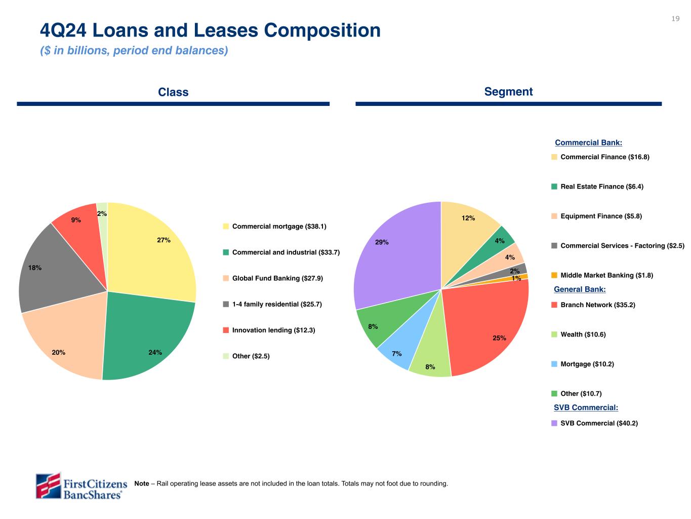 18 $133,302 $135,370 $139,341 $138,695 $140,221 $62,832 $63,732 $65,195 $66,092 $66,768 $30,959 $31,792 $32,178 $32,751 $33,259 $39,511 $39,846 $41,968 $39,852 $40,194 General Bank Commercial Bank SVB Commercial Yield on loans 4Q23 1Q24 2Q24 3Q24 4Q24 Highlights 4Q24 vs 3Q24 • Total loans increased $1.5 billion or by 1.1% sequentially (4.4% annualized). The increase in loans was driven by a $676 million increase in the General Bank, a $508 million increase in the Commercial Bank, and a $342 million increase in SVB Commercial. • General Bank growth was driven by continued strong performance in business and commercial loans. Growth in the Commercial Bank was concentrated in our industry verticals. • The increase in the SVB Commercial segment was driven by growth in Global Fund Banking, partially offset by a decline in the Tech and Healthcare business as repayment levels continue to outpace new loan originations. 4Q24 vs 4Q23 • Total loans increased $6.9 billion or by 5.2%. The increase in loans was driven by a $3.9 billion (6.3%) increase in the General Bank, a $2.3 billion (7.3%) increase in the Commercial Bank, and a $683 million (1.7%) increase in the SVB Commercial segment. • Loan growth in all operating segments was due to the same reasons noted in the linked quarter explanations. Loans and Leases ($ in millions, period end balances) 7.03% 7.15%7.15%7.21% 6.69% 10.1% (1) (1) Commercial Bank includes a small amount of Rail loans (less than $100 million in all periods). Rail operating lease assets are not included in the loan totals.