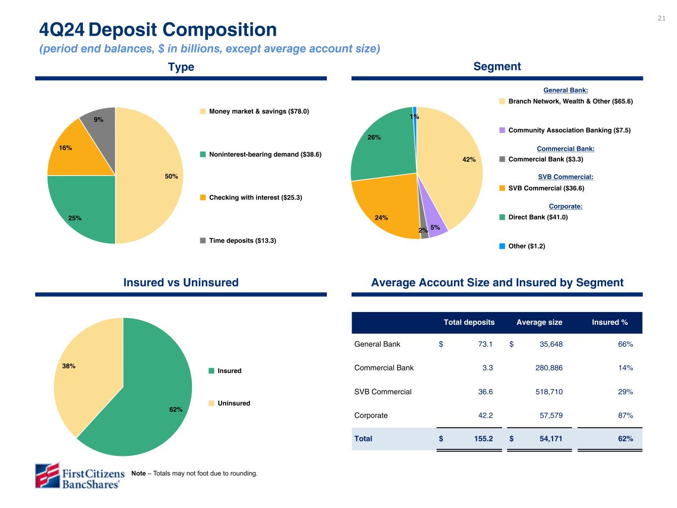 20 $145,854 $149,609 $151,079 $151,574 $155,229 $106,055 $110,333 $111,063 $112,178 $116,596 $39,799 $39,276 $40,016 $39,396 $38,633 4Q23 1Q24 2Q24 3Q24 4Q24 2.64% 2.61% 2.53% 2.35% 2.46% Highlights Interest-bearing Noninterest-bearing Cost of deposits Deposits ($ in millions, period end balances) $140,050 $66,686 $24,105 $18,715 $30,544 1Q23 4Q24 vs. 3Q24 • Total deposits increased $3.7 billion or by 2.4% sequentially (9.6% annualized), driven by a $1.6 billion increase in the Direct Bank, a $893 million increase in the General Bank due to growth in the Branch Network, a $692 million increase in SVB Commercial driven by Tech and Healthcare business and a $529 million increase in the Commercial Bank. 4Q24 vs. 4Q23 • Total deposits grew $9.4 billion or by 6.4%, driven primarily by a $4.3 billion increase in the General Bank due to growth in the Branch Network, a $3.4 billion increase in the Direct Bank and a $1.9 billion increase in the SVB Commercial segment driven by growth in both the Global Fund Banking and Tech and Healthcare businesses.