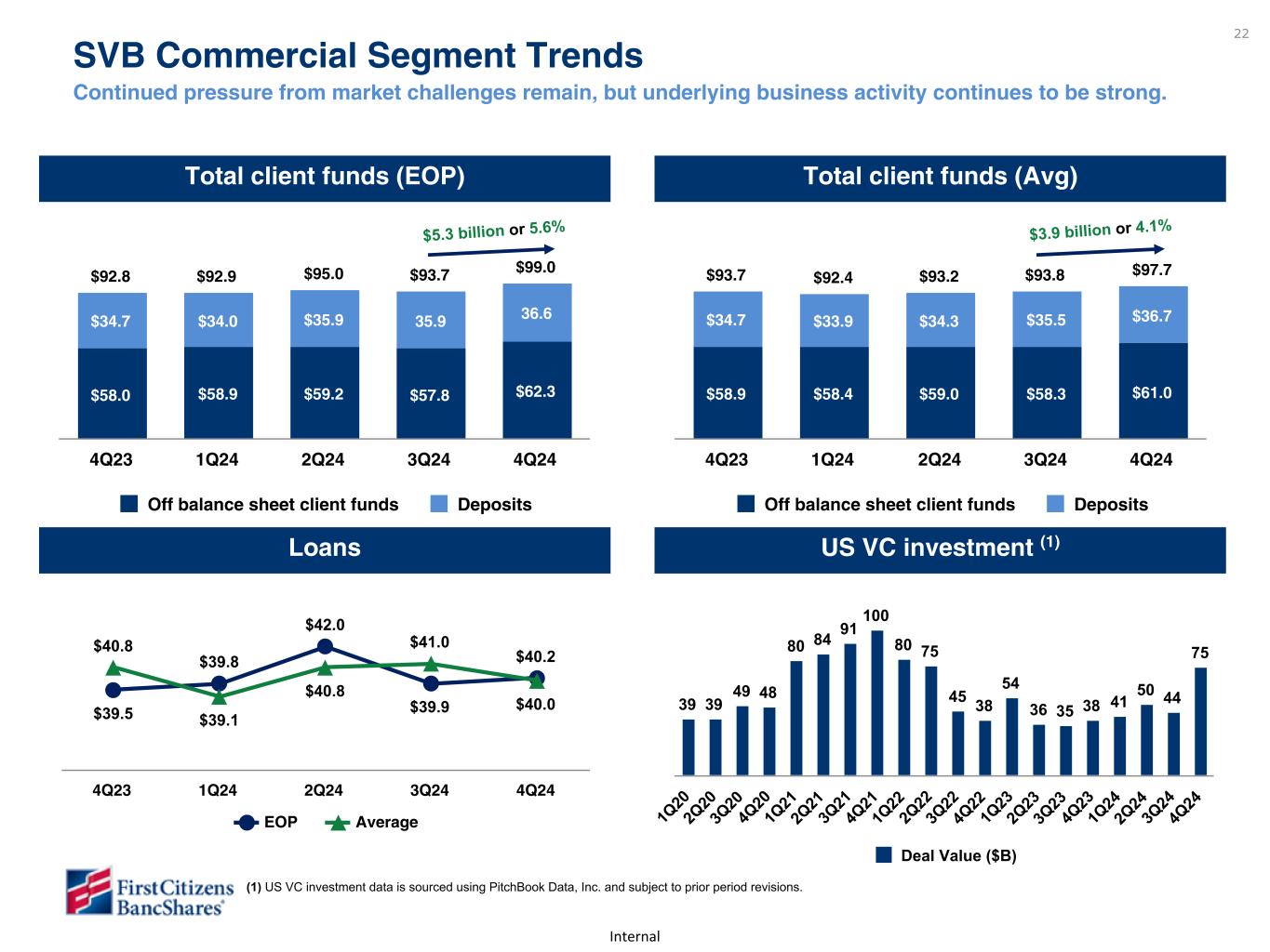 Internal 22 US VC investment (1)Loans Total client funds (Avg)Total client funds (EOP) SVB Commercial Segment Trends Continued pressure from market challenges remain, but underlying business activity continues to be strong. $92.8 $92.9 $95.0 $93.7 $99.0 $58.0 $58.9 $59.2 $57.8 $62.3 $34.7 $34.0 $35.9 35.9 36.6 Off balance sheet client funds Deposits 4Q23 1Q24 2Q24 3Q24 4Q24 $93.7 $92.4 $93.2 $93.8 $97.7 $58.9 $58.4 $59.0 $58.3 $61.0 $34.7 $33.9 $34.3 $35.5 $36.7 Off balance sheet client funds Deposits 4Q23 1Q24 2Q24 3Q24 4Q24 $39.5 $39.8 $42.0 $39.9 $40.2$40.8 $39.1 $40.8 $41.0 $40.0 EOP Average 4Q23 1Q24 2Q24 3Q24 4Q24 39 39 49 48 80 84 91 100 80 75 45 38 54 36 35 38 41 50 44 75 Deal Value ($B) 1Q 20 2Q 20 3Q 20 4Q 20 1Q 21 2Q 21 3Q 21 4Q 21 1Q 22 2Q 22 3Q 22 4Q 22 1Q 23 2Q 23 3Q 23 4Q 23 1Q 24 2Q 24 3Q 24 4Q 24 $5.3 billion or 5.6% $3.9 billion or 4.1% (1) US VC investment data is sourced using PitchBook Data, Inc. and subject to prior period revisions.