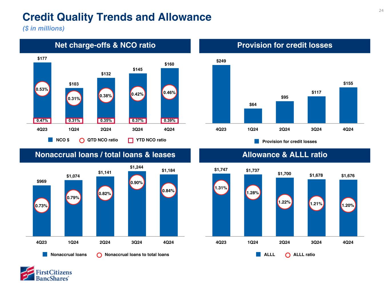 24 $249 $64 $95 $117 $155 Provision for credit losses 4Q23 1Q24 2Q24 3Q24 4Q24 Credit Quality Trends and Allowance ($ in millions) Net charge-offs & NCO ratio Provision for credit losses $177 $103 $132 $145 $160 0.53% 0.31% 0.38% 0.42% 0.46% NCO $ QTD NCO ratio YTD NCO ratio 4Q23 1Q24 2Q24 3Q24 4Q24 $969 $1,074 $1,141 $1,244 $1,184 0.73% 0.79% 0.82% 0.90% 0.84% Nonaccrual loans Nonaccrual loans to total loans 4Q23 1Q24 2Q24 3Q24 4Q24 Nonaccrual loans / total loans & leases Allowance & ALLL ratio $1,747 $1,737 $1,700 $1,678 $1,676 1.31% 1.28% 1.22% 1.21% 1.20% ALLL ALLL ratio 4Q23 1Q24 2Q24 3Q24 4Q24 0.39%0.47% 0.31% 0.35% 0.37% Nonaccrual loan balance and % to total loans numbers are draft pending final SVB Commercial segment data To be updated in subsequent draft
