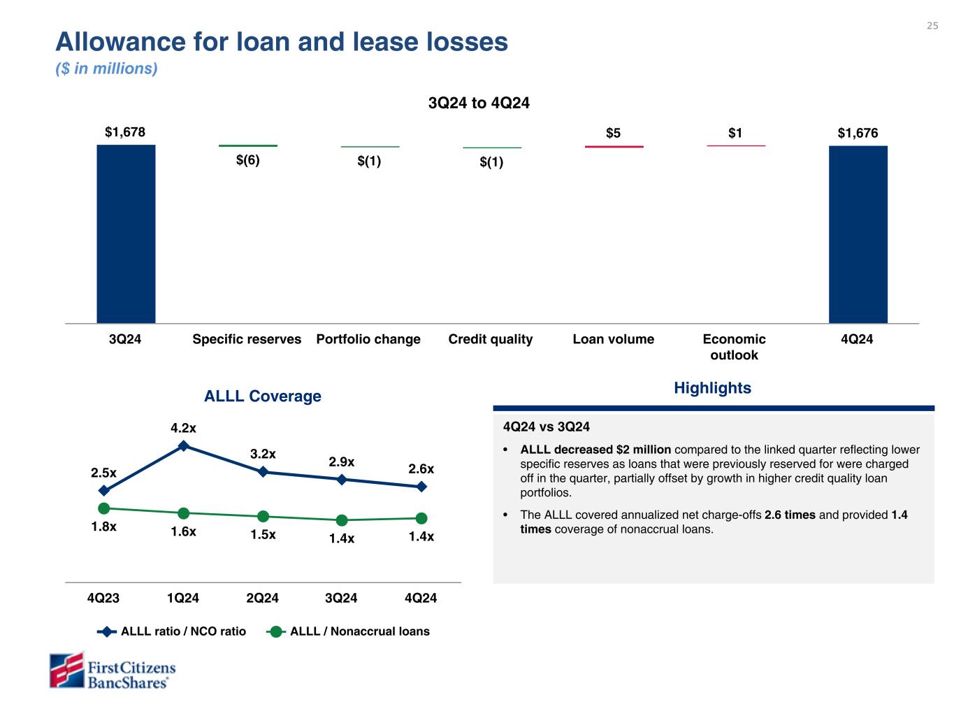 25 $1,678 $(6) $(1) $(1) $5 $1 $1,676 3Q24 Specific reserves Portfolio change Credit quality Loan volume Economic outlook 4Q24 Highlights 4Q24 vs 3Q24 • ALLL decreased $2 million compared to the linked quarter reflecting lower specific reserves as loans that were previously reserved for were charged off in the quarter, partially offset by growth in higher credit quality loan portfolios. • The ALLL covered annualized net charge-offs 2.6 times and provided 1.4 times coverage of nonaccrual loans. ALLL Coverage 2.5x 4.2x 3.2x 2.9x 2.6x 1.8x 1.6x 1.5x 1.4x 1.4x ALLL ratio / NCO ratio ALLL / Nonaccrual loans 4Q23 1Q24 2Q24 3Q24 4Q24 3Q24 to 4Q24 Allowance for loan and lease losses ($ in millions) Please do not review - data still being finalized. To be provided in subsequent draft. To be updated in subsequent draft